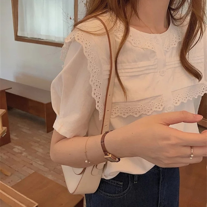 봄과 여름 2023 새로운 레이스 칼라 셔츠 여성용 반팔 우아한 부드러운 디자인 센스 탑베이스 화이트 셔츠 여성용스토어 가기