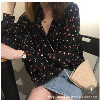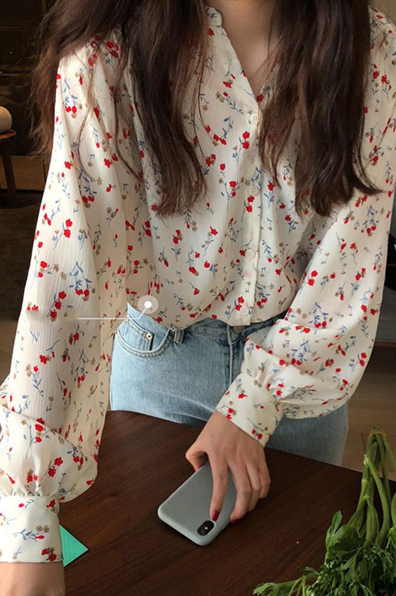2023 봄과 가을 꽃 탑 느슨한 한국 스타일 드레이핑 쉬폰 V-넥 캐주얼 긴팔 셔츠 여성 디자인 셔츠스토어 가기
