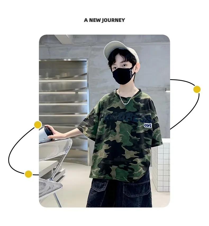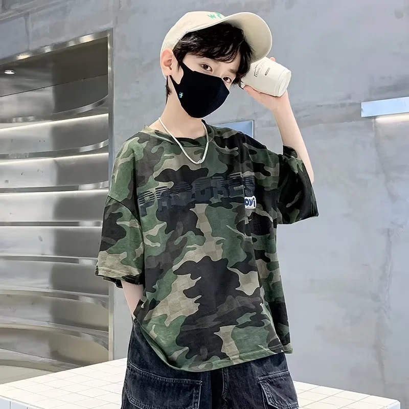 남아 여름 위장 반팔 티셔츠 2023 새로운 스타일 미드 빅 어린이 여름 어린이 반팔 얇은 탑 캐주얼 트렌디 티셔츠스토어 가기