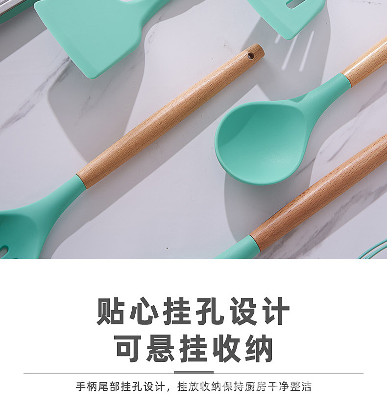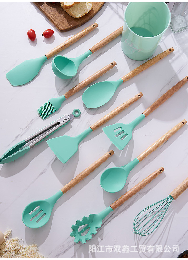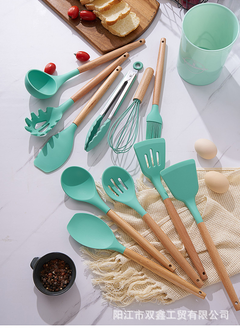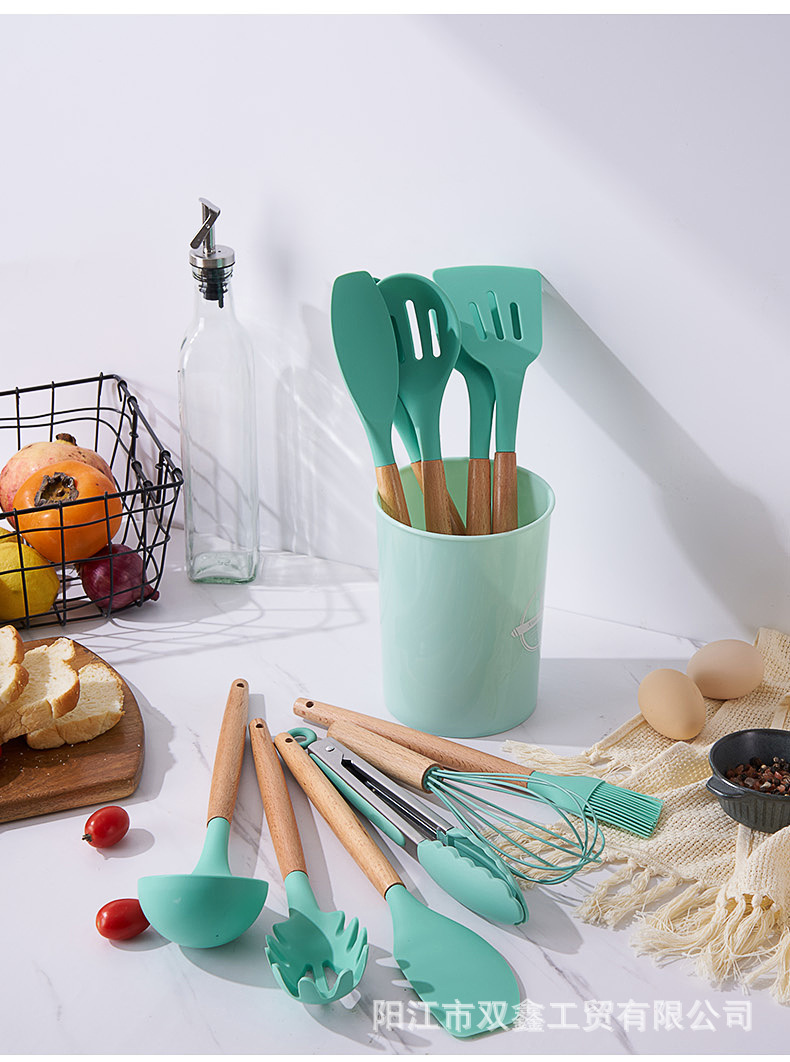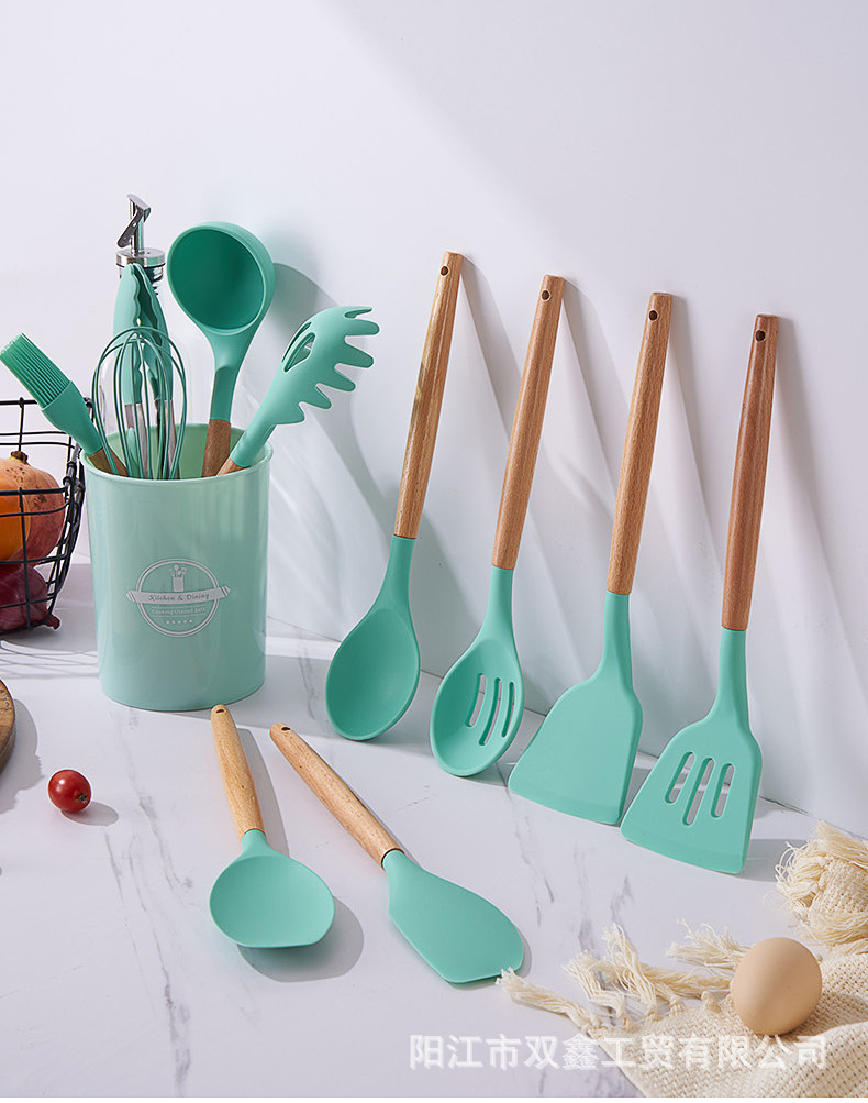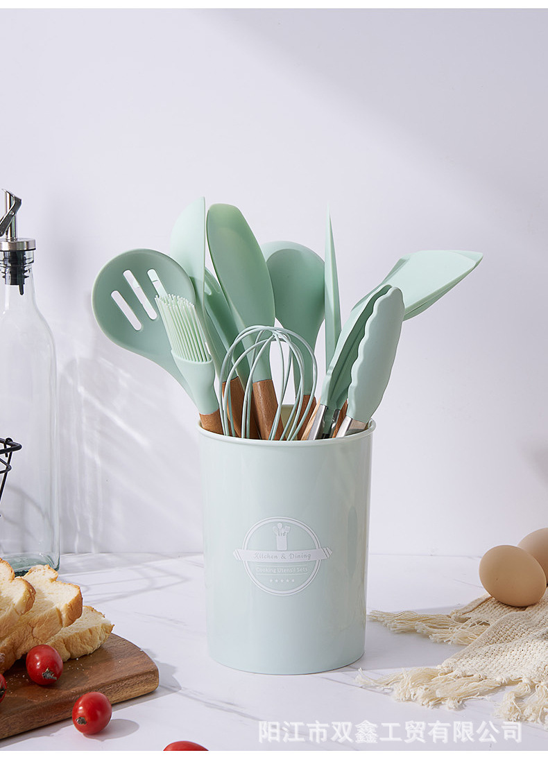 크로스보더 키친 쿠킹 뉴 12 피스 세트 노르딕 그린 나무 손잡이 실리콘 수프 스푼 삽 주방용품 보관 배럴 컬러 박스 세트스토어 가기