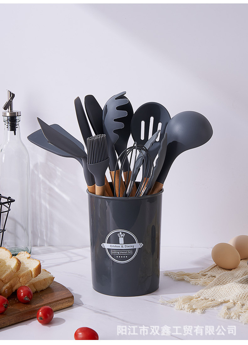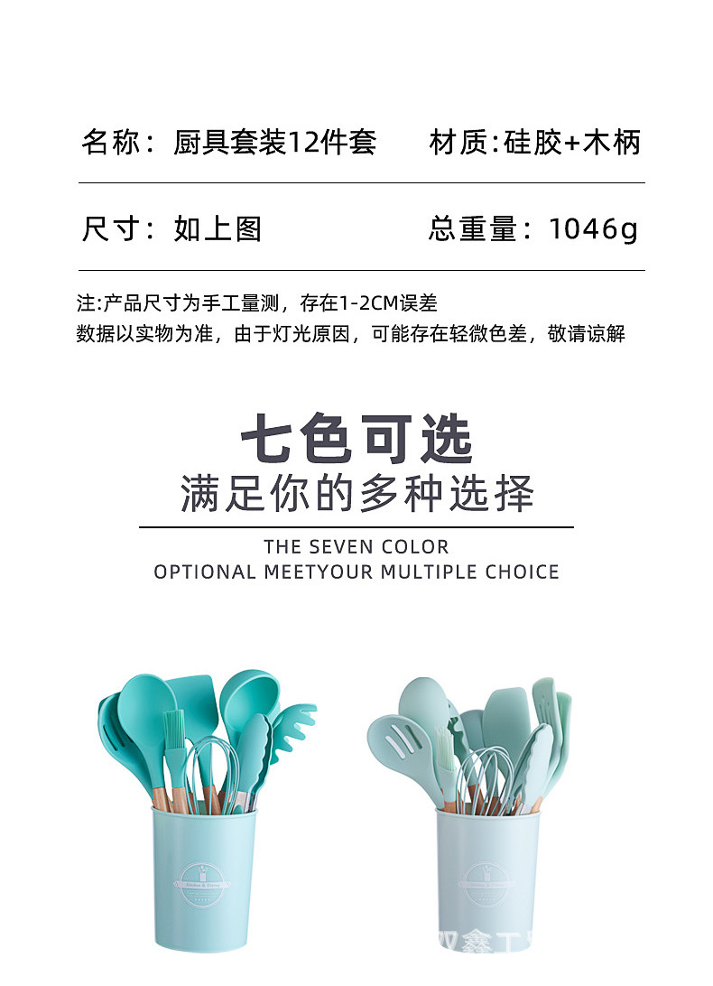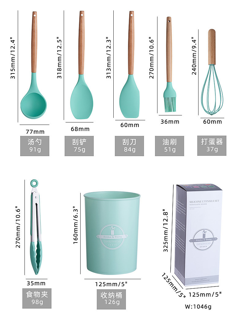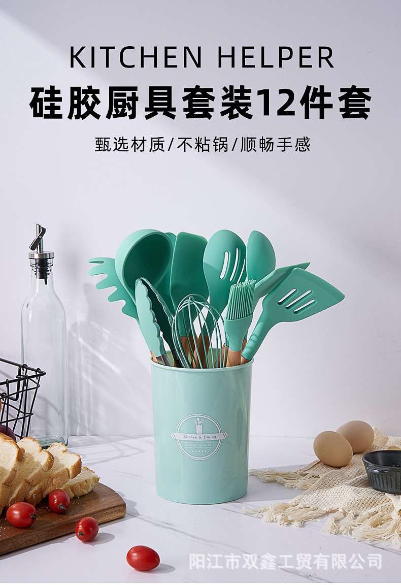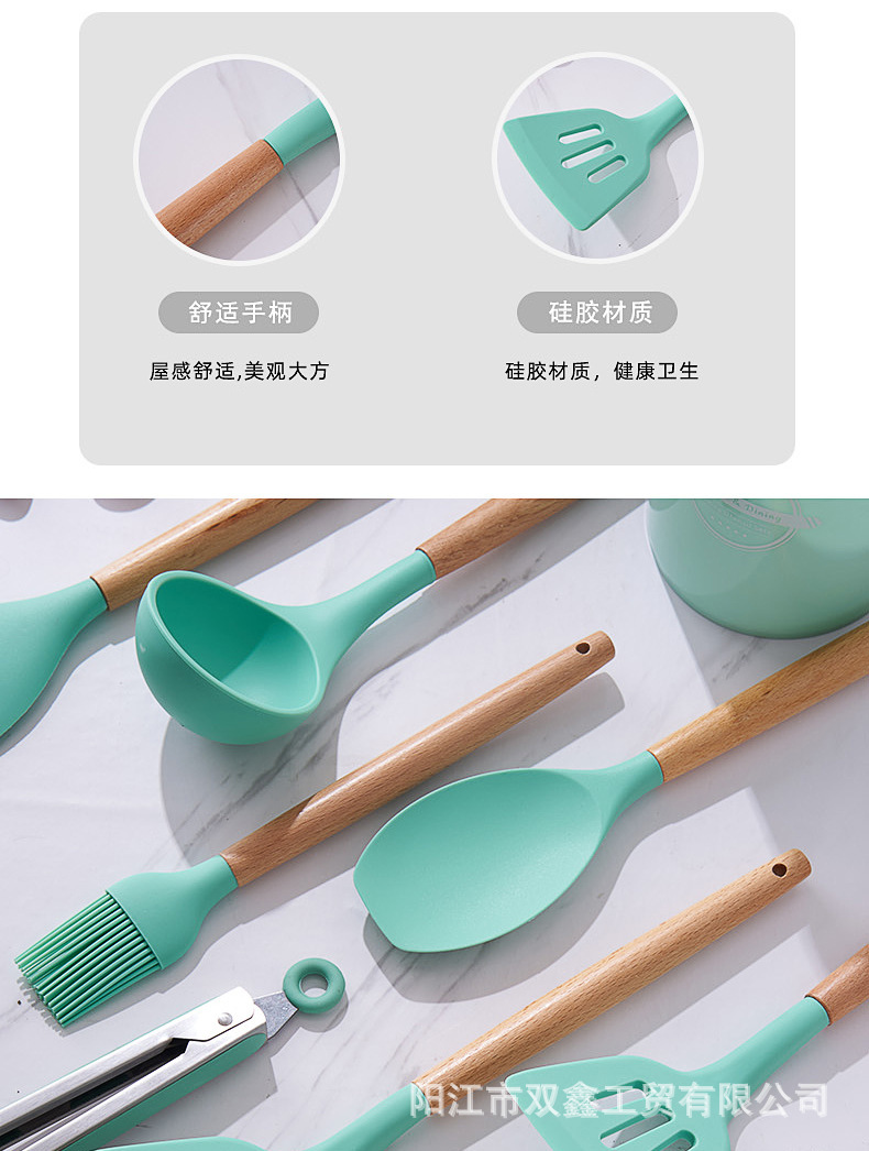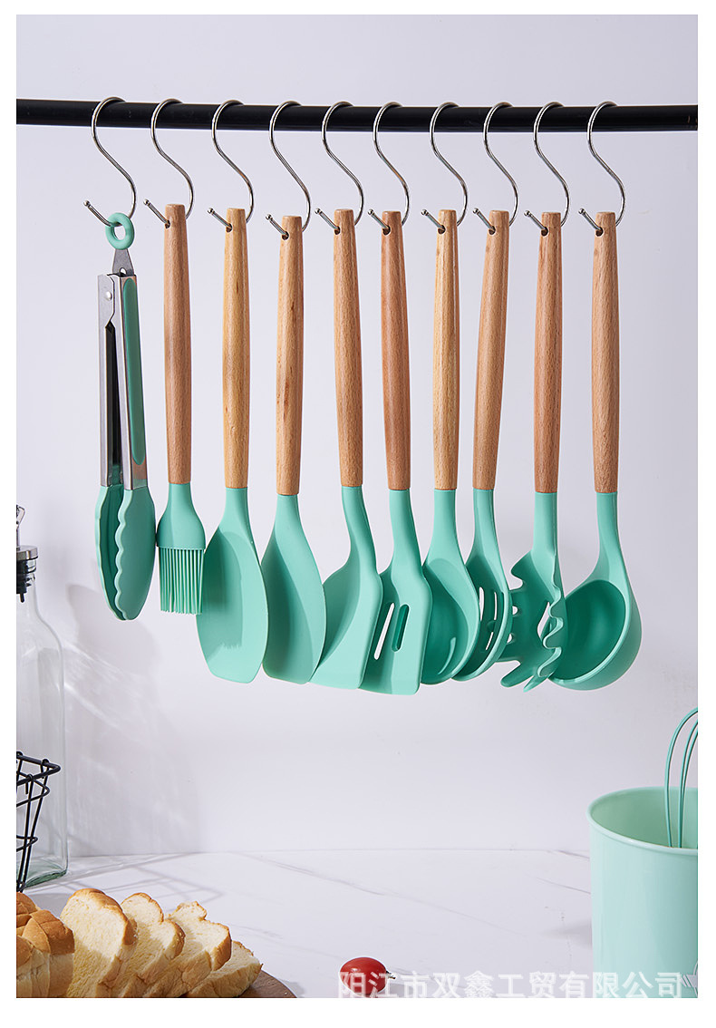 크로스보더 키친 쿠킹 뉴 12 피스 세트 노르딕 그린 나무 손잡이 실리콘 수프 스푼 삽 주방용품 보관 배럴 컬러 박스 세트스토어 가기