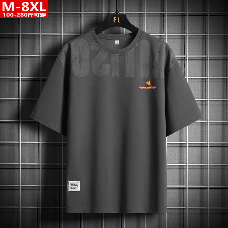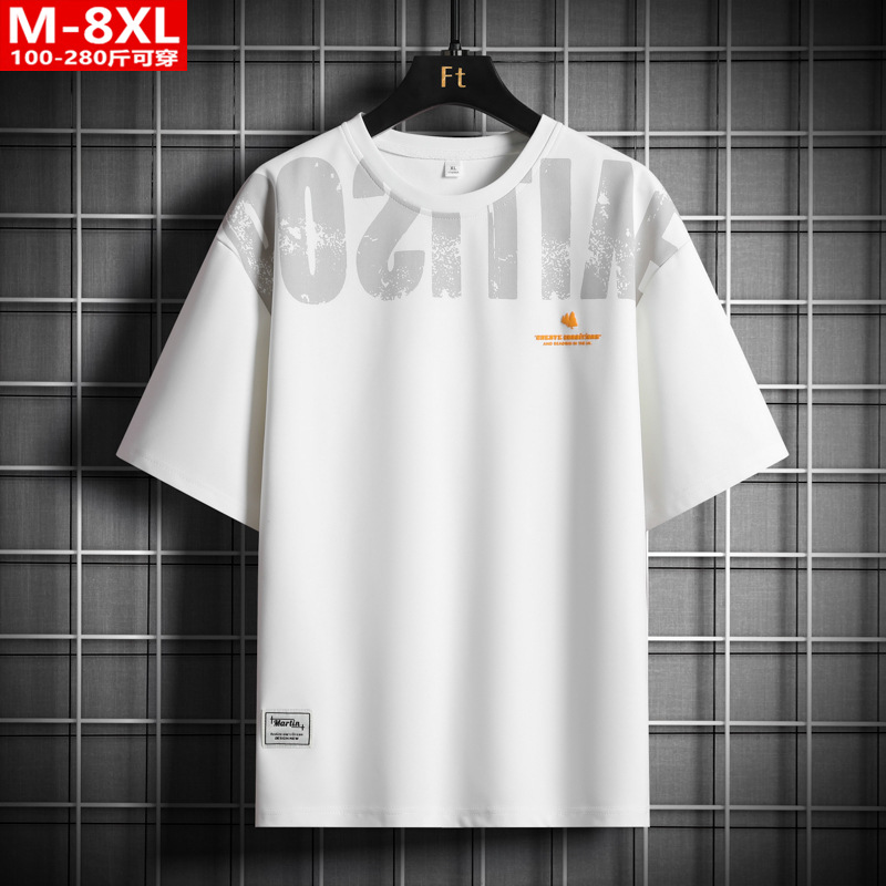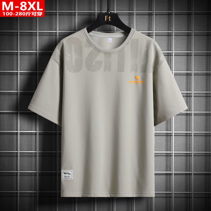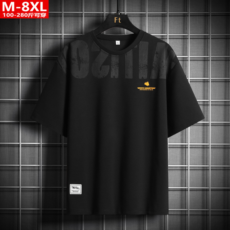 여름 트렌디 한 홍콩 스타일 통통한 남성용 프린트 라운드 넥 반팔 티셔츠 플러스 대형 느슨한 단색 티셔츠스토어 가기