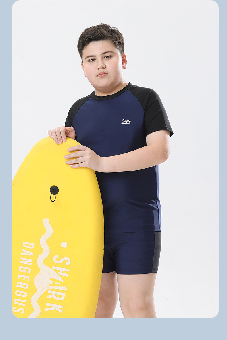 소년 수영복 2025 새로운 대형 솔리드 컬러 스플릿 여름 중형 및 대형 아동 수영복 느슨한 뚱뚱한 아동 수영복 도매