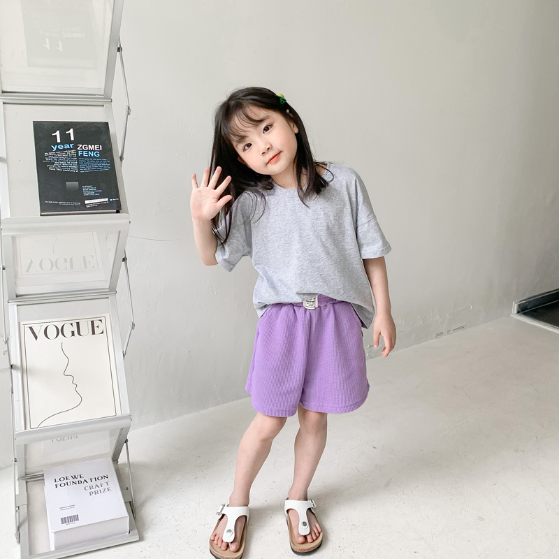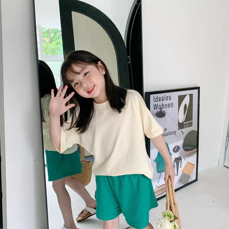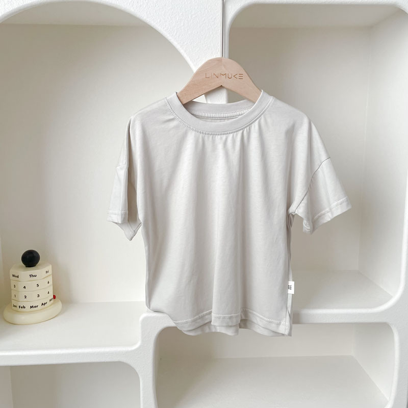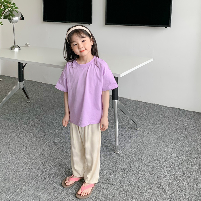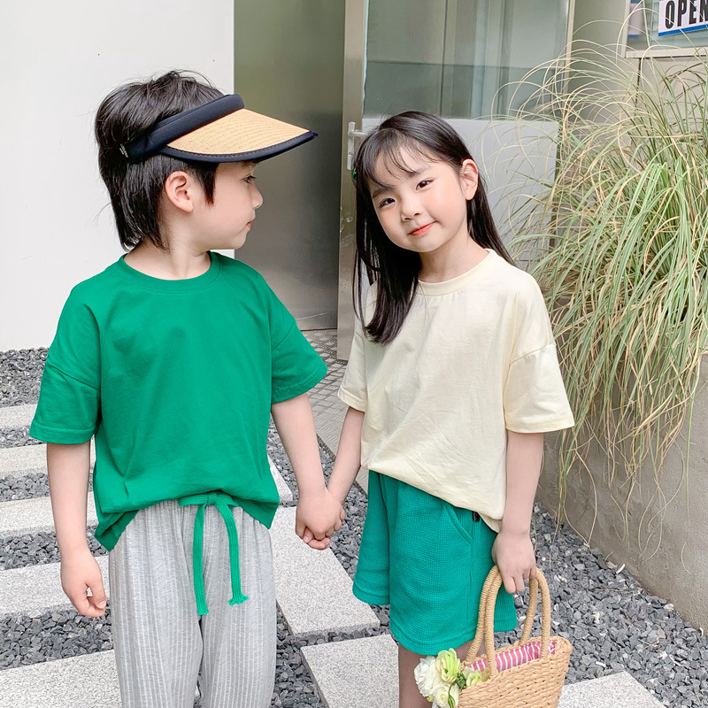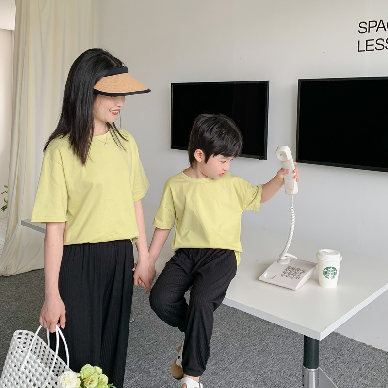 2024 새로운 여름 어린이 드롭 어깨 느슨한 반팔 소년과 소녀 솔리드 컬러 부모-자식 다목적 코튼 티셔츠 탑스토어 가기