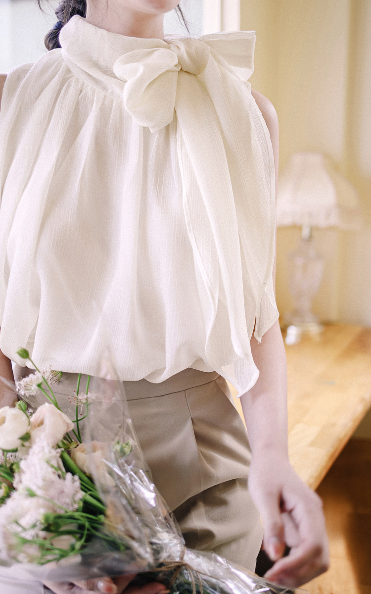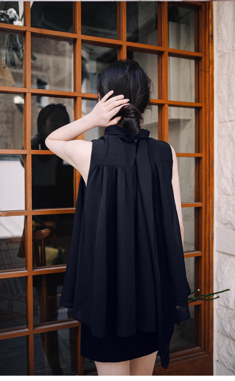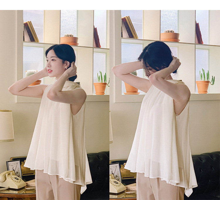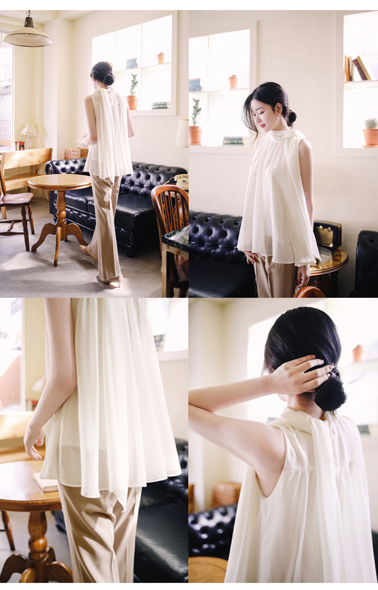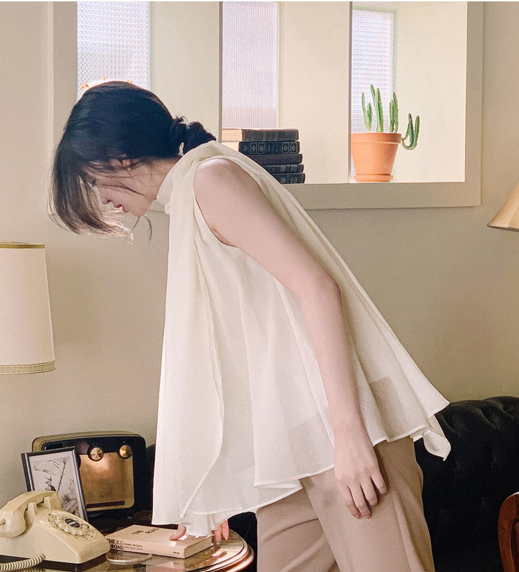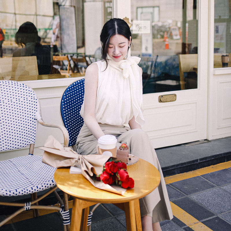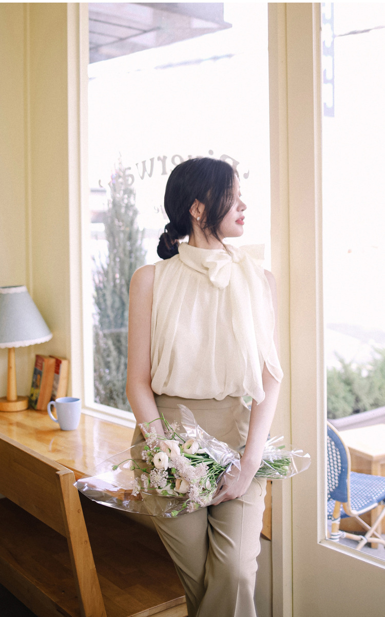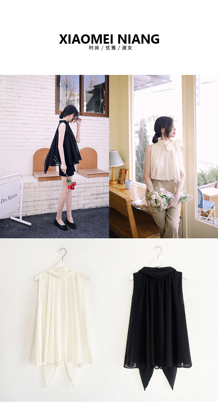 민소매 쉬폰 셔츠 여성용 2023 여름 새로운 젠틀 스타일 느슨한 우아한 탑 프렌치 보우 리본 셔츠스토어 가기