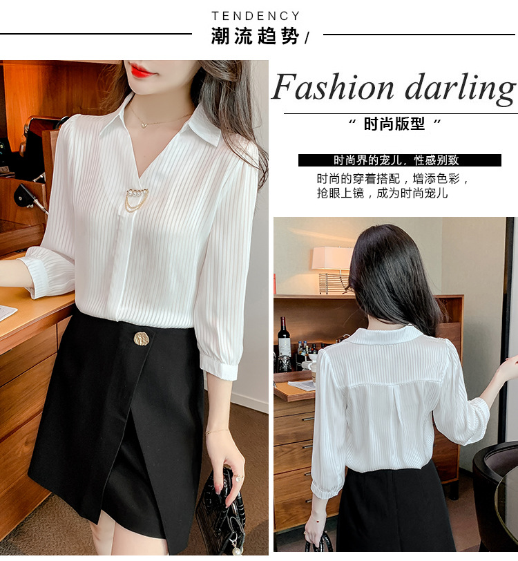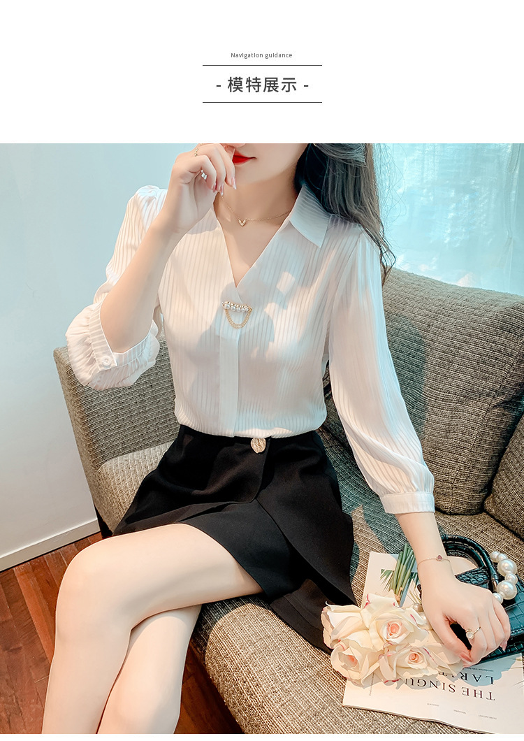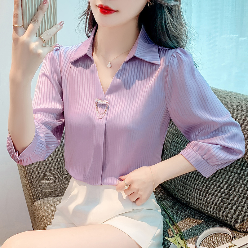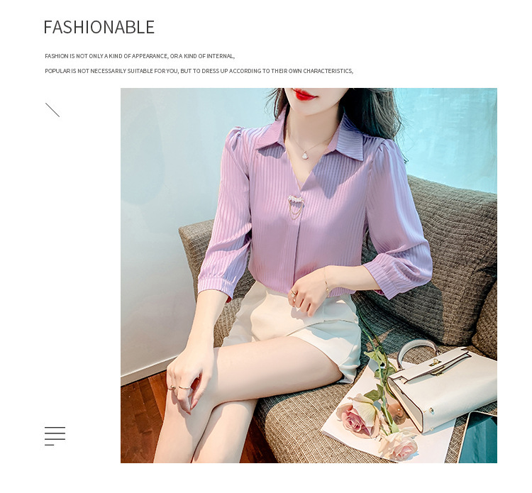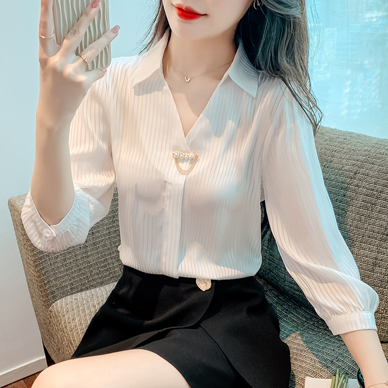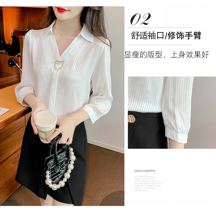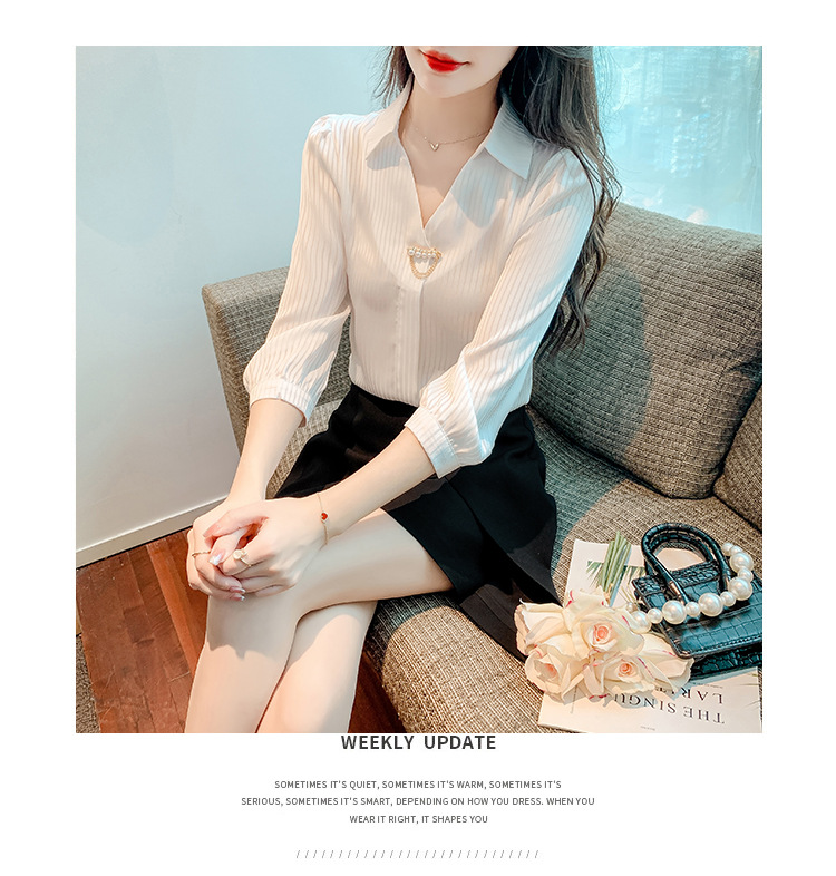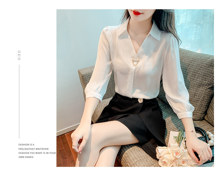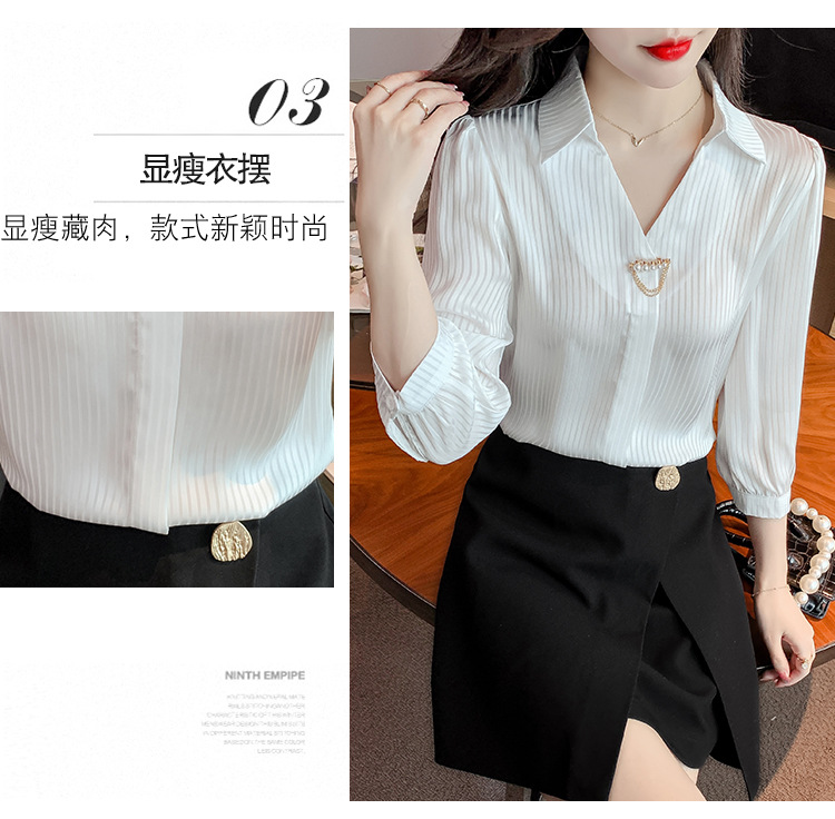 재고 2023 봄 뉴 스위트 브이넥 세븐슬리브 셔츠 여성용 디자인 센스 올매치 쉬폰 다크 패턴 탑 트렌디스토어 가기