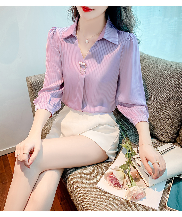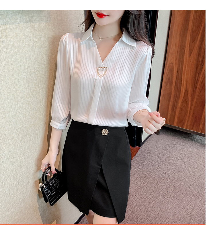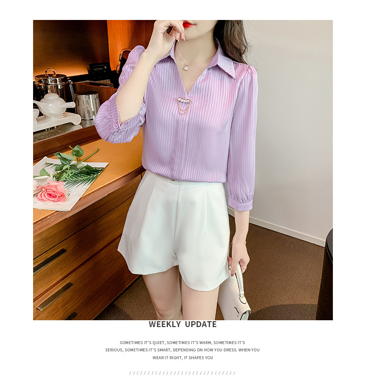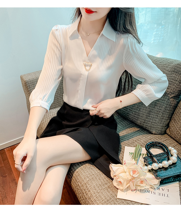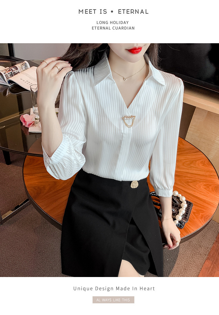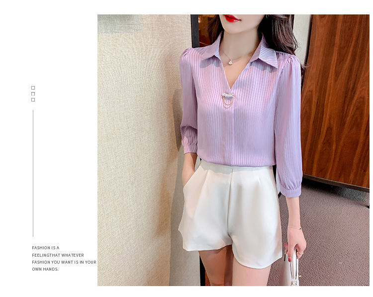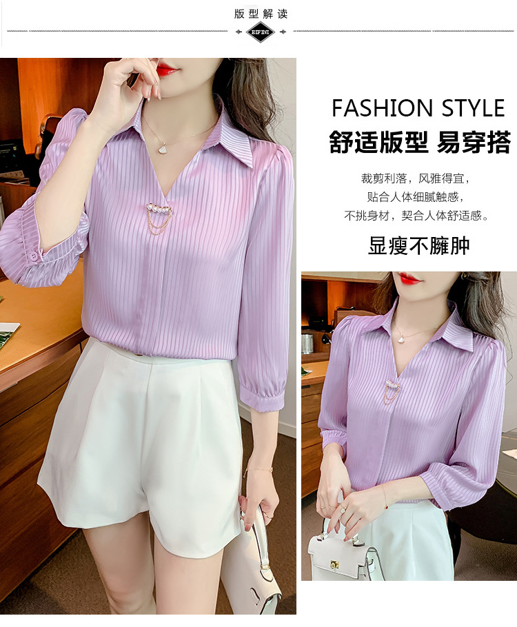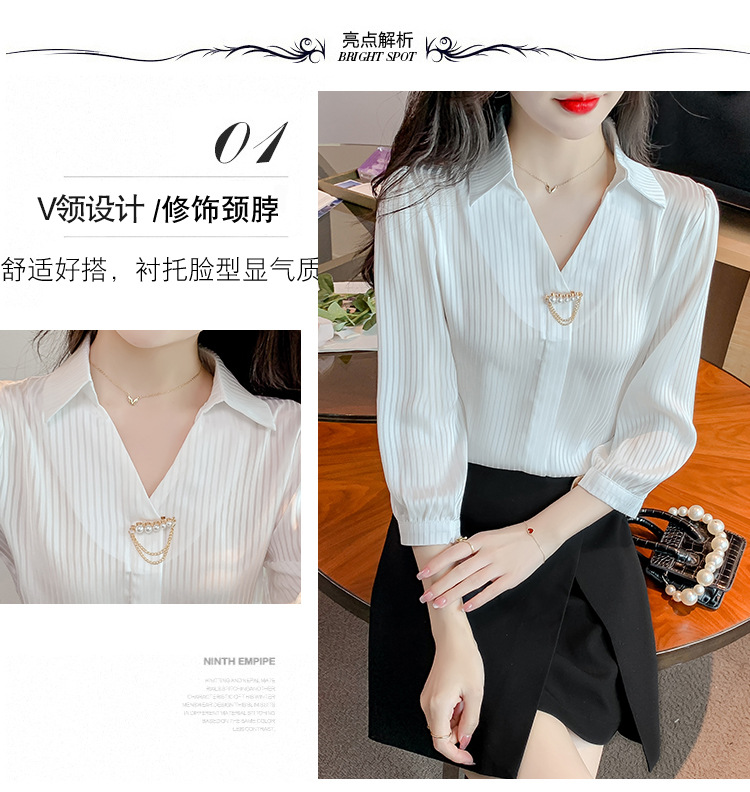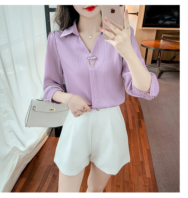 재고 2023 봄 뉴 스위트 브이넥 세븐슬리브 셔츠 여성용 디자인 센스 올매치 쉬폰 다크 패턴 탑 트렌디스토어 가기