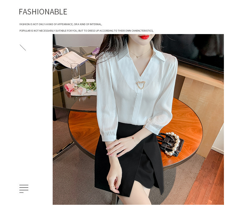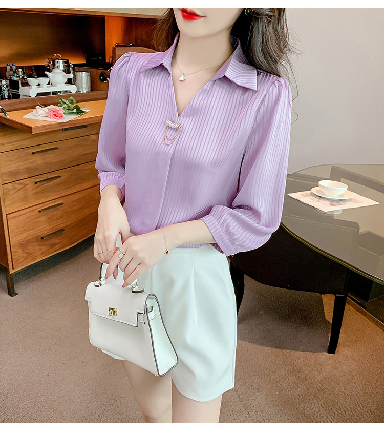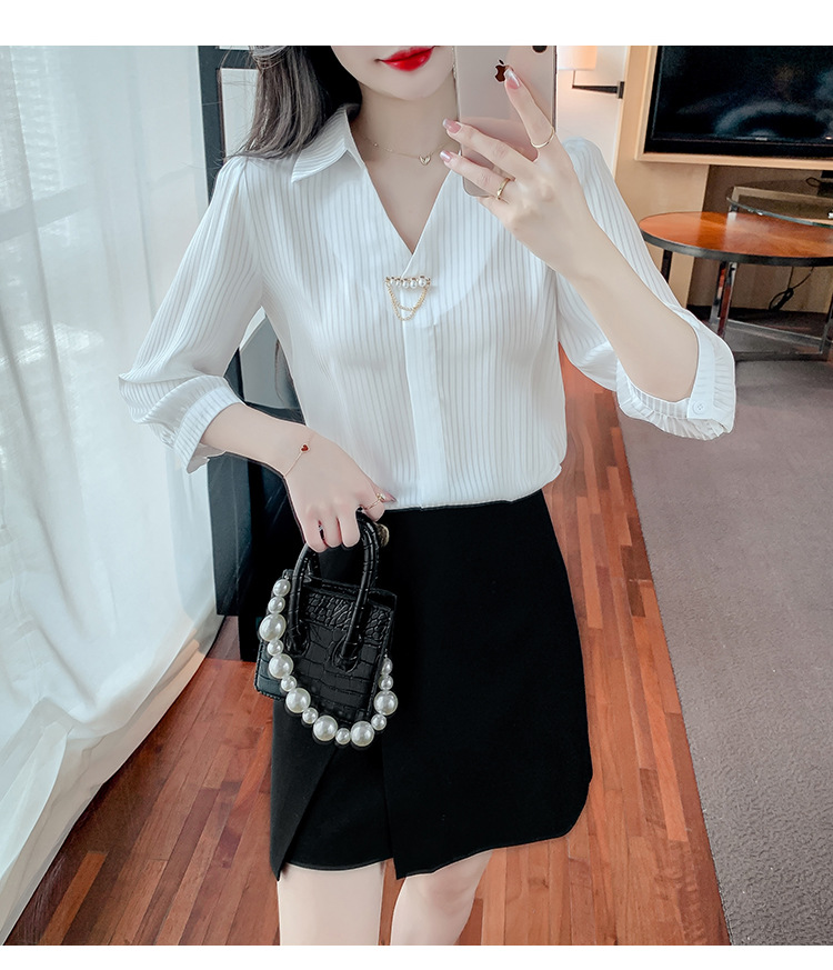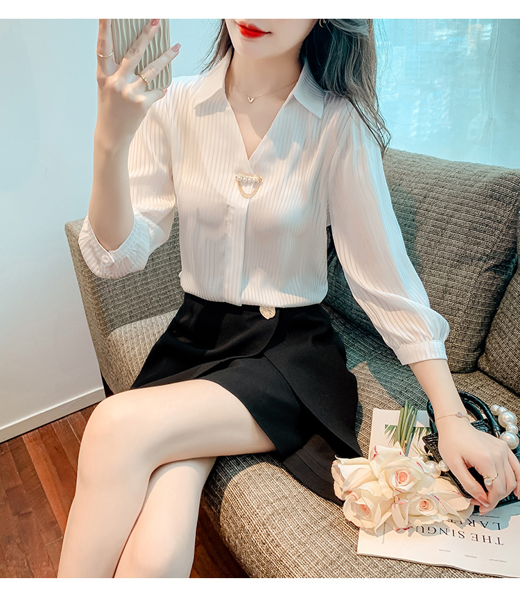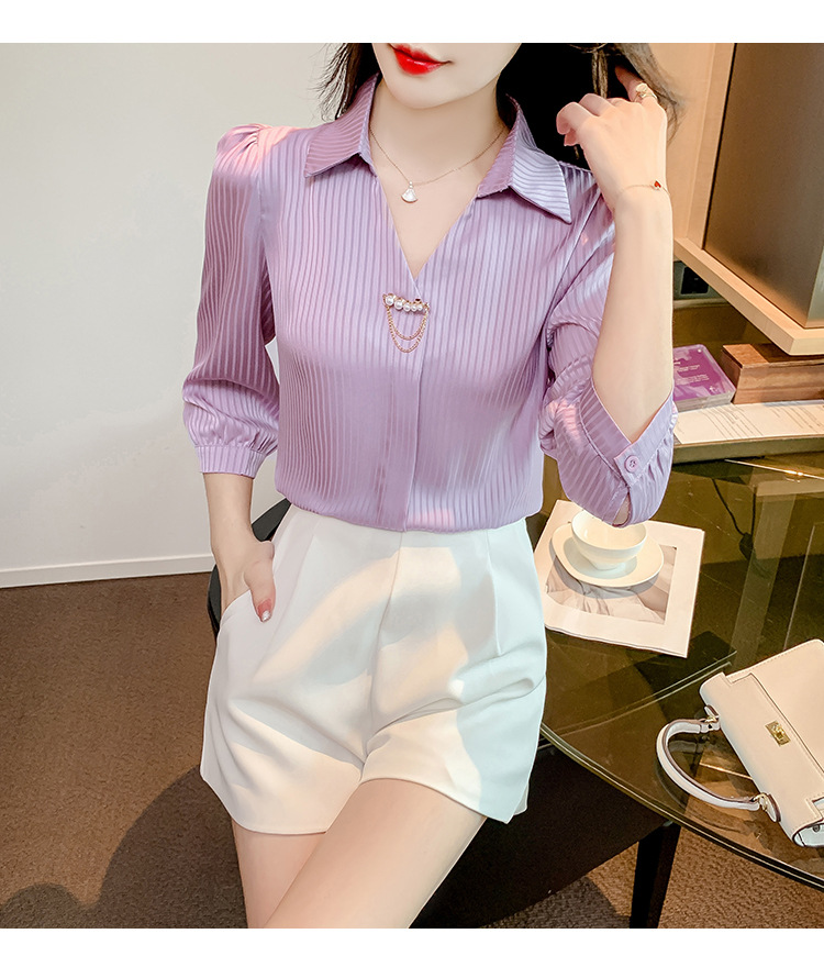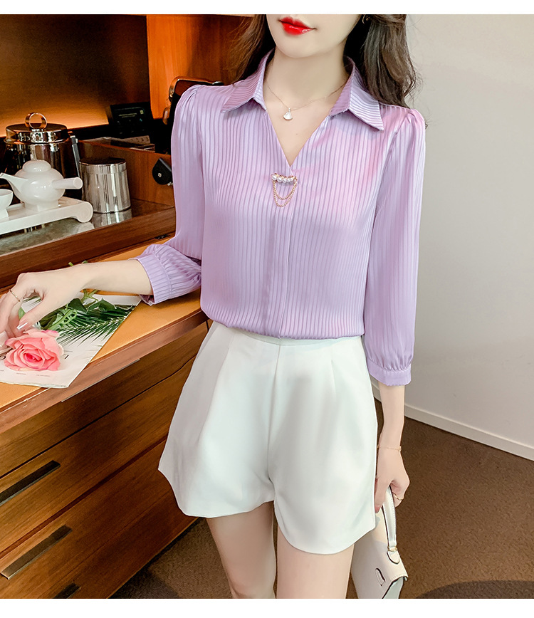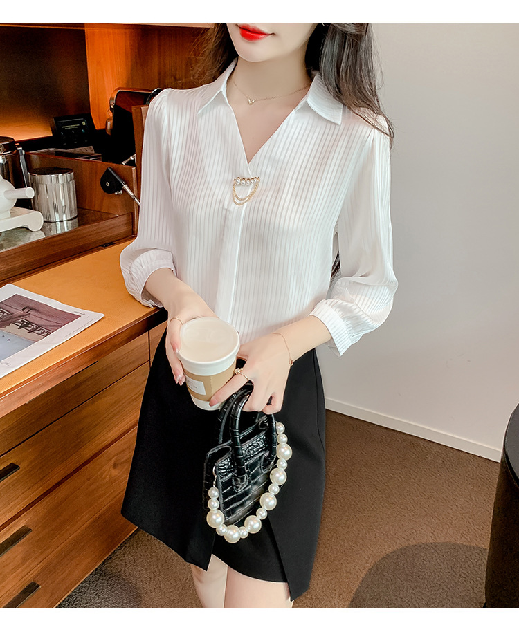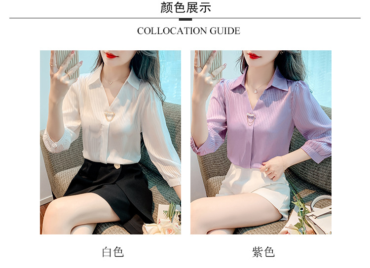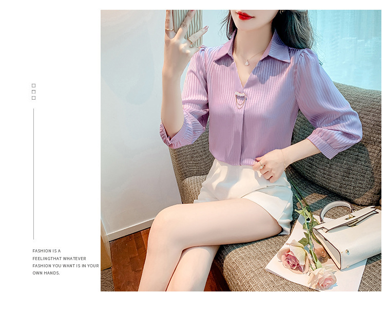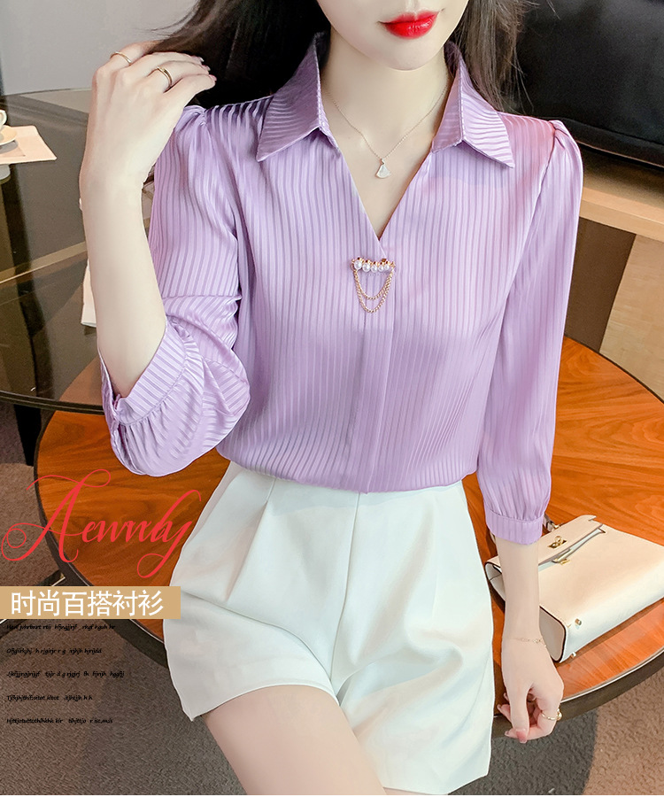 재고 2023 봄 뉴 스위트 브이넥 세븐슬리브 셔츠 여성용 디자인 센스 올매치 쉬폰 다크 패턴 탑 트렌디스토어 가기