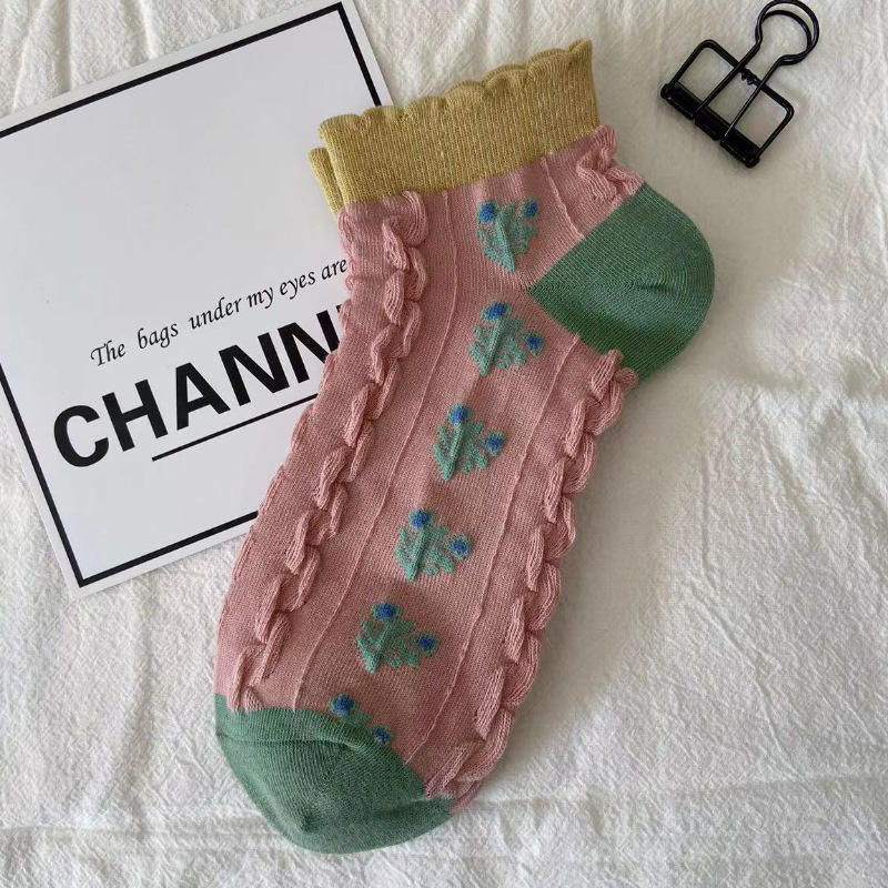 빈티지 양각 꽃 양말 여성용 짧은 양말 봄과 여름 얇은 꽃 유행 일본식 로우 탑 얕은 입 보이지 않는 보트 양말