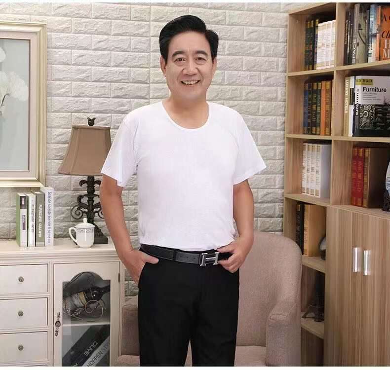 중년 노인 순면 조끼 티셔츠 라운드 넥 티셔츠 여름 구식 통기성 땀 흡수 순백색 빗질 면