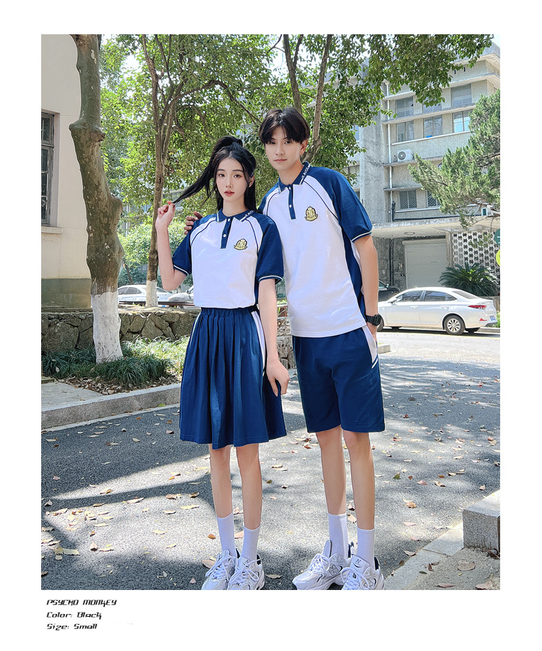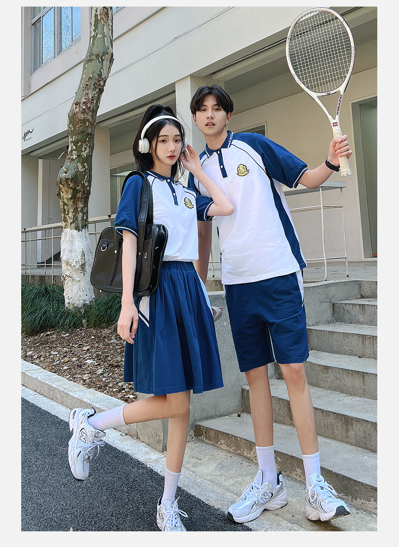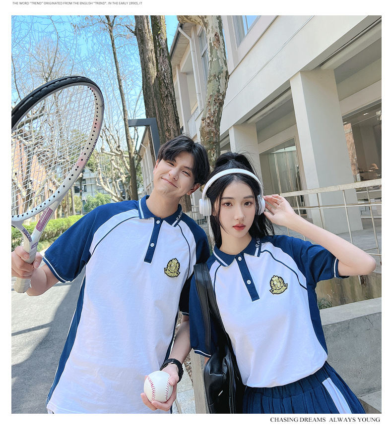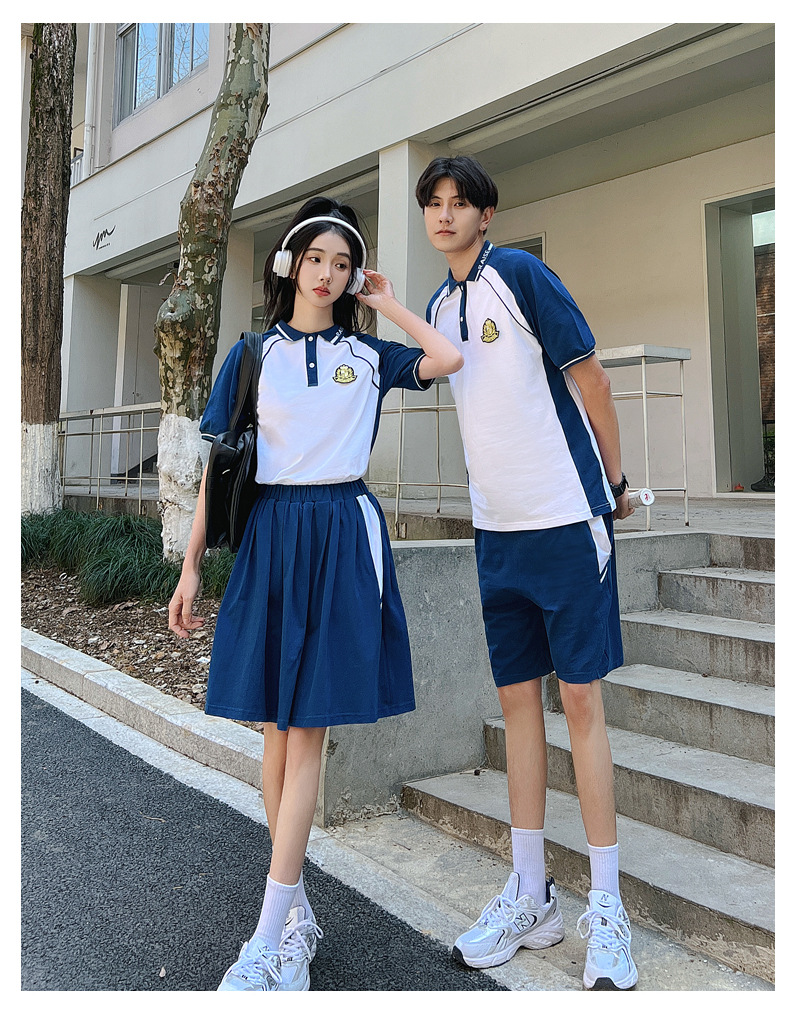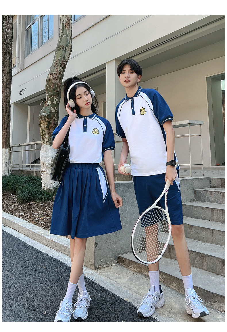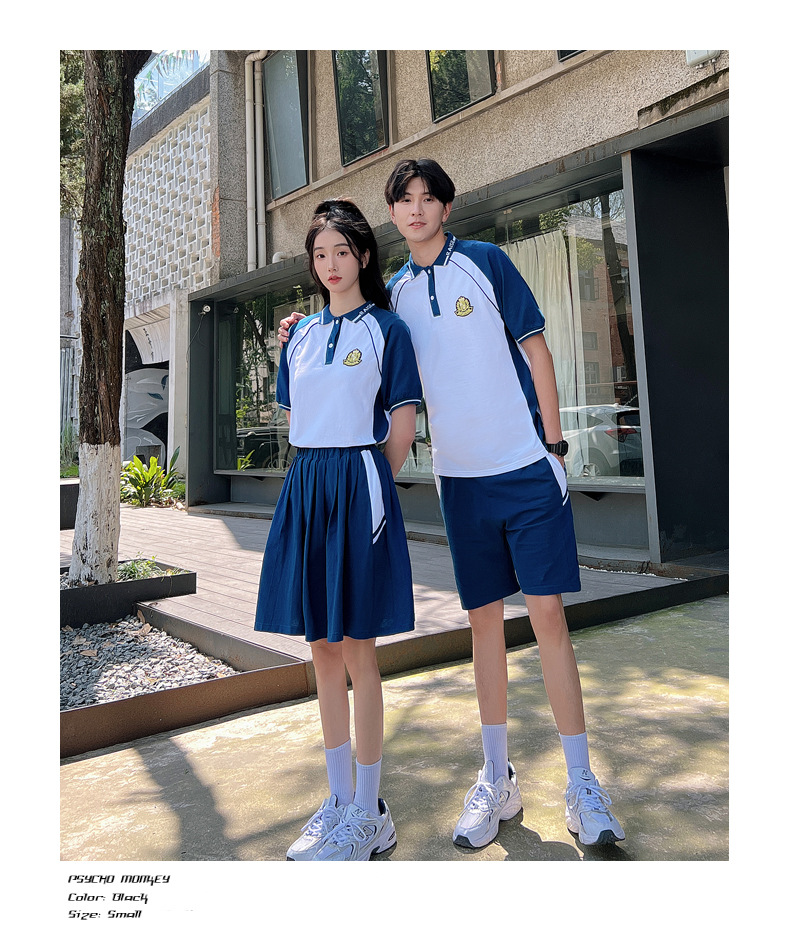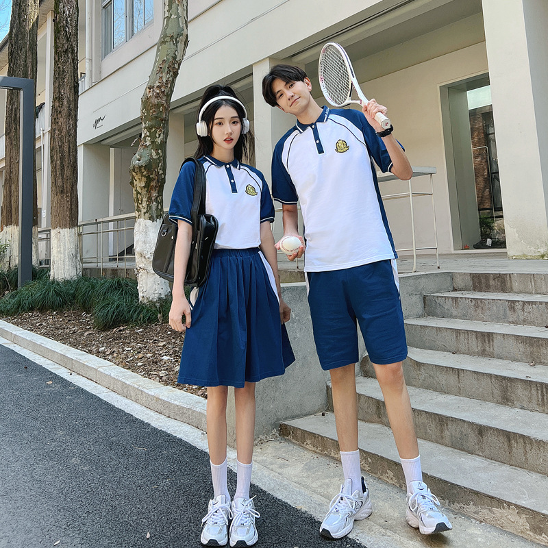 2023 여름 커플 의류 아카데미 스타일 남자와 여자의 반팔 티셔츠 스커트 세트 아카데미 스타일 클래스 의류스토어 가기