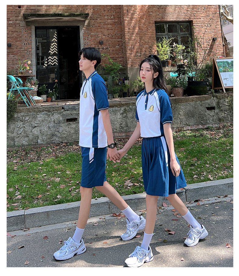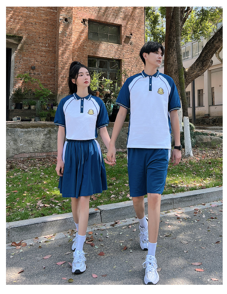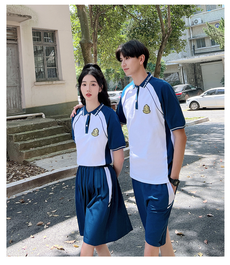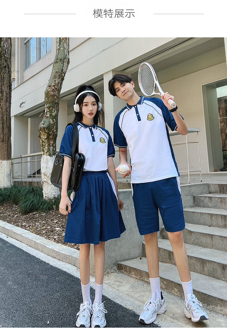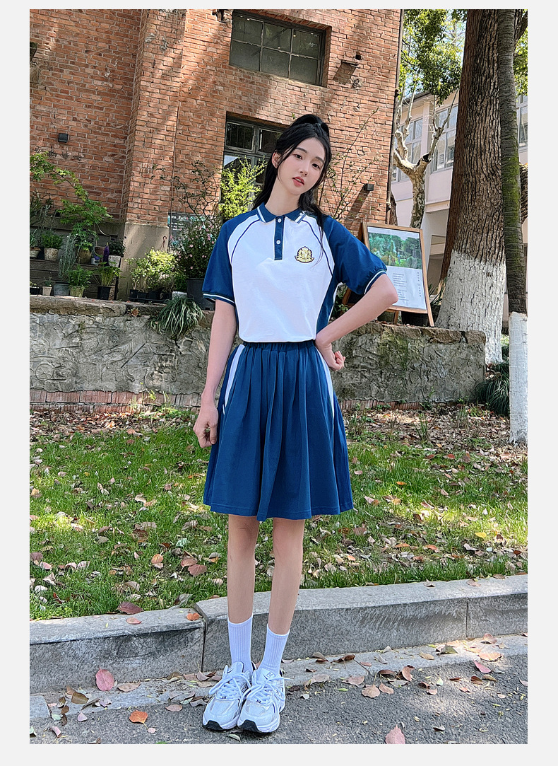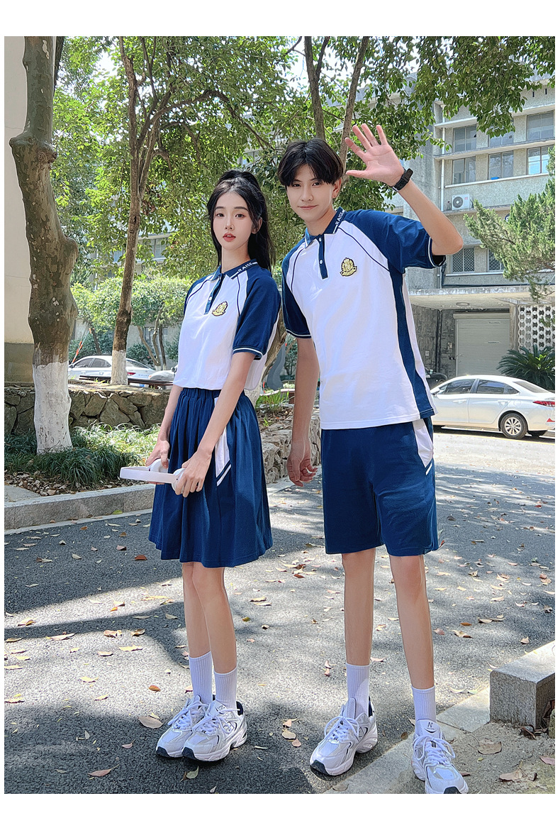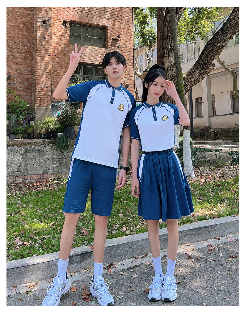 2023 여름 커플 의류 아카데미 스타일 남자와 여자의 반팔 티셔츠 스커트 세트 아카데미 스타일 클래스 의류스토어 가기