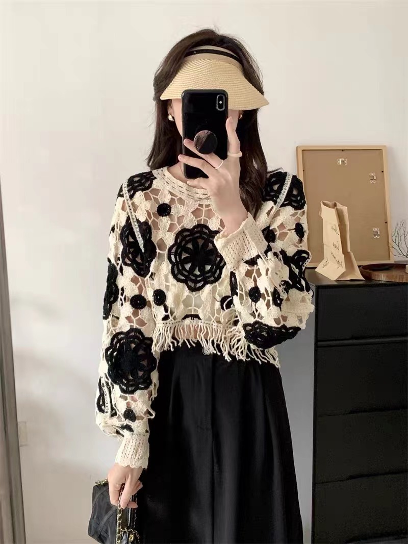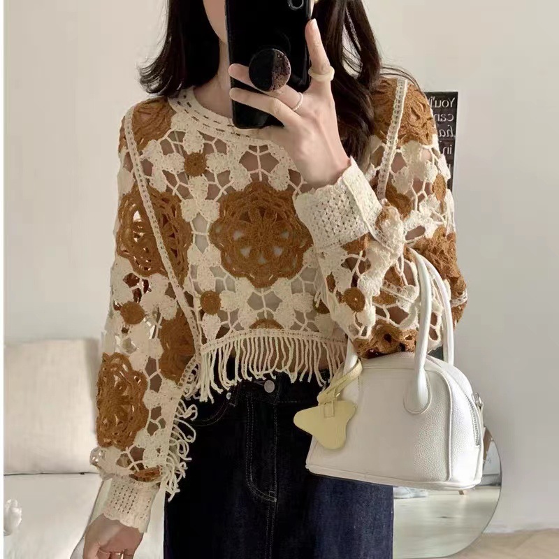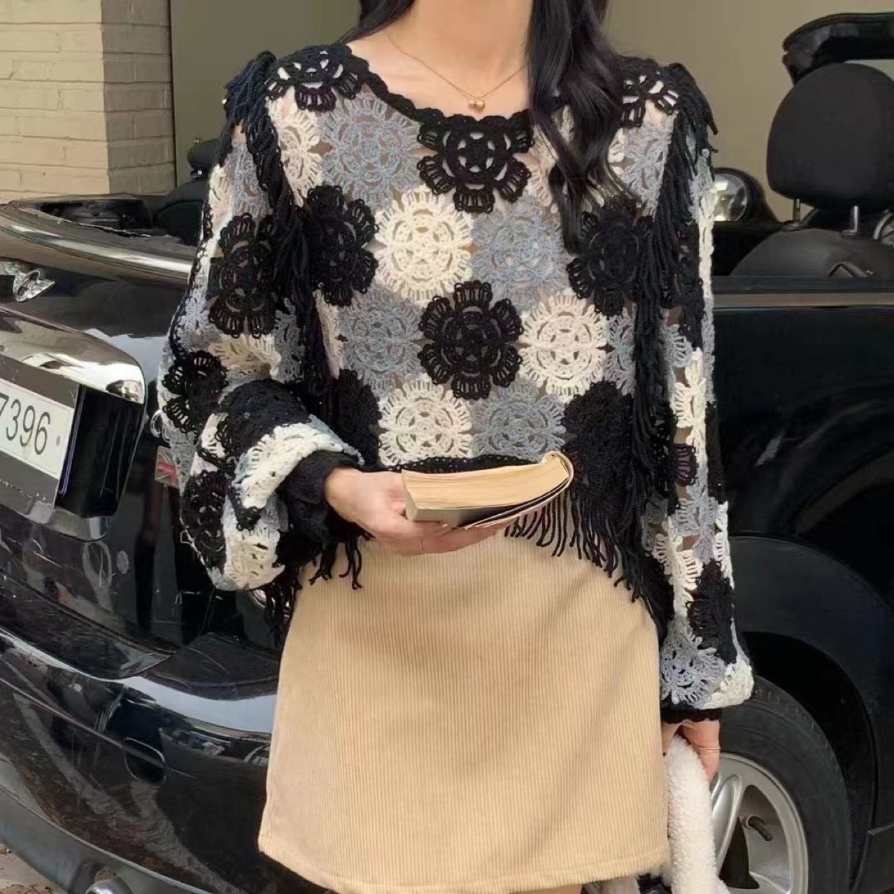 봄철 프린지 니트웨어, 컷아웃 배색 꽃무늬 긴팔 크로셰 풀오버 여성용 루즈핏 상의