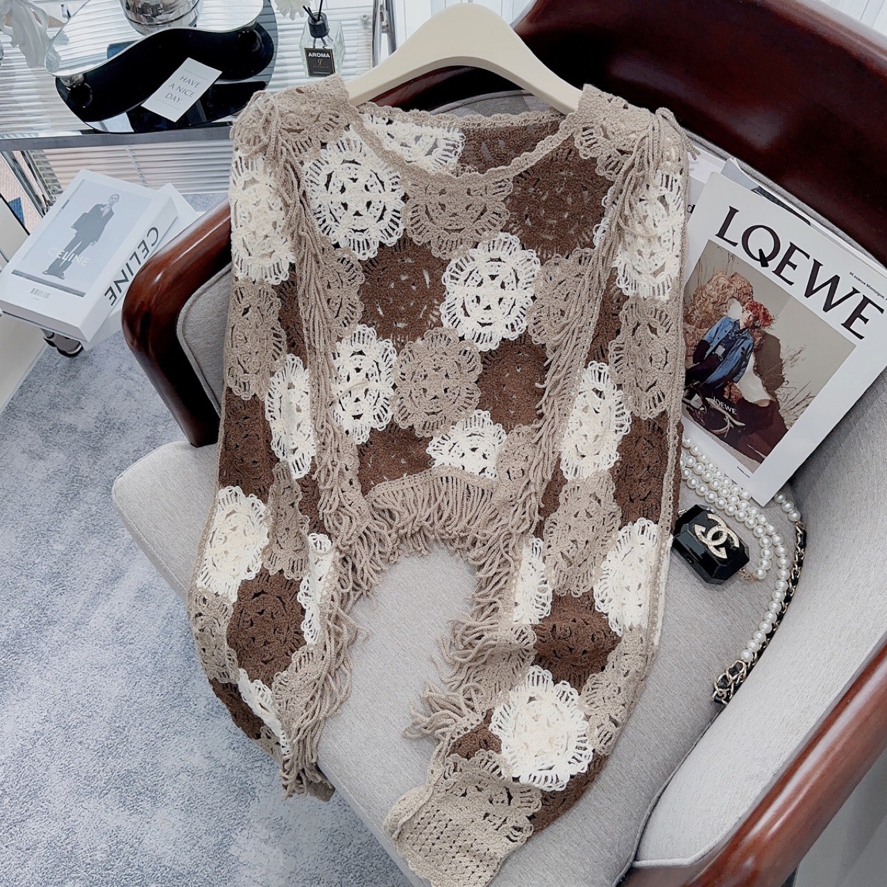 봄철 프린지 니트웨어, 컷아웃 배색 꽃무늬 긴팔 크로셰 풀오버 여성용 루즈핏 상의스토어 가기