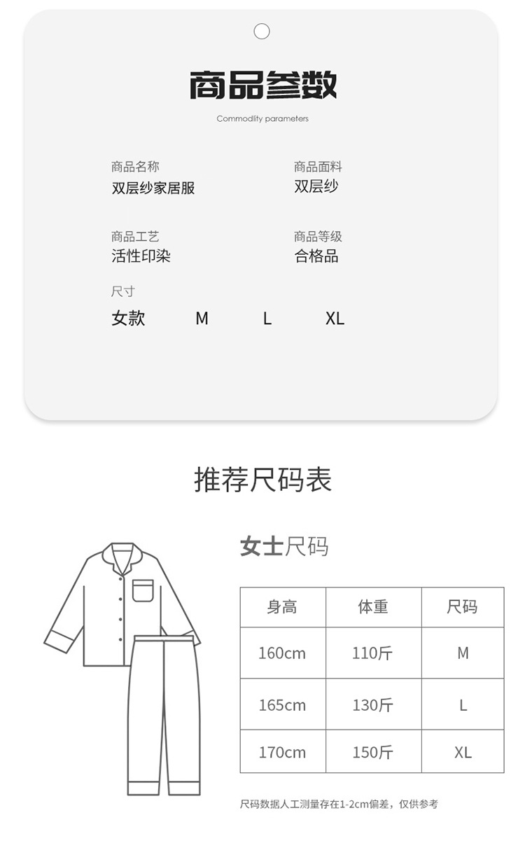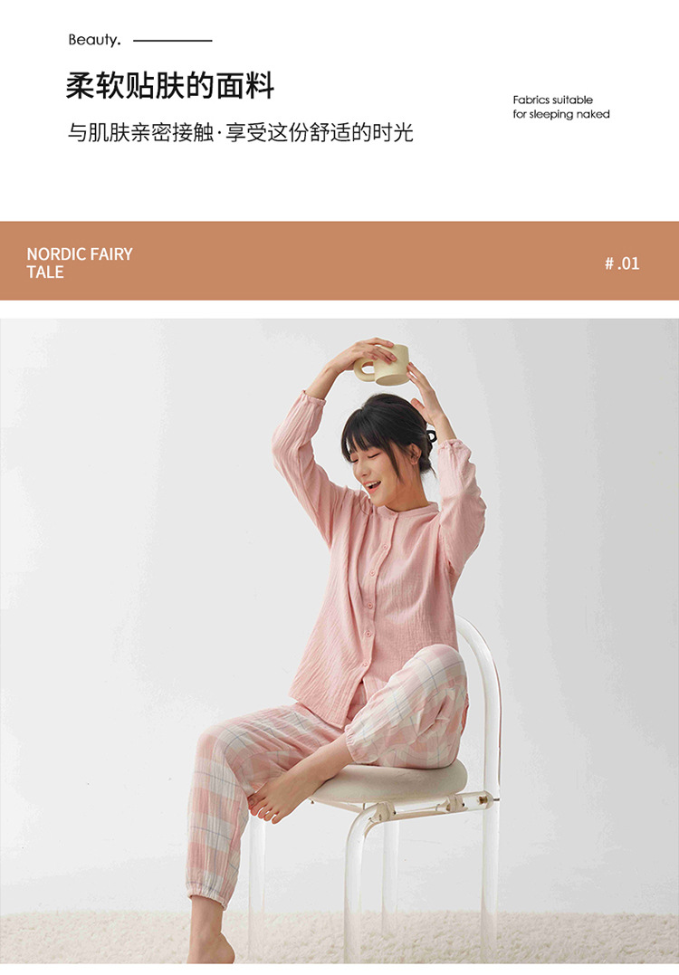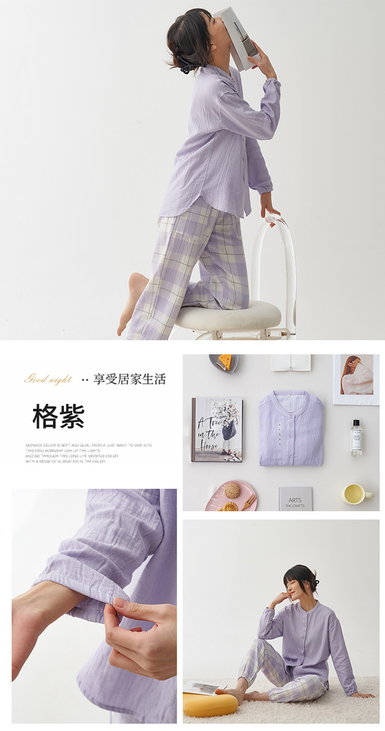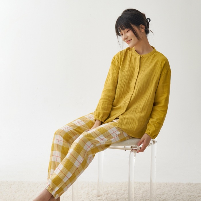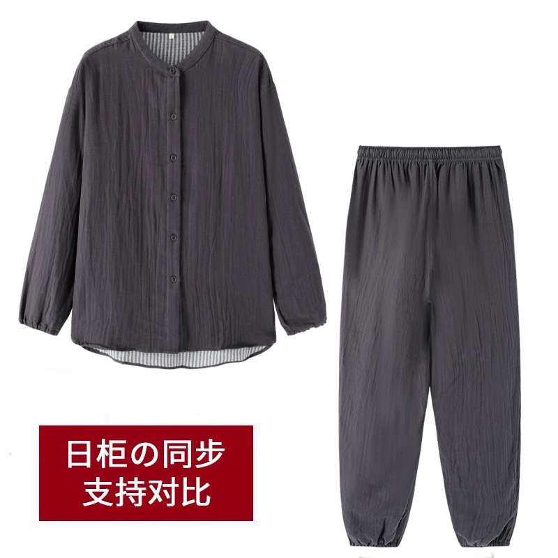 MUJI 일본식 순면 2 층 원사 잠옷 여성용 봄과 여름 순면 남성 가정복 커플 파자마 바지 세트스토어 가기