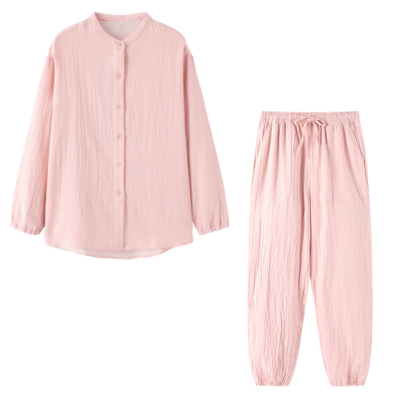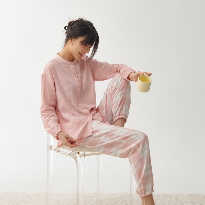 MUJI 일본식 순면 2 층 원사 잠옷 여성용 봄과 여름 순면 남성 가정복 커플 파자마 바지 세트