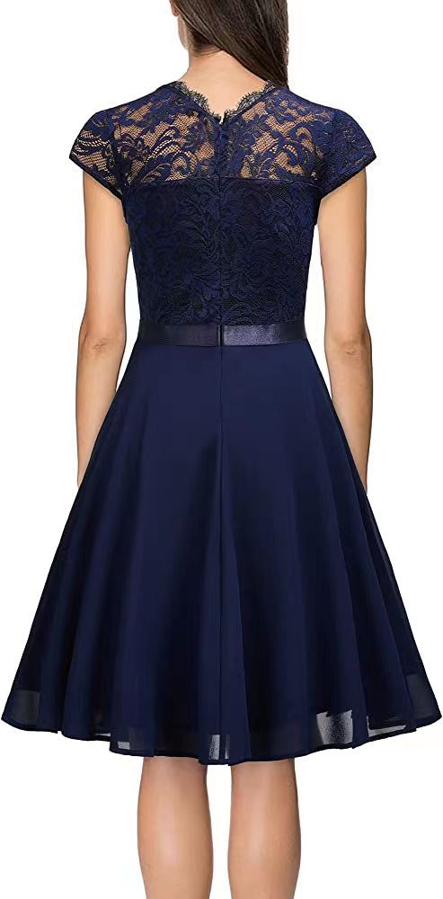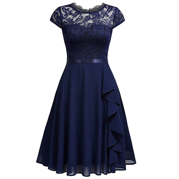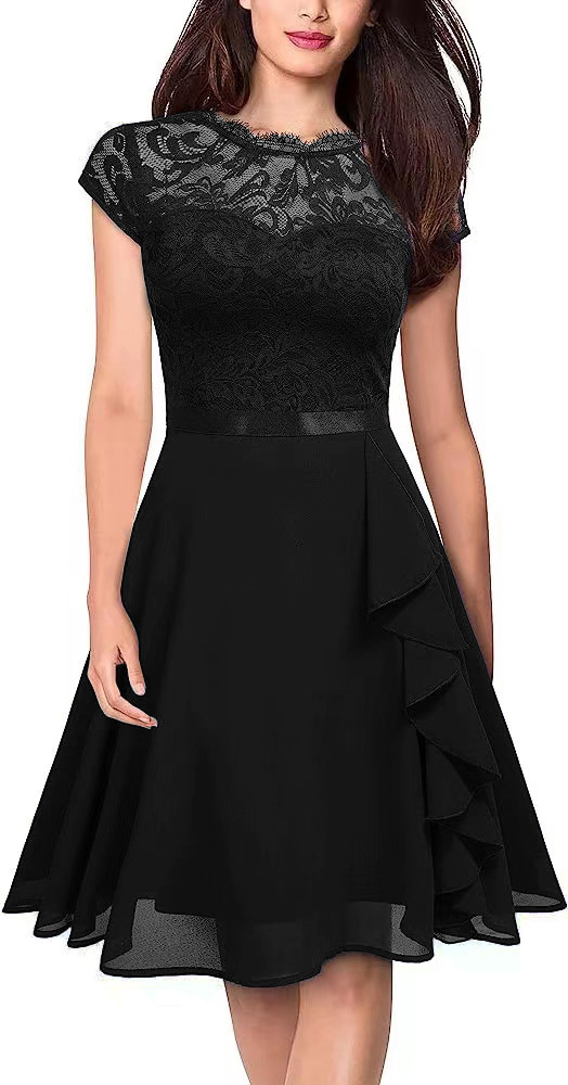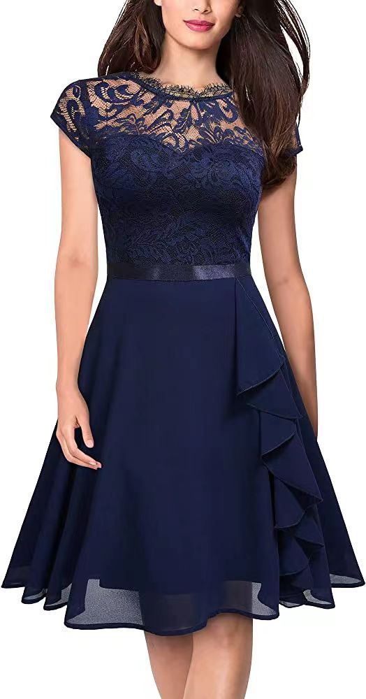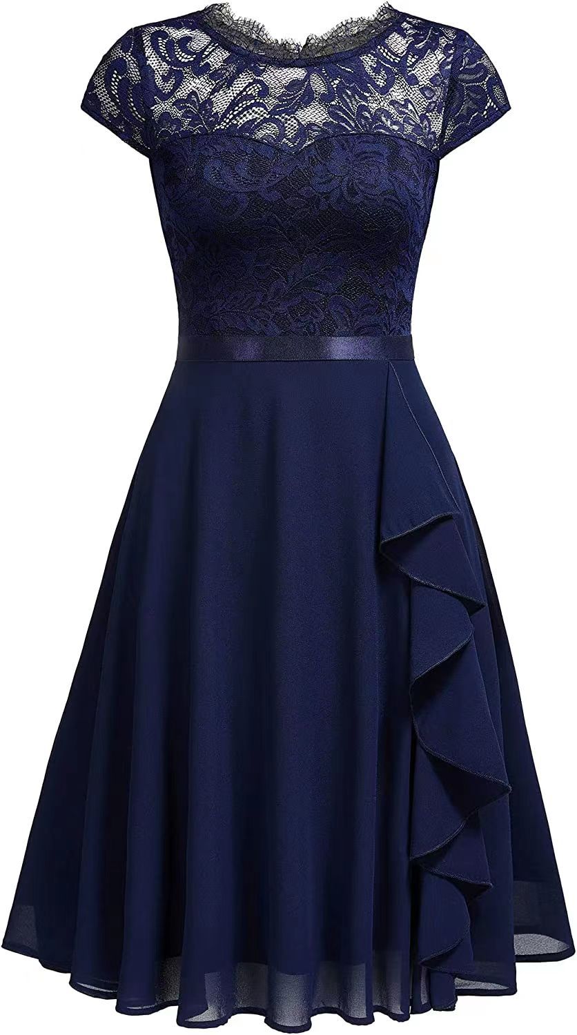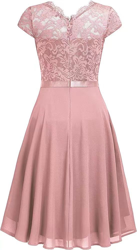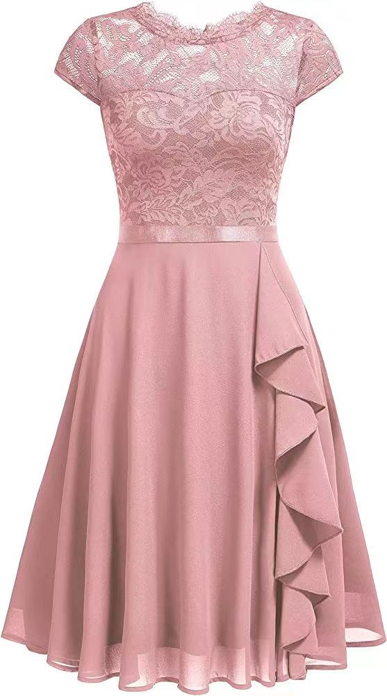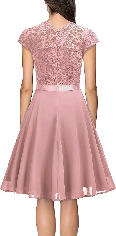 아마존 2023 여름 모의 칼라 반소매 레이스 미디 원피스 쉬폰 스티치 고무 벨트 원피스