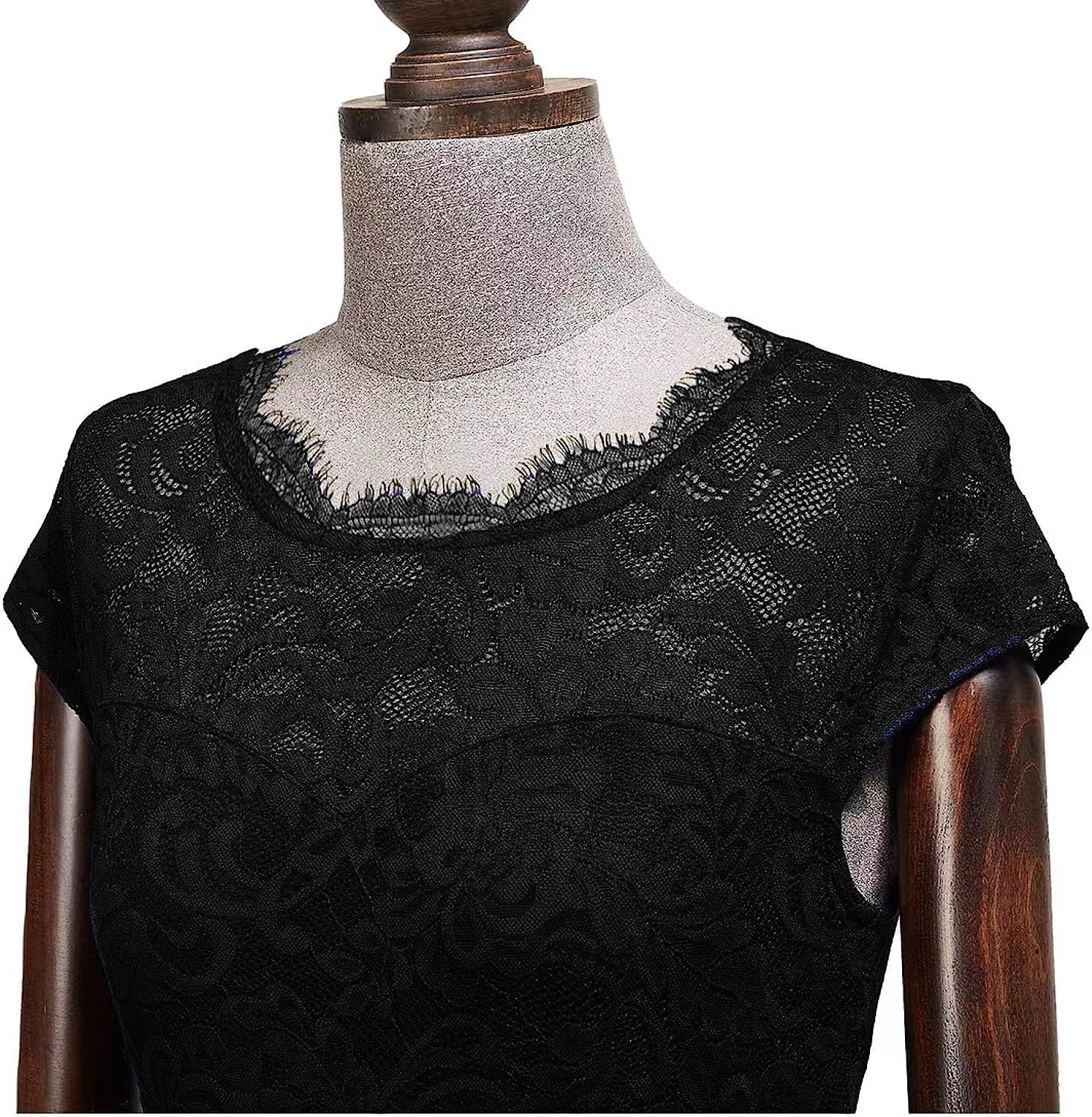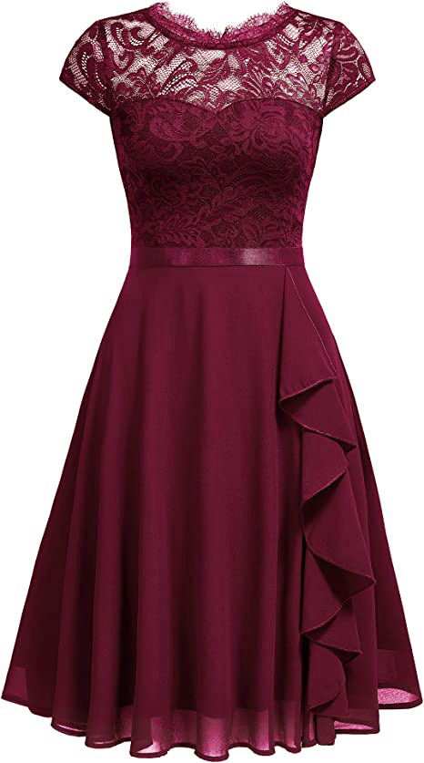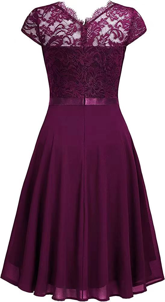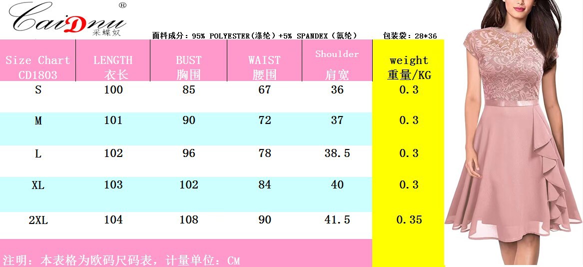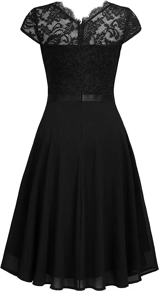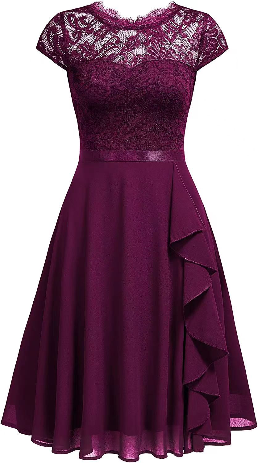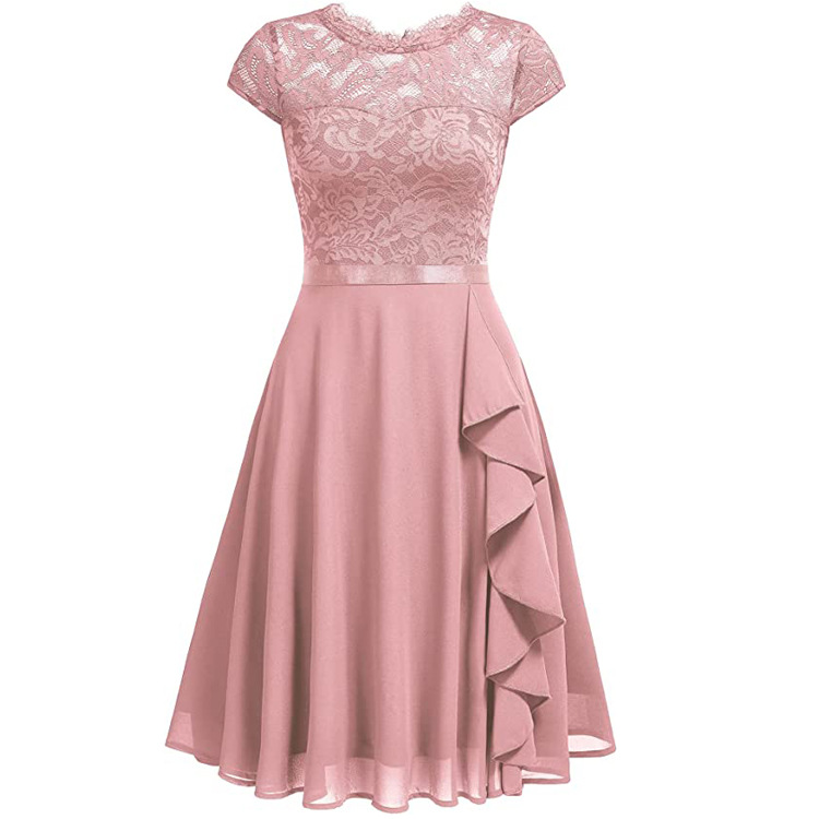 아마존 2023 여름 모의 칼라 반소매 레이스 미디 원피스 쉬폰 스티치 고무 벨트 원피스
