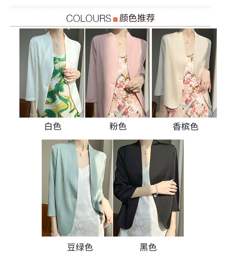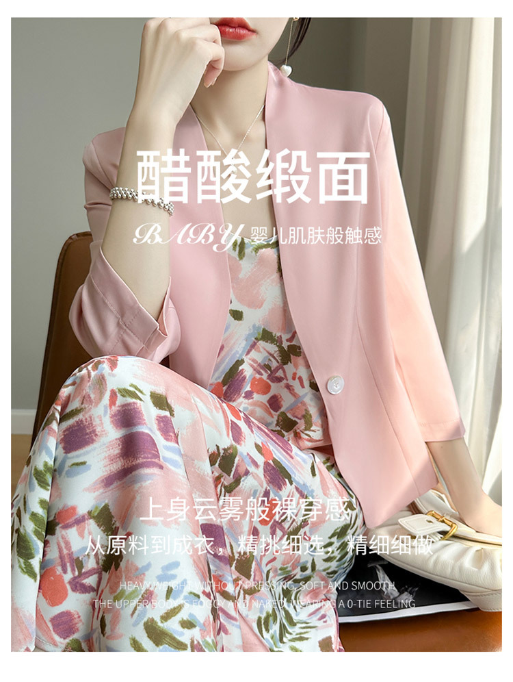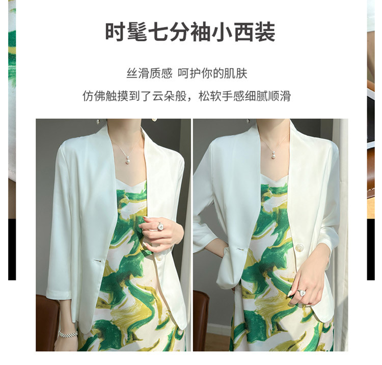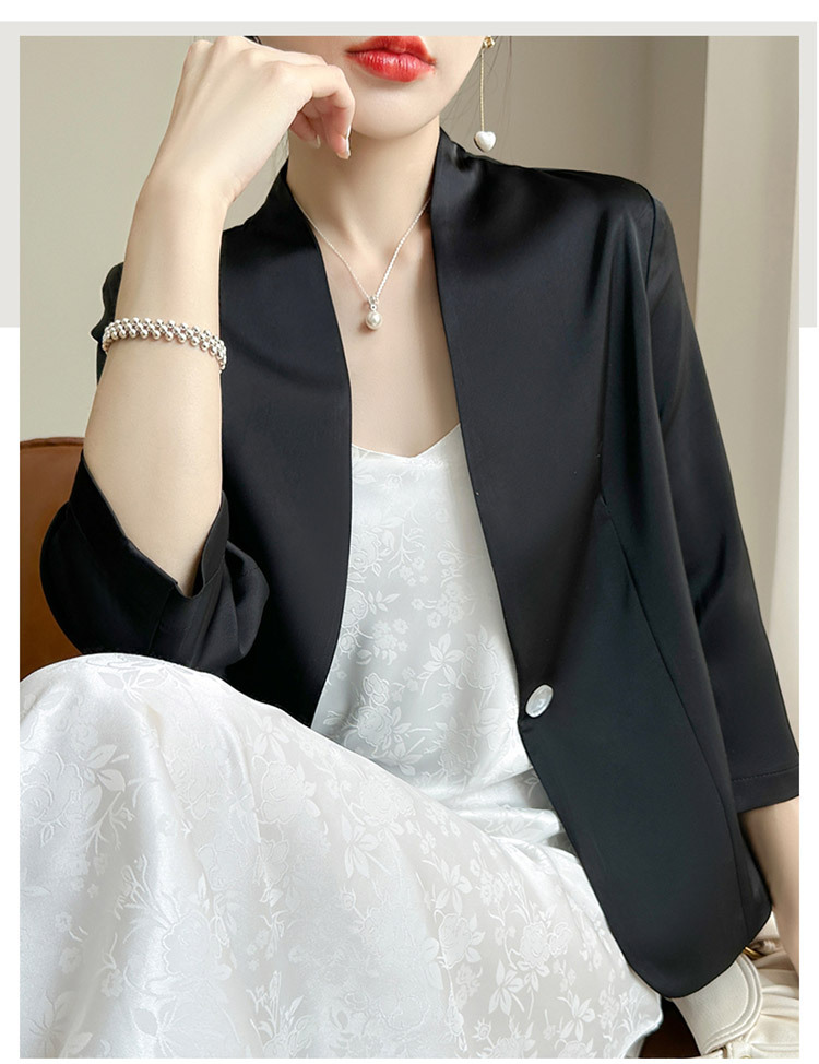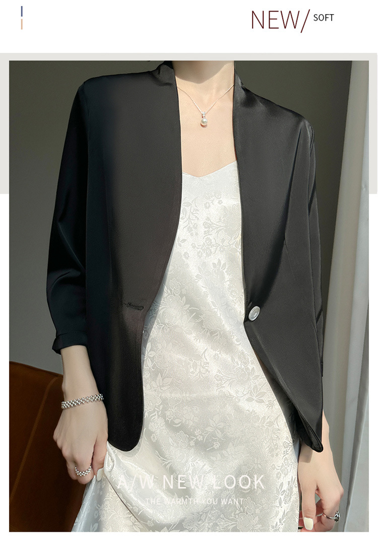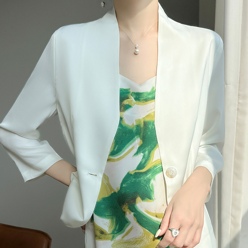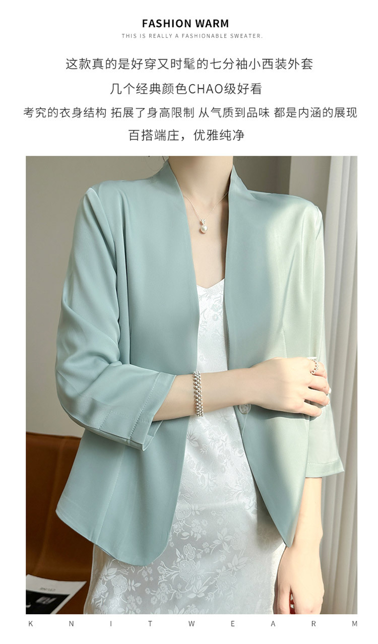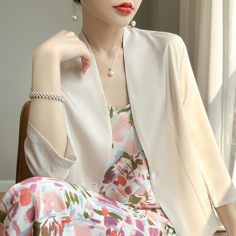 2023 신상품 화이트 칼라리스 봄과 가을 우아한 아세트산 새틴 7 소매 슬림 핏 짧은 작은 세트 재킷스토어 가기