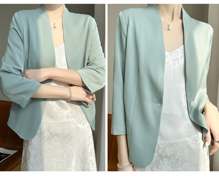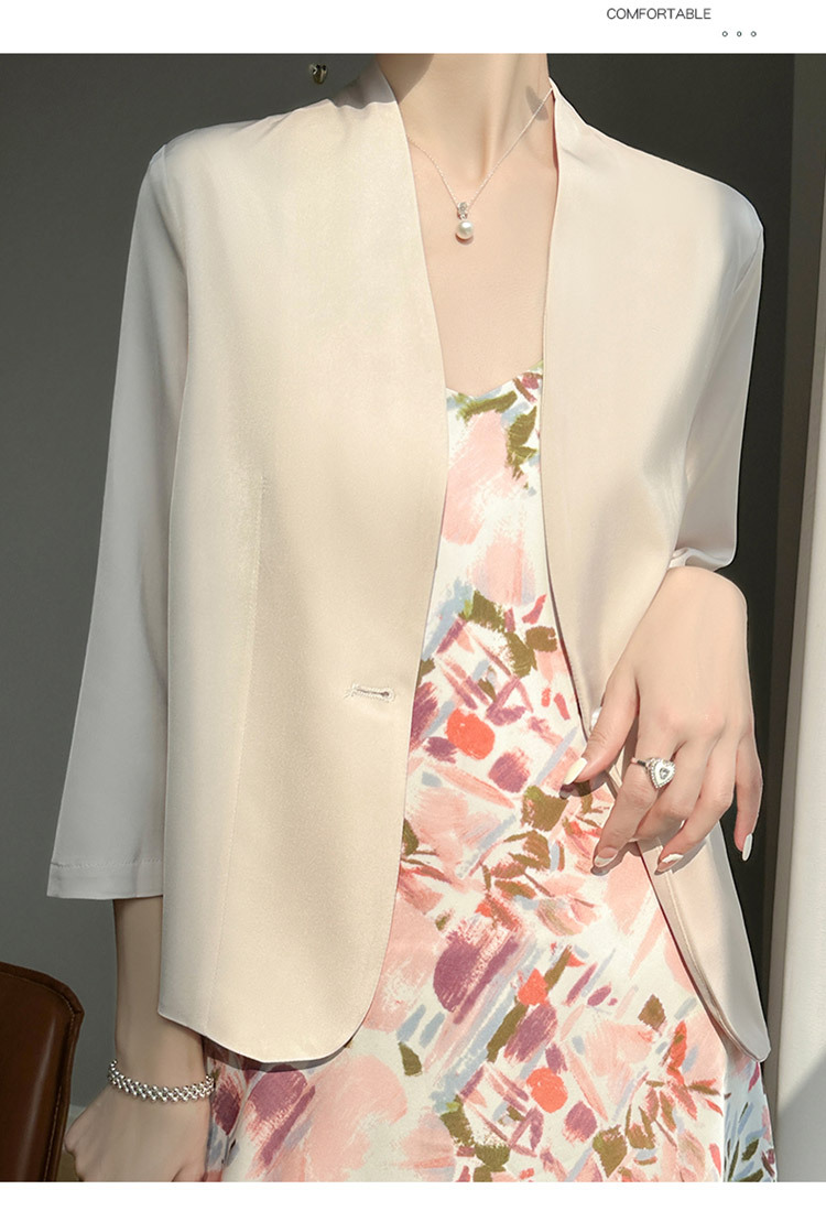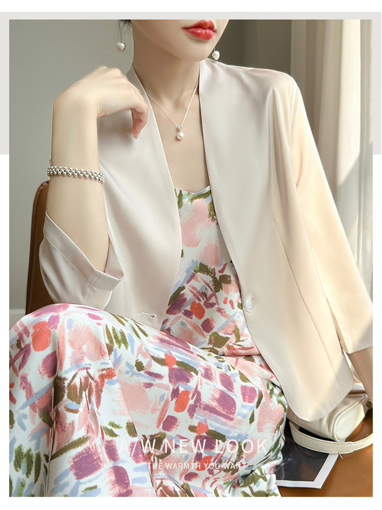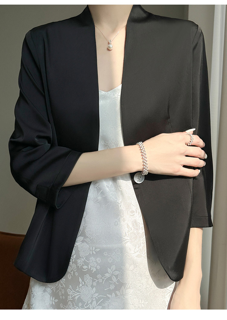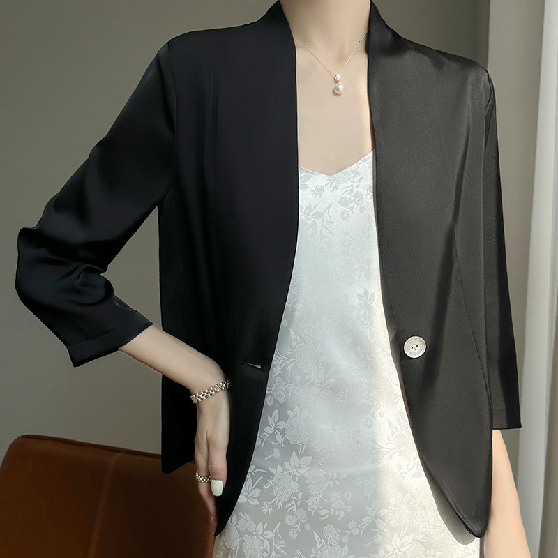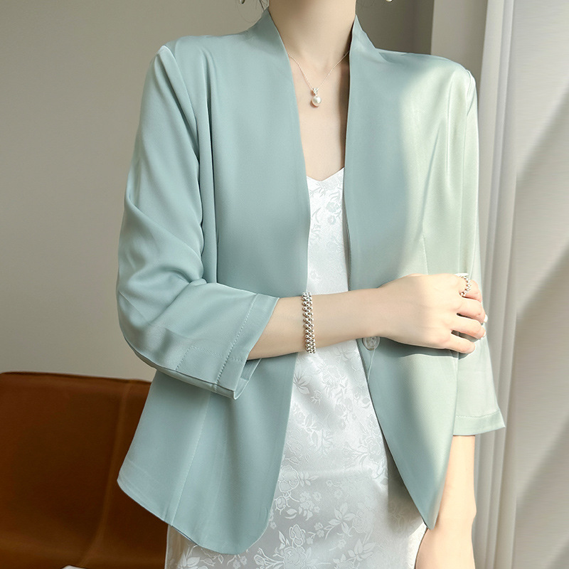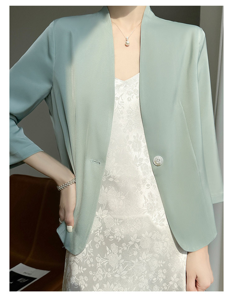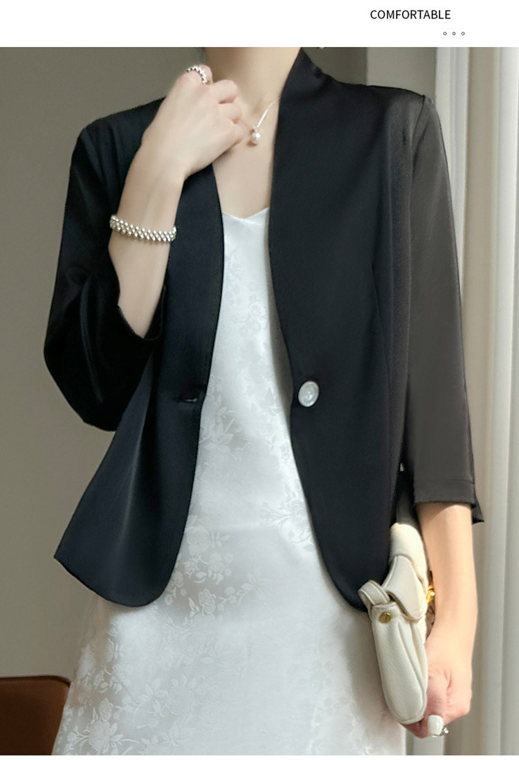 2023 신상품 화이트 칼라리스 봄과 가을 우아한 아세트산 새틴 7 소매 슬림 핏 짧은 작은 세트 재킷스토어 가기