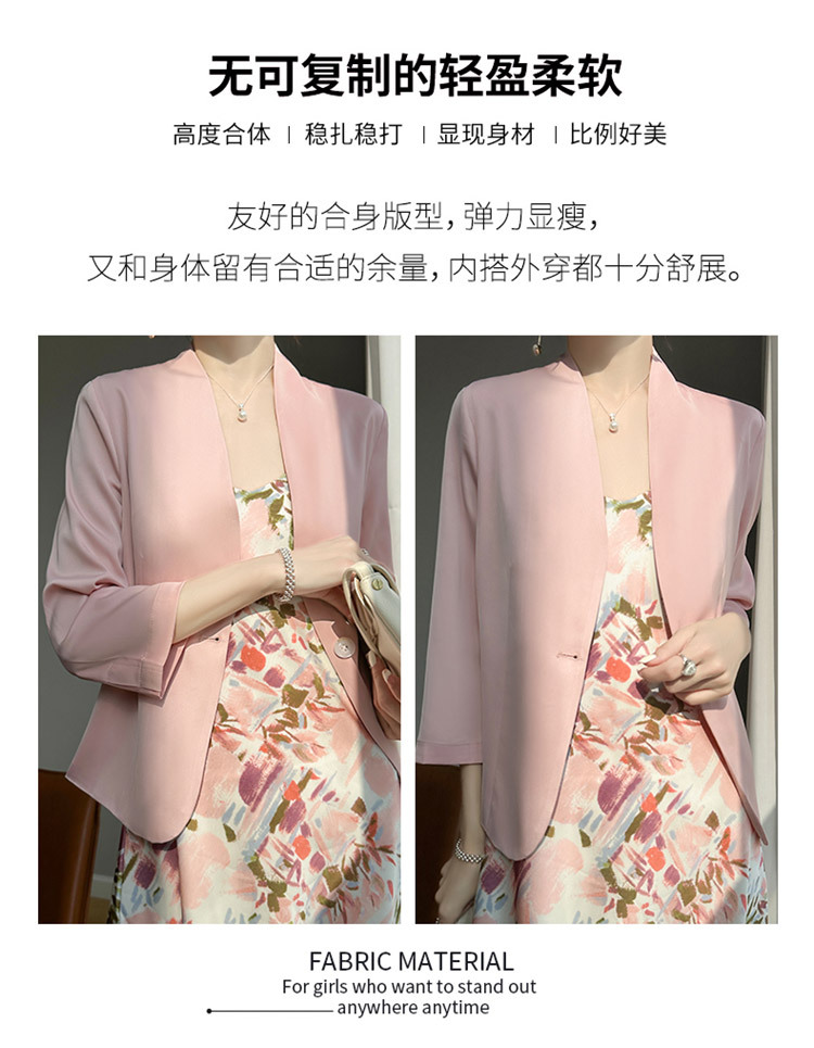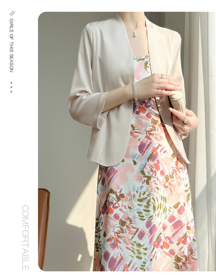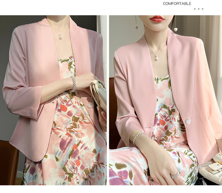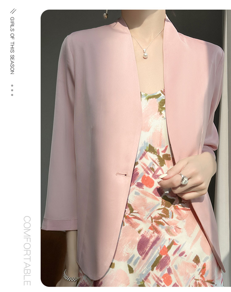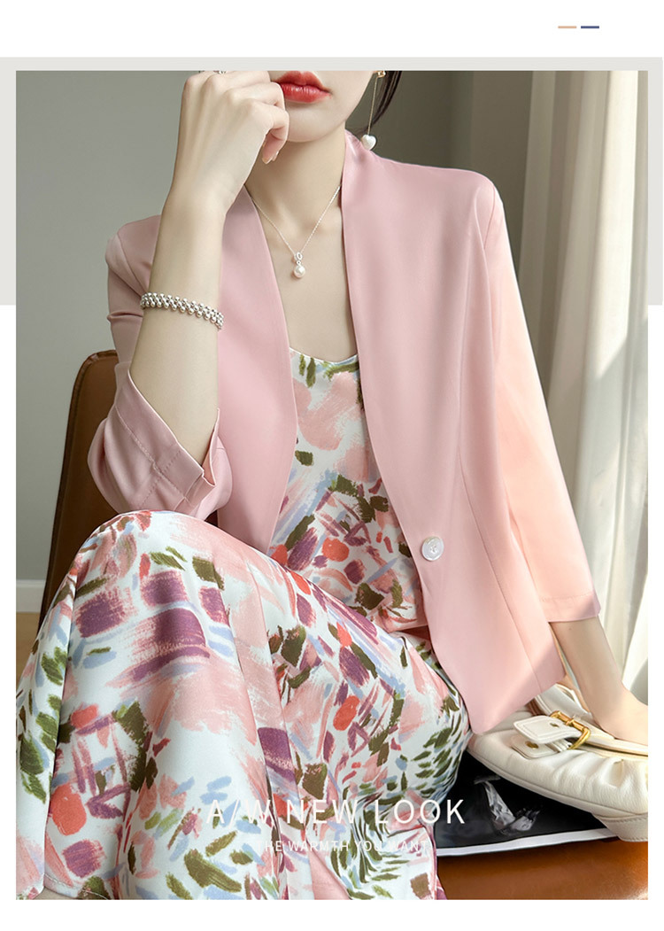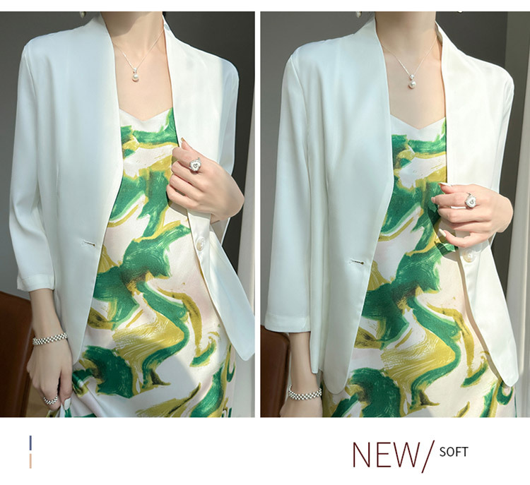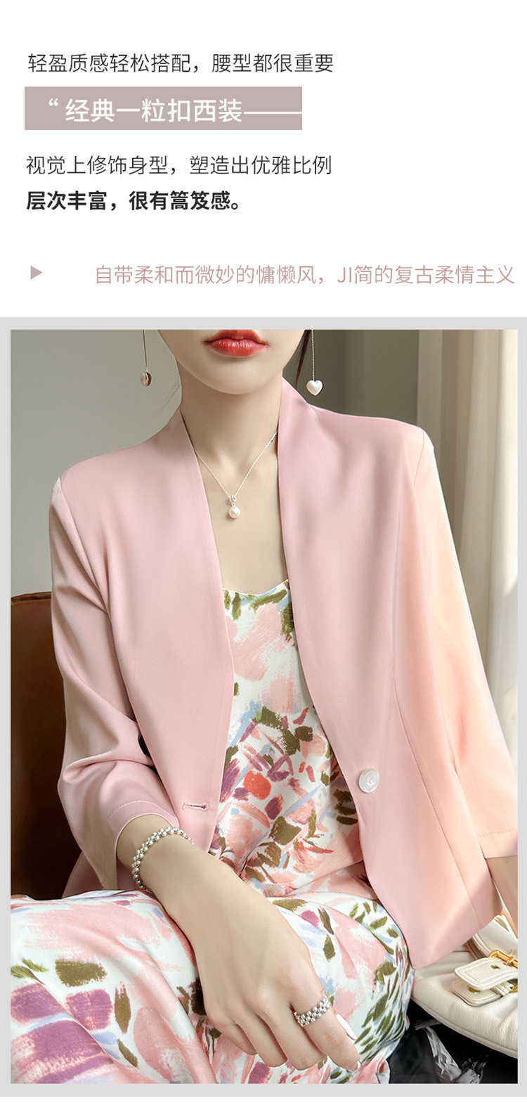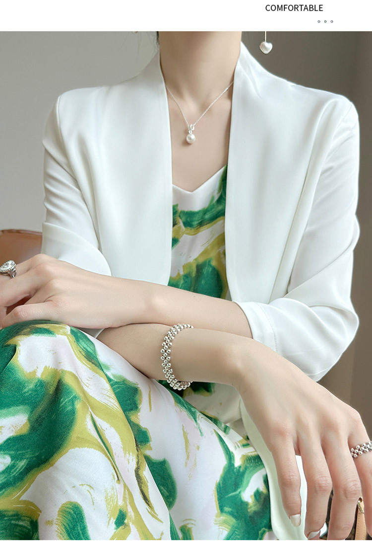 2023 신상품 화이트 칼라리스 봄과 가을 우아한 아세트산 새틴 7 소매 슬림 핏 짧은 작은 세트 재킷스토어 가기