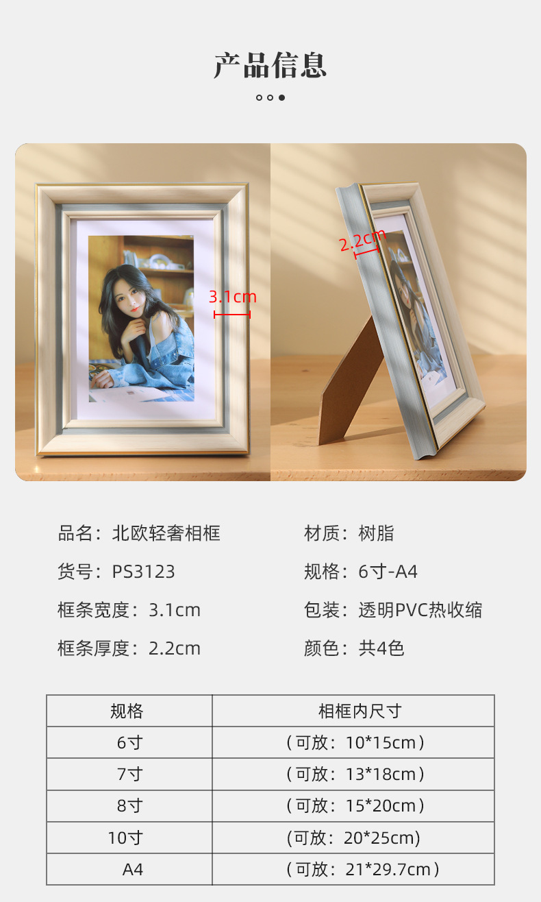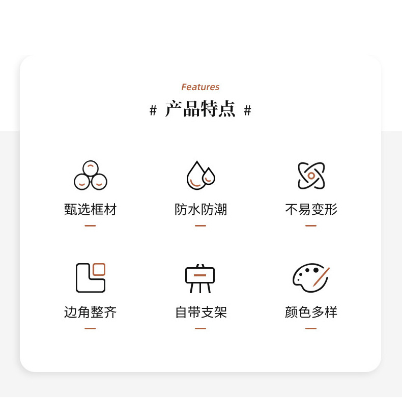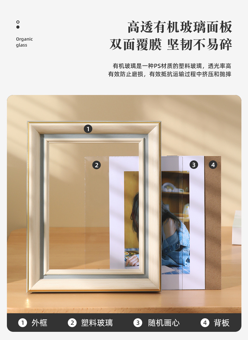二、成品相框包含:( 外框、照片纸、有机玻璃,高密度防潮背板、挂钩)。