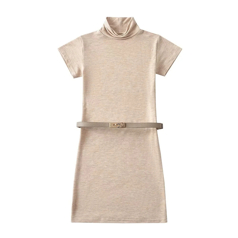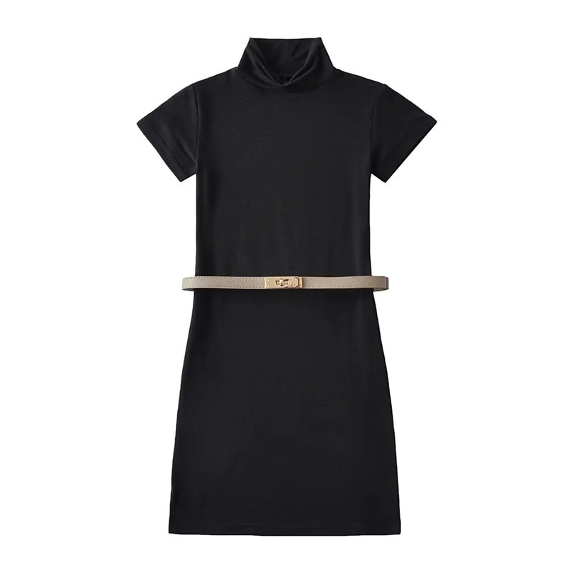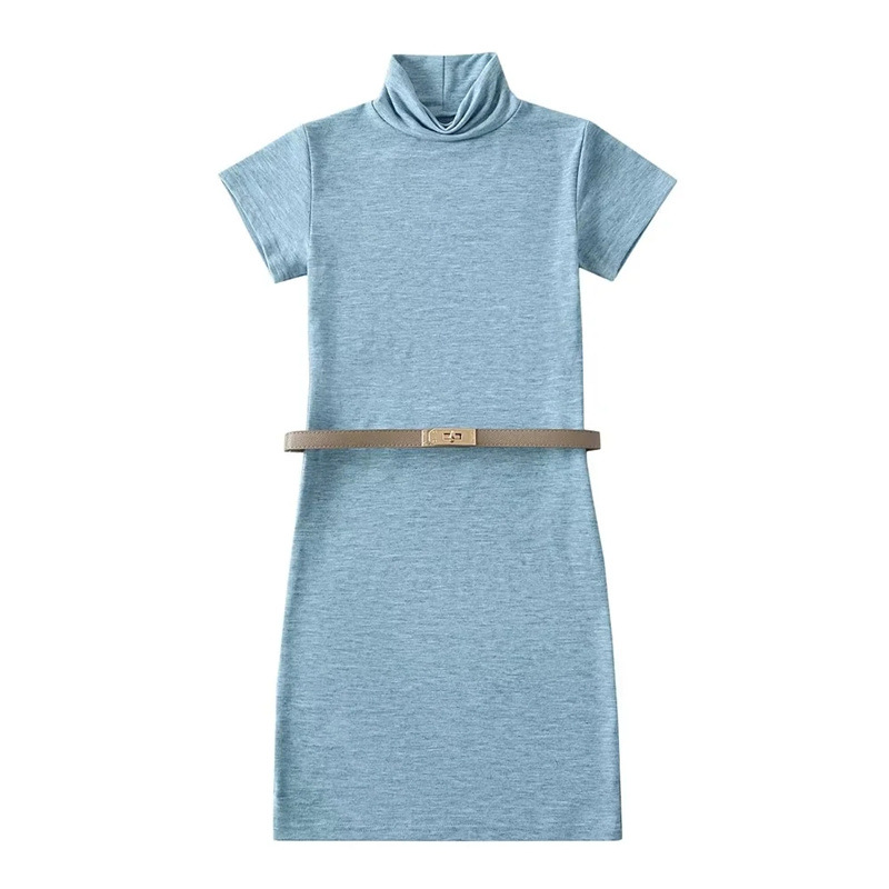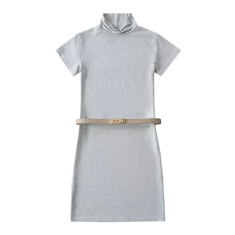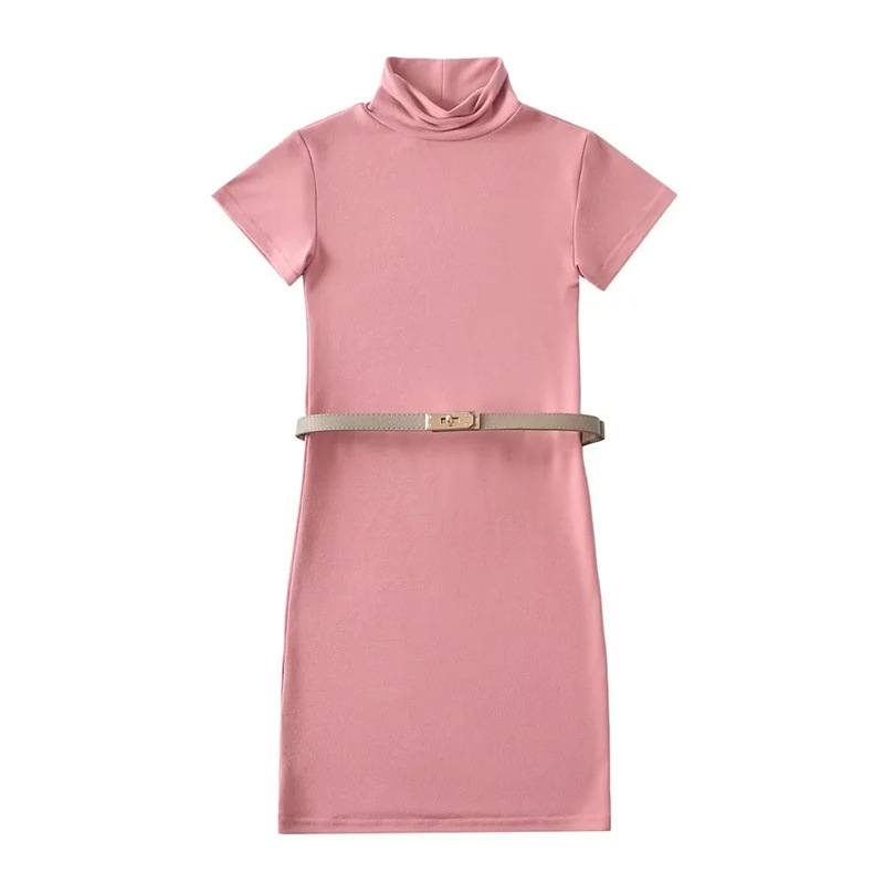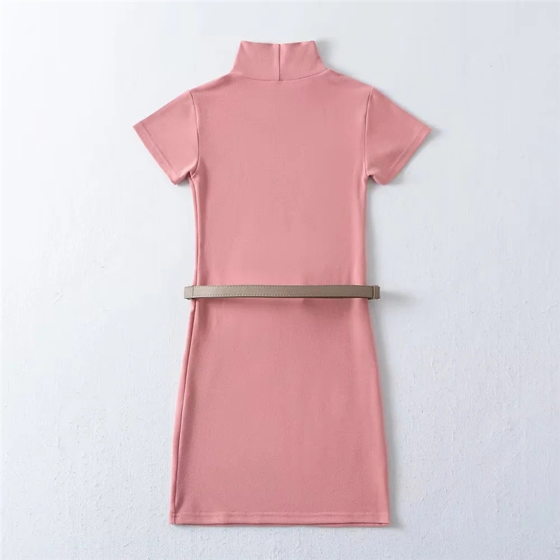 순수한 욕망 스타일 꽉 엉덩이 하이 넥 짧은 소매 원피스 벨트 슬림 핏 슬리밍 단색 향신료 소녀 기본 스커트