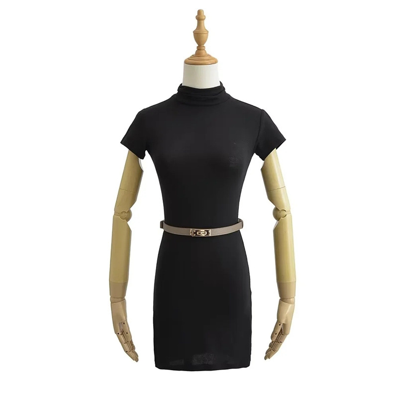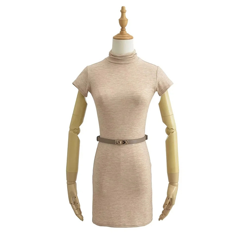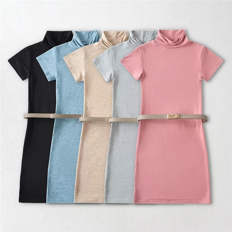 순수한 욕망 스타일 꽉 엉덩이 하이 넥 짧은 소매 원피스 벨트 슬림 핏 슬리밍 단색 향신료 소녀 기본 스커트스토어 가기