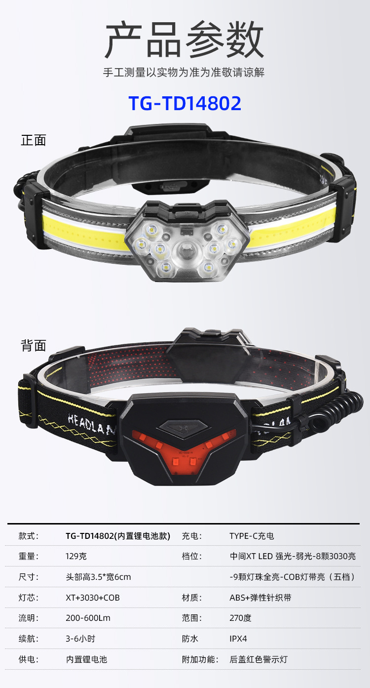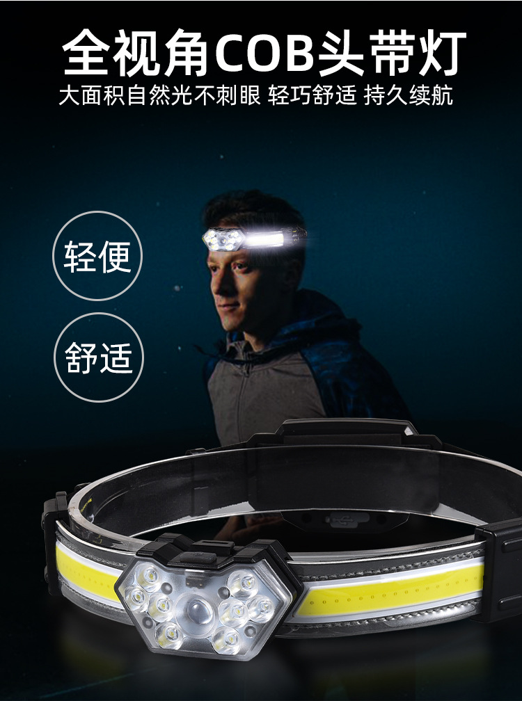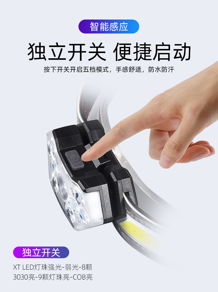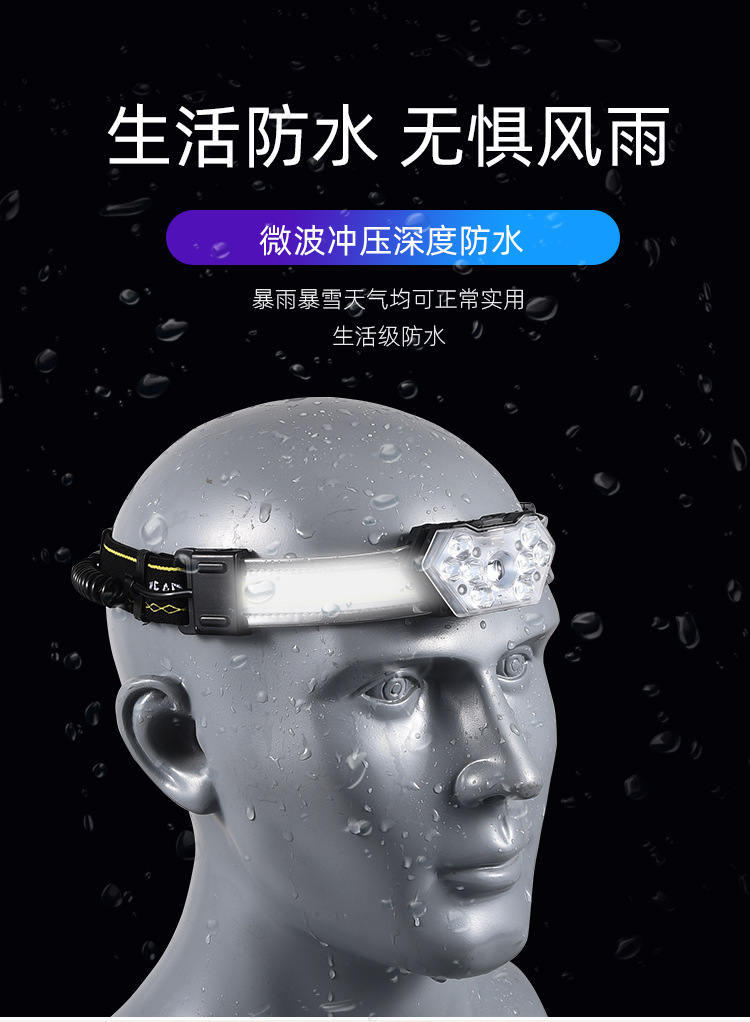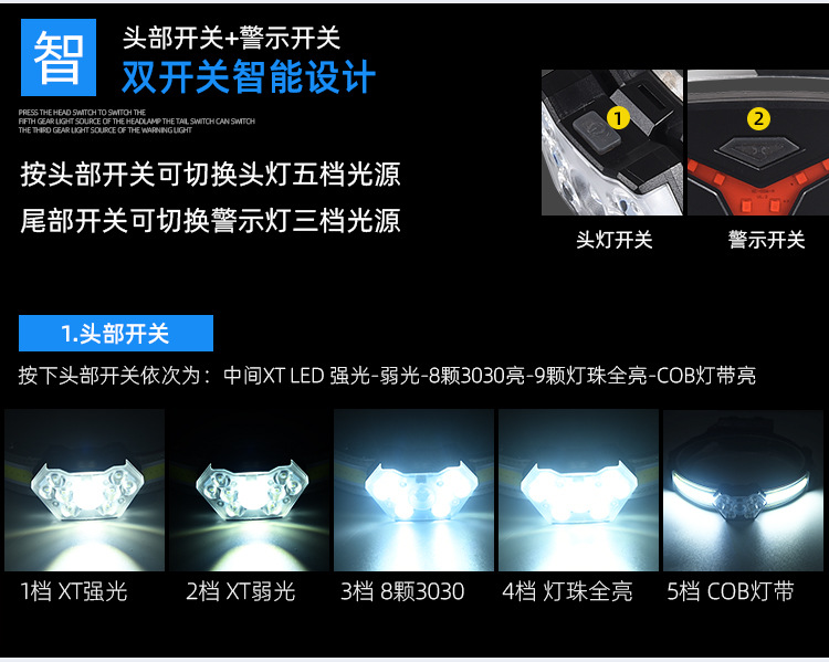 【工作档位】:主灯:强光-弱光-8LED亮-全亮-COB亮; 尾灯:红光全亮-红光闪烁-红灯跳动