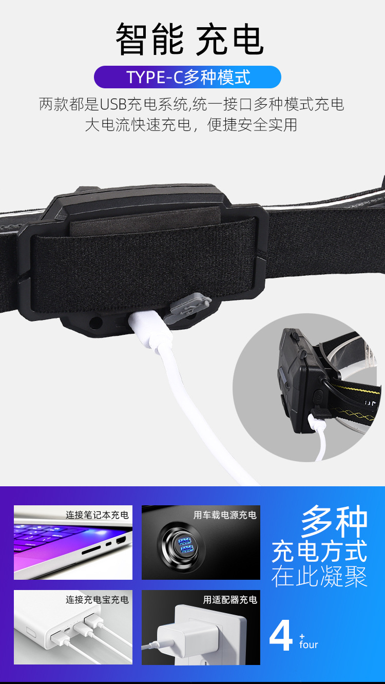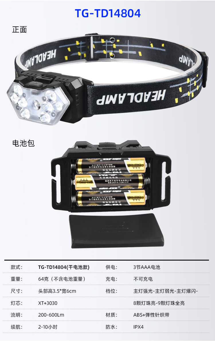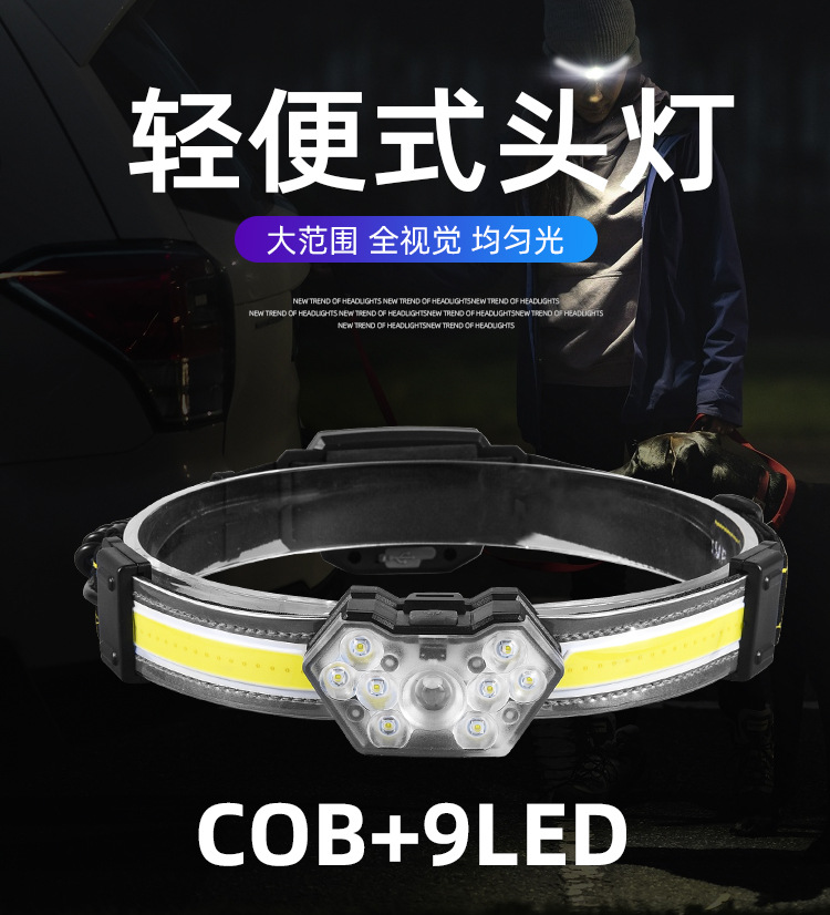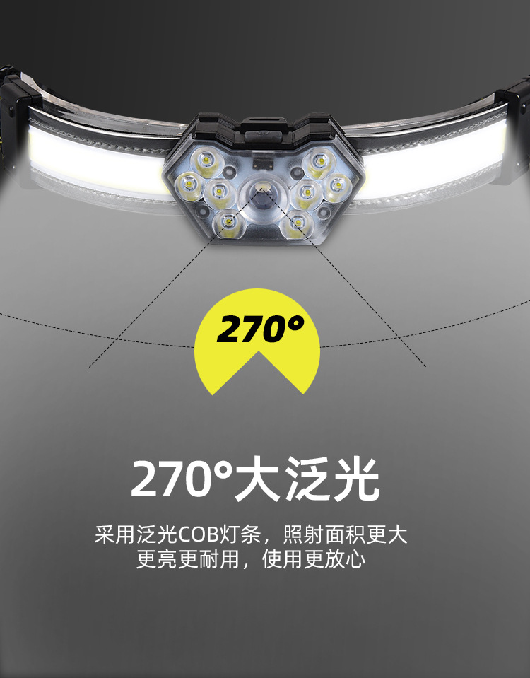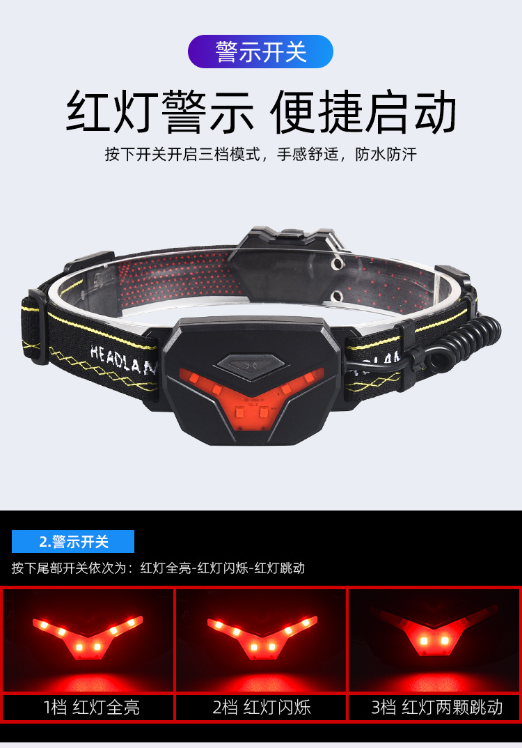 【工作档位】:主灯:强光-弱光-8LED亮-全亮-COB亮; 尾灯:红光全亮-红光闪烁-红灯跳动