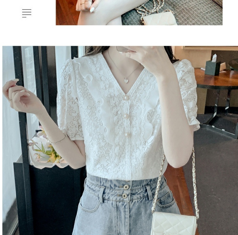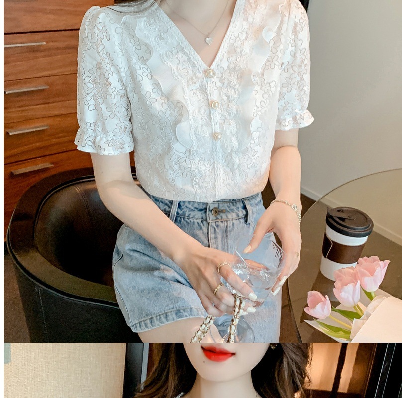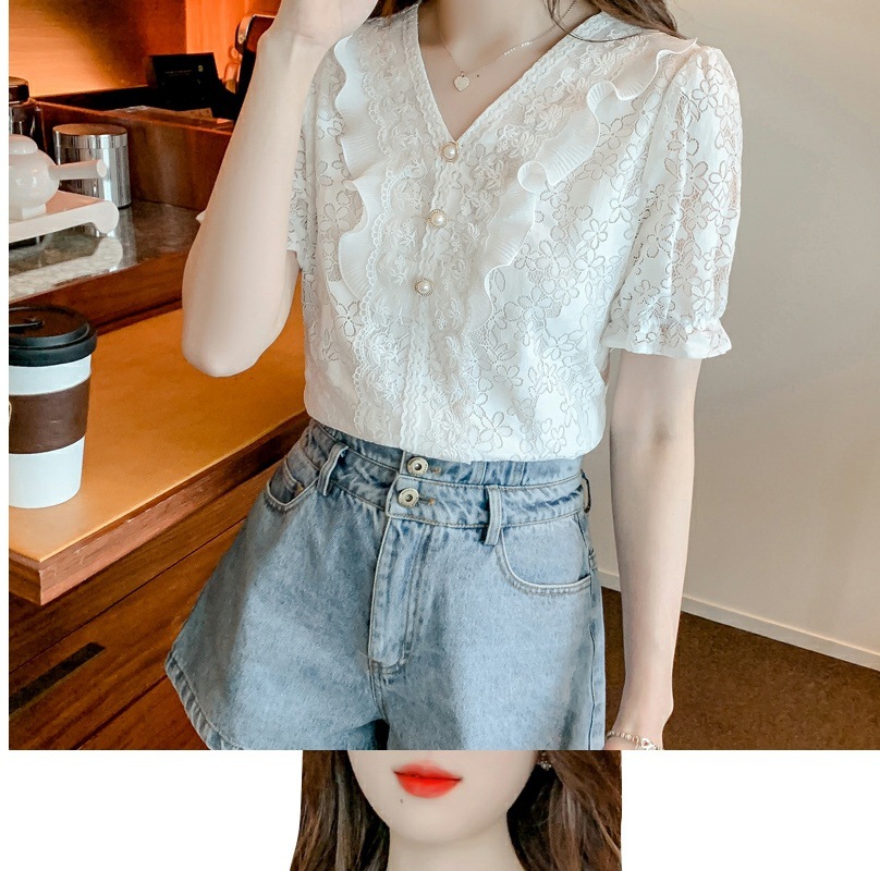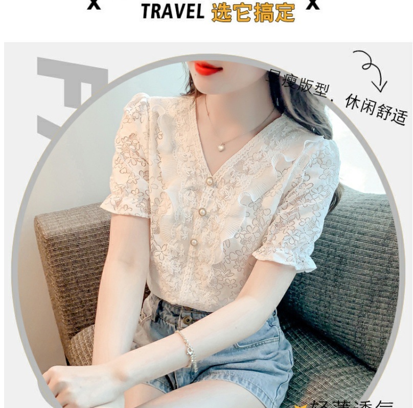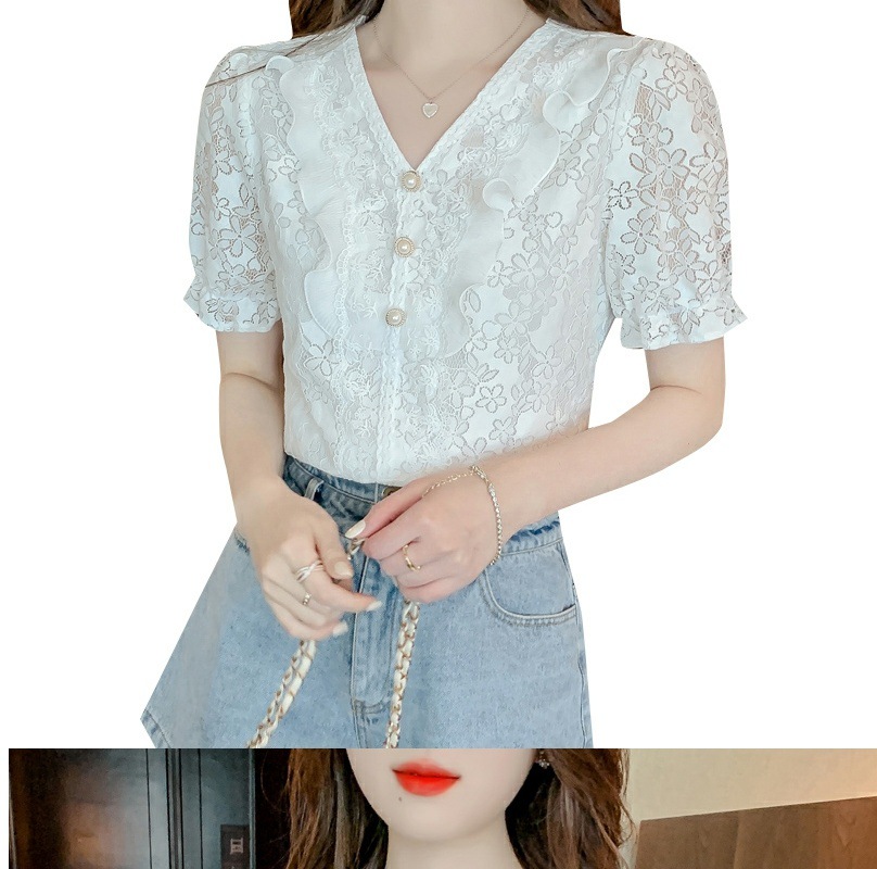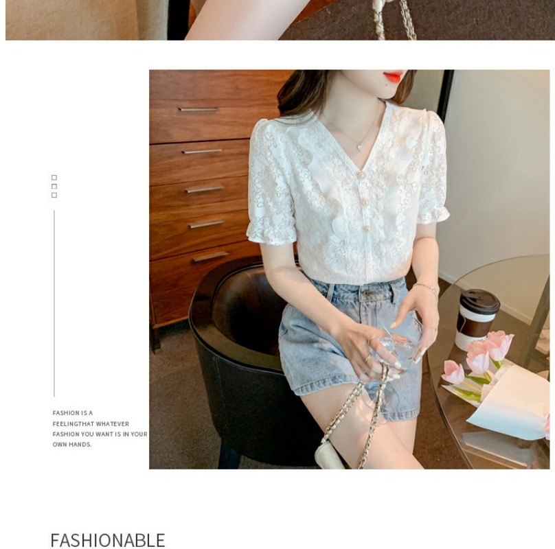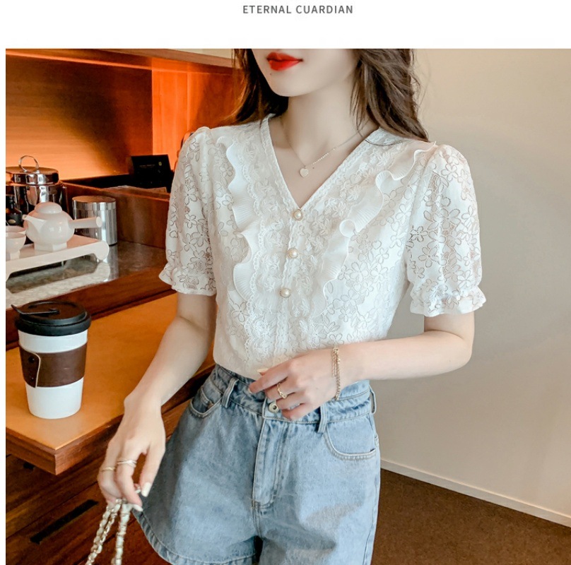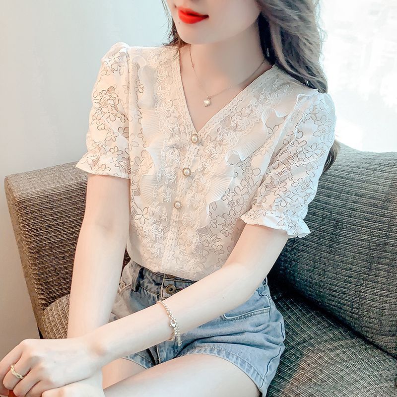 패션 V-넥 반팔 쉬폰 셔츠 여성 여름 2023 새로운 스타일 우아한 모든 매치 웨스턴 레이스 셔츠 여름 탑