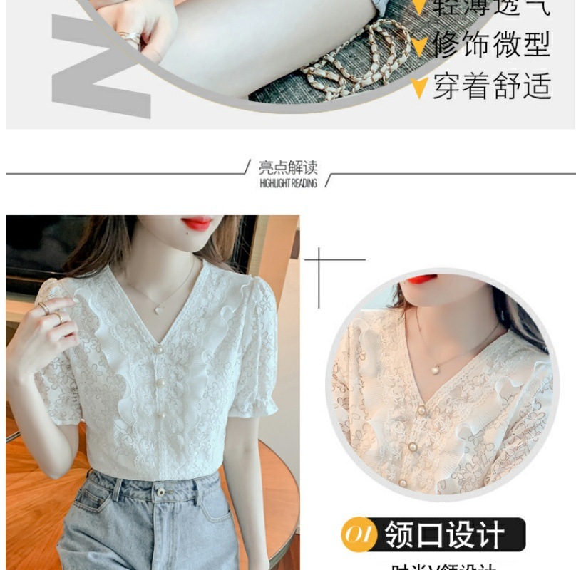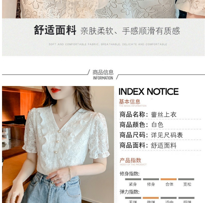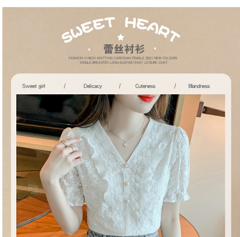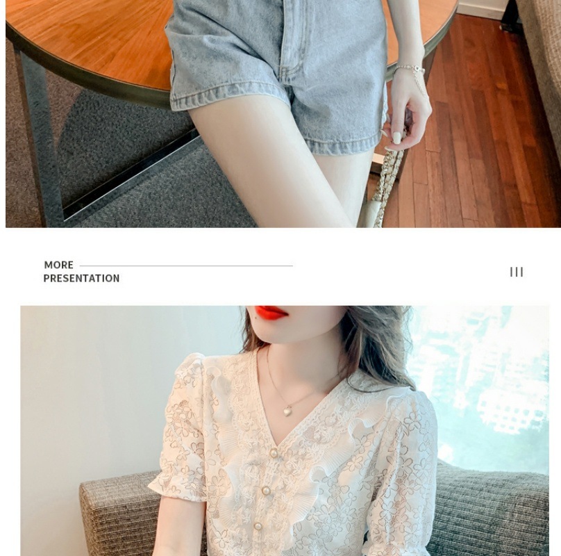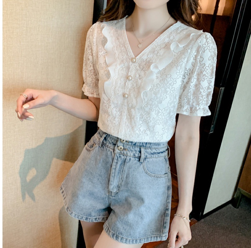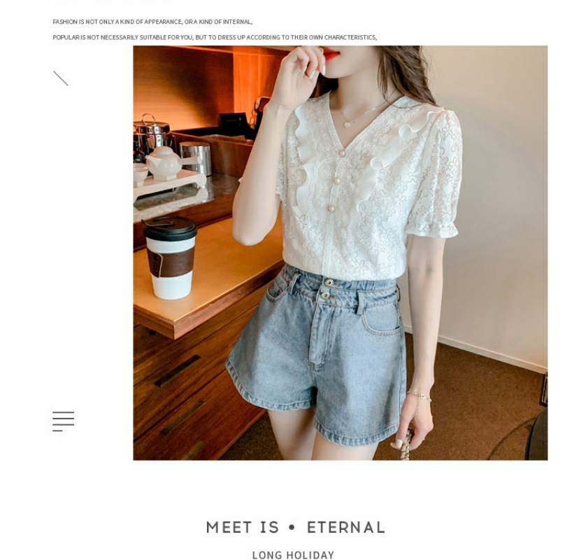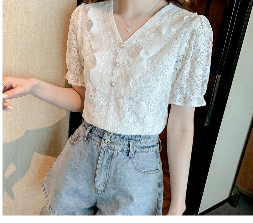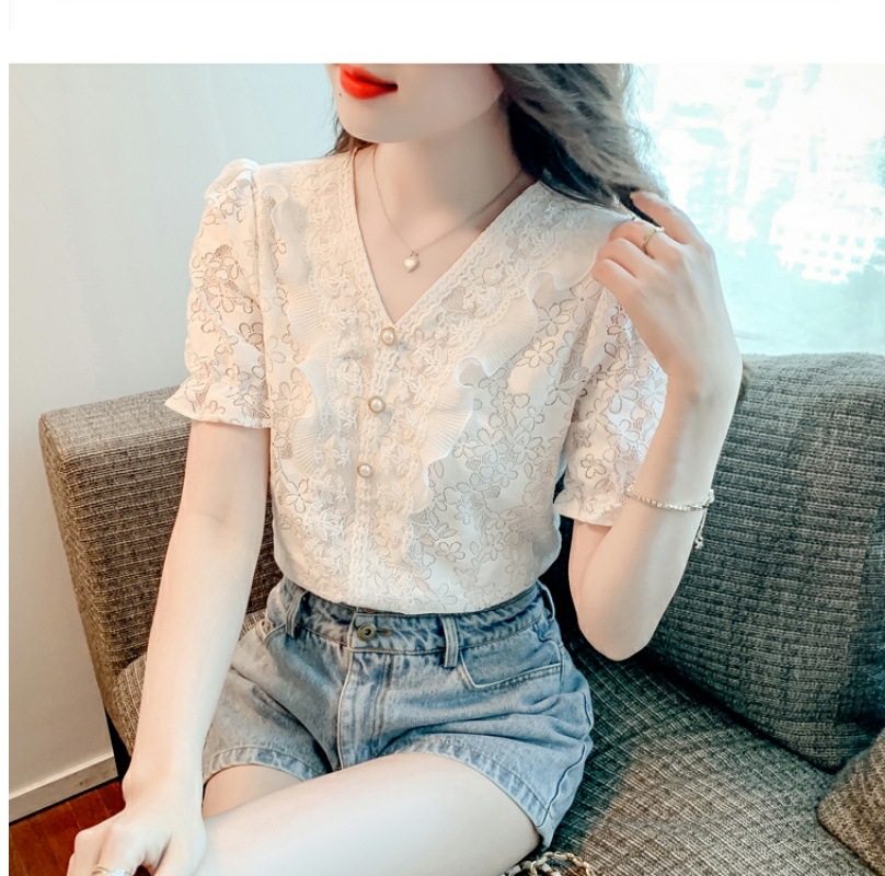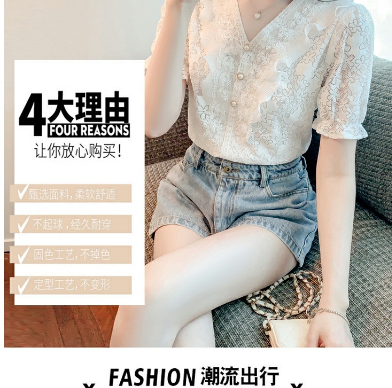 패션 V-넥 반팔 쉬폰 셔츠 여성 여름 2023 새로운 스타일 우아한 모든 매치 웨스턴 레이스 셔츠 여름 탑