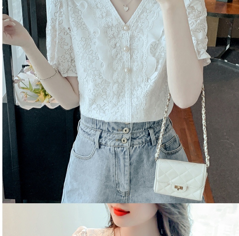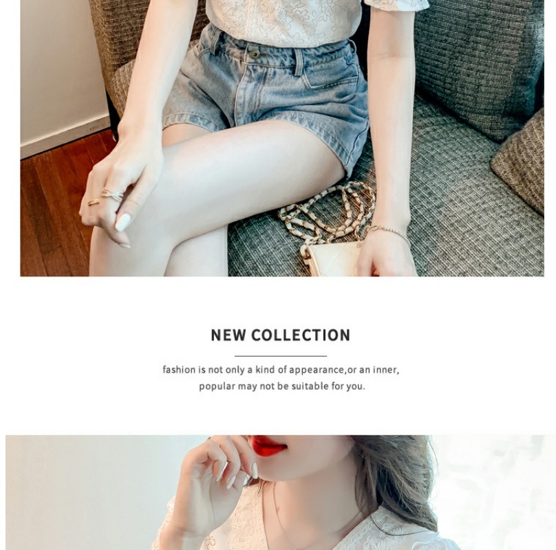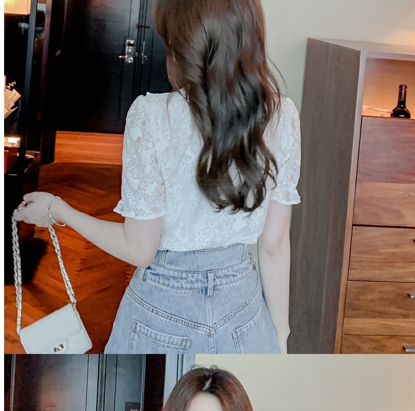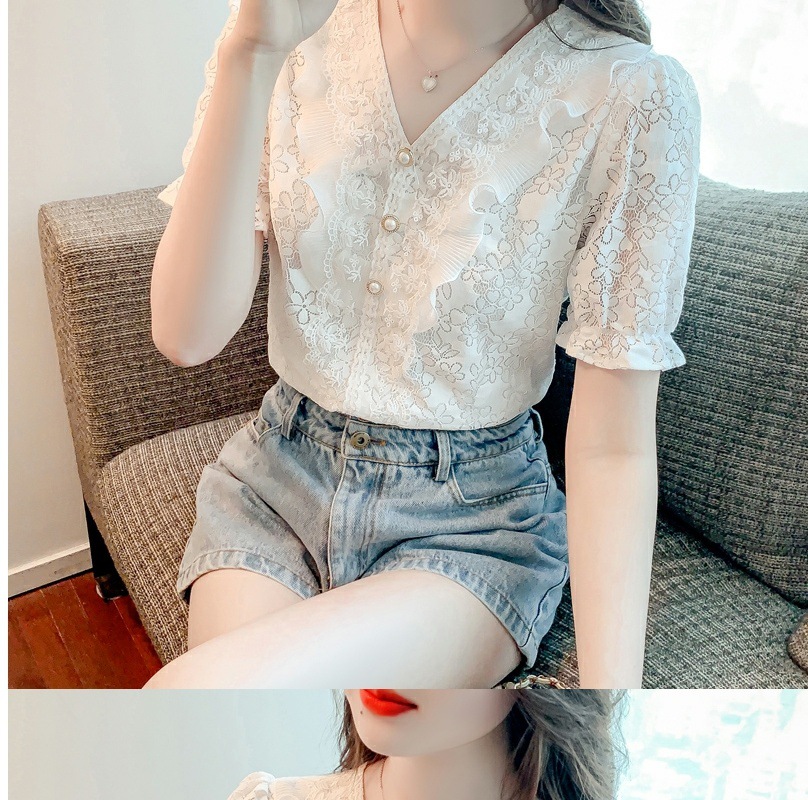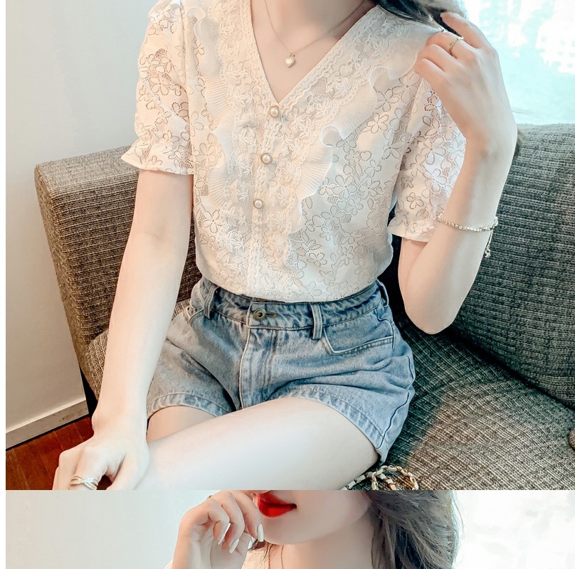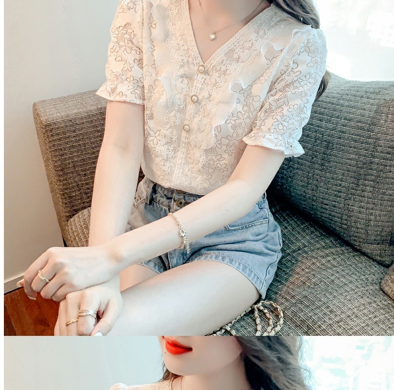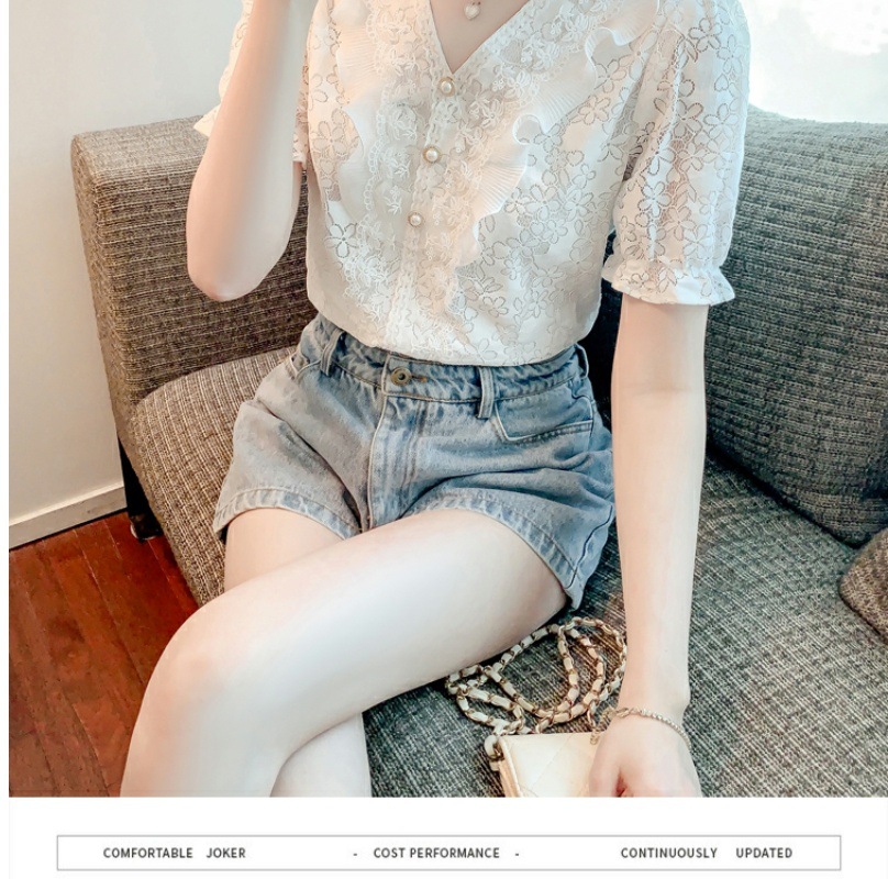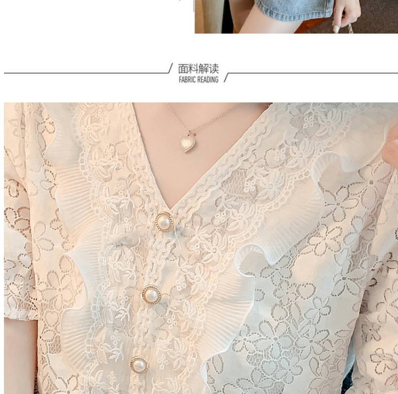 패션 V-넥 반팔 쉬폰 셔츠 여성 여름 2023 새로운 스타일 우아한 모든 매치 웨스턴 레이스 셔츠 여름 탑