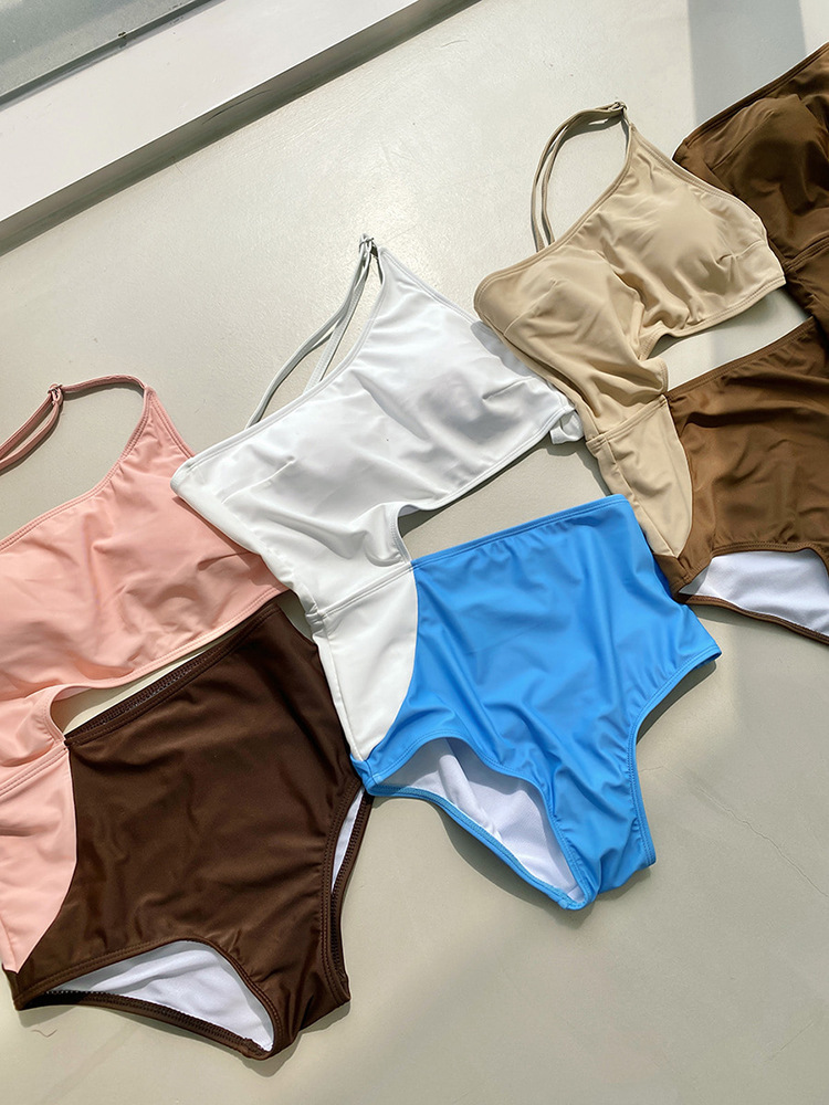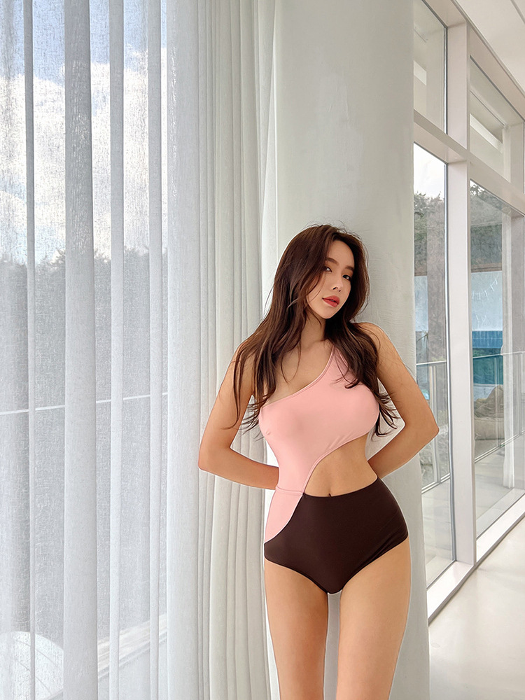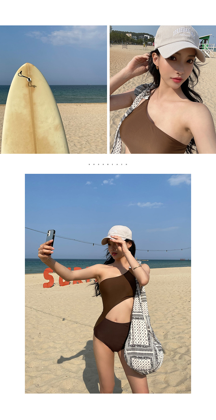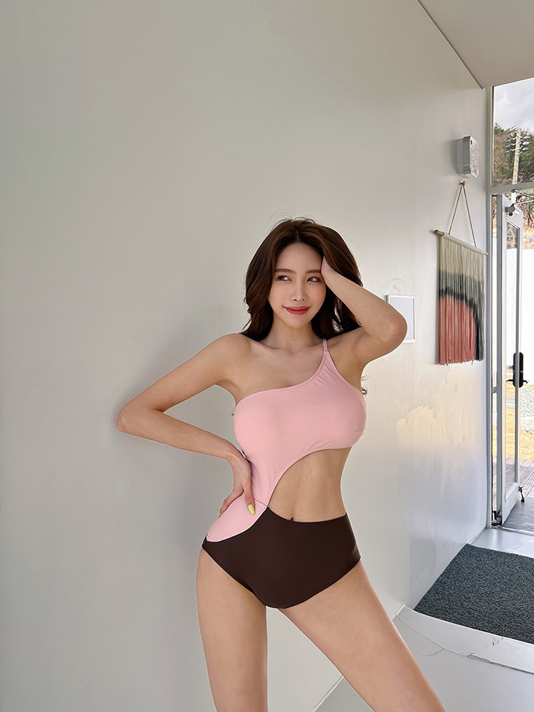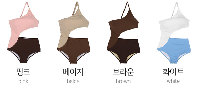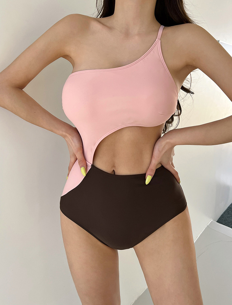 한국 수영복 2023 온천 새로운 원 숄더 컬러 매칭 하이 웨이스트 배꼽 커버 슬리밍 섹시한 원피스 섹시 수영복 여성용스토어 가기