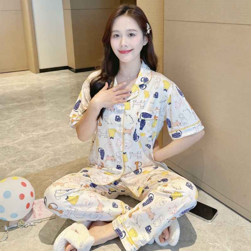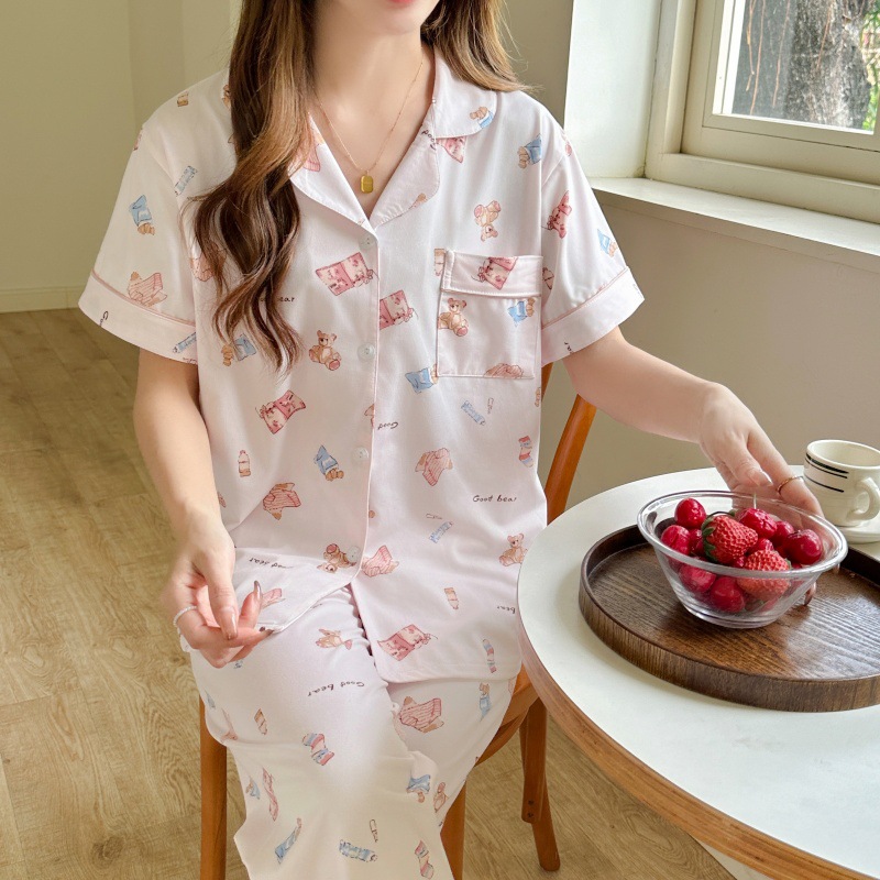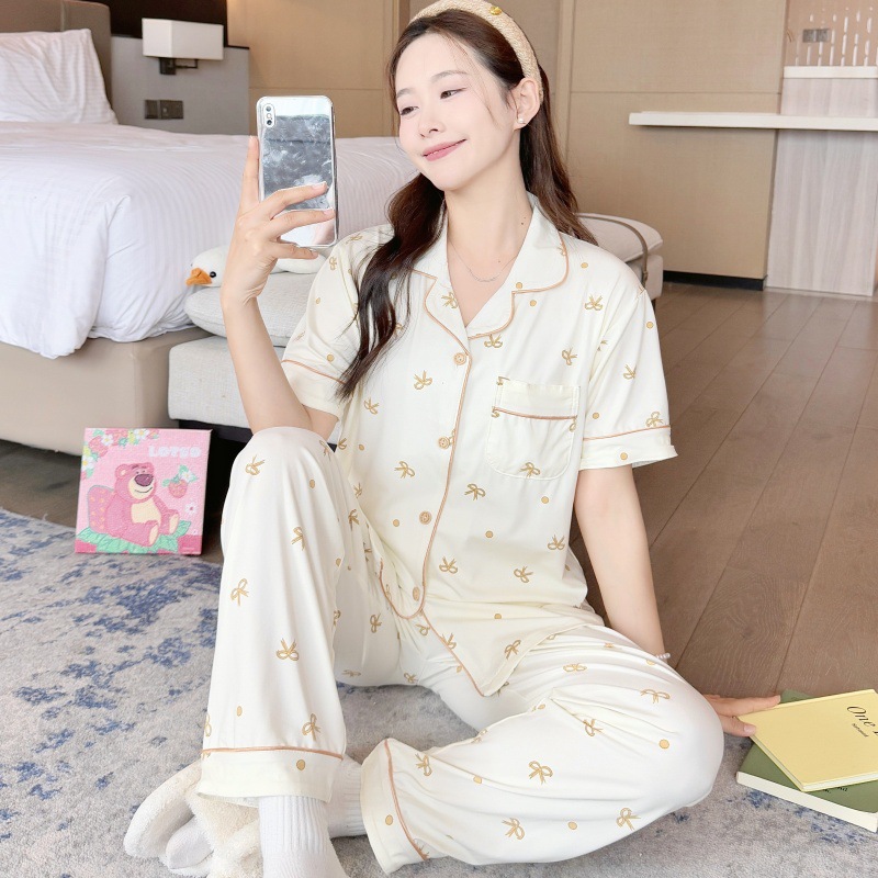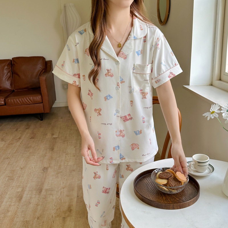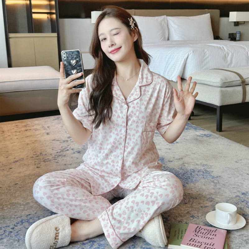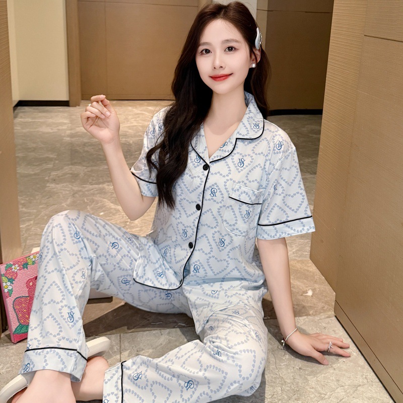 생방송 폭발적인 여름 신작 반팔 바지 잠옷 여성 심플 가디건 달콤하고 집 밖에서 입을 수 있는 옷 국경스토어 가기