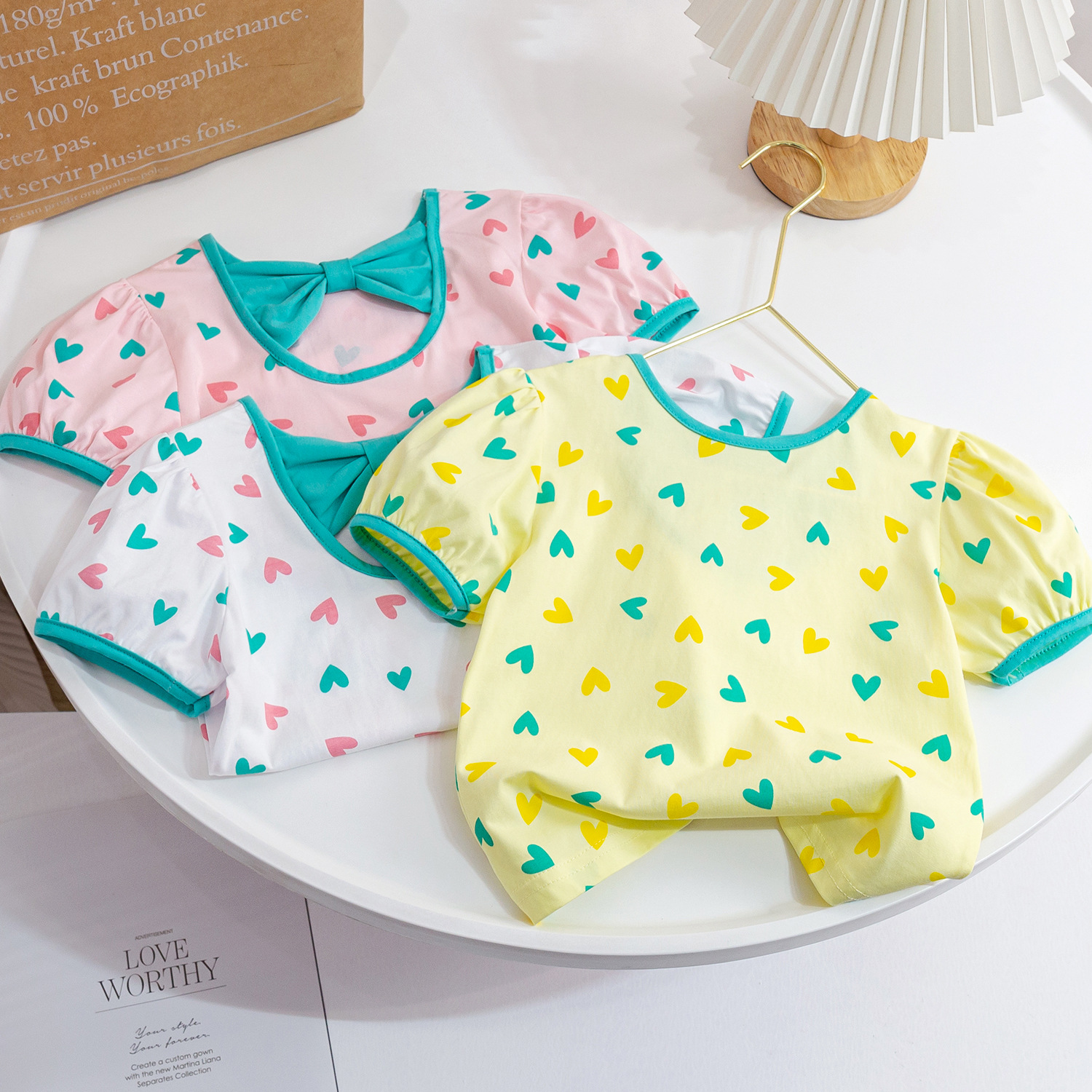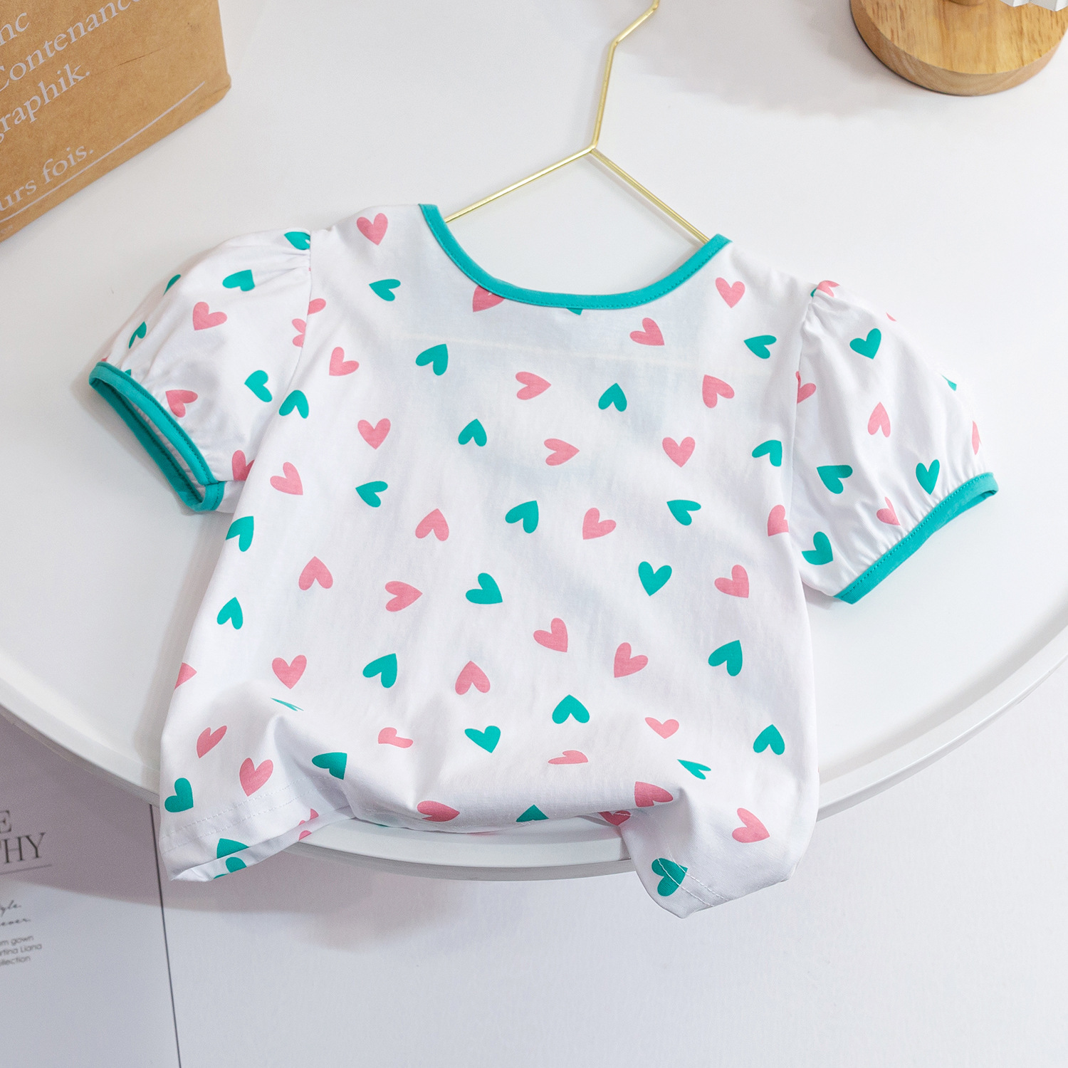 아동복 여아 러브 보우 반팔 티셔츠 2023 여름 새 퍼프 슬리브 순면 반 소매 베이스 셔츠스토어 가기