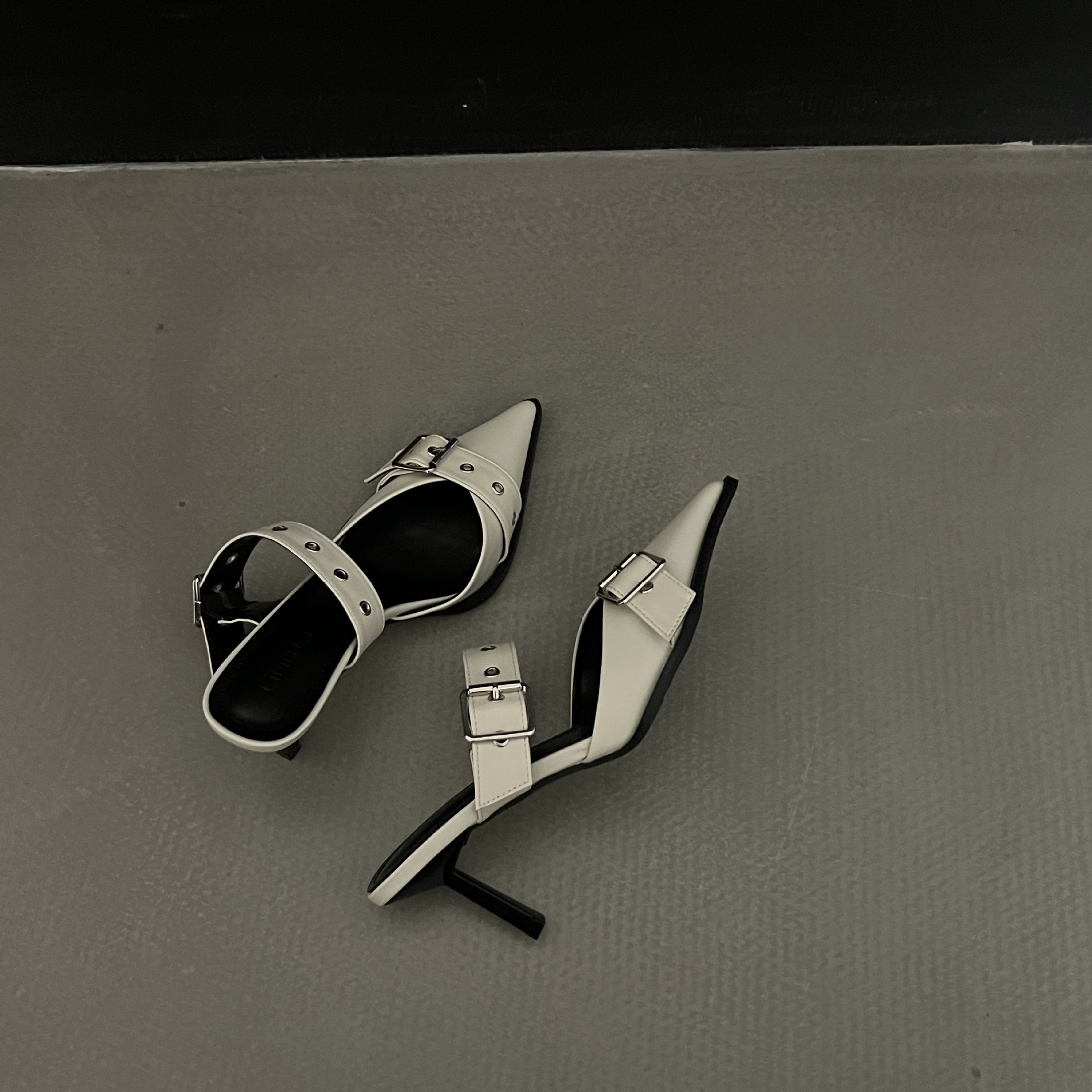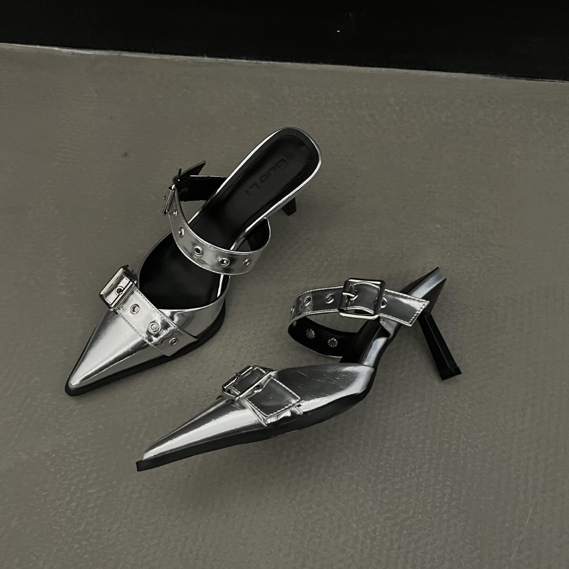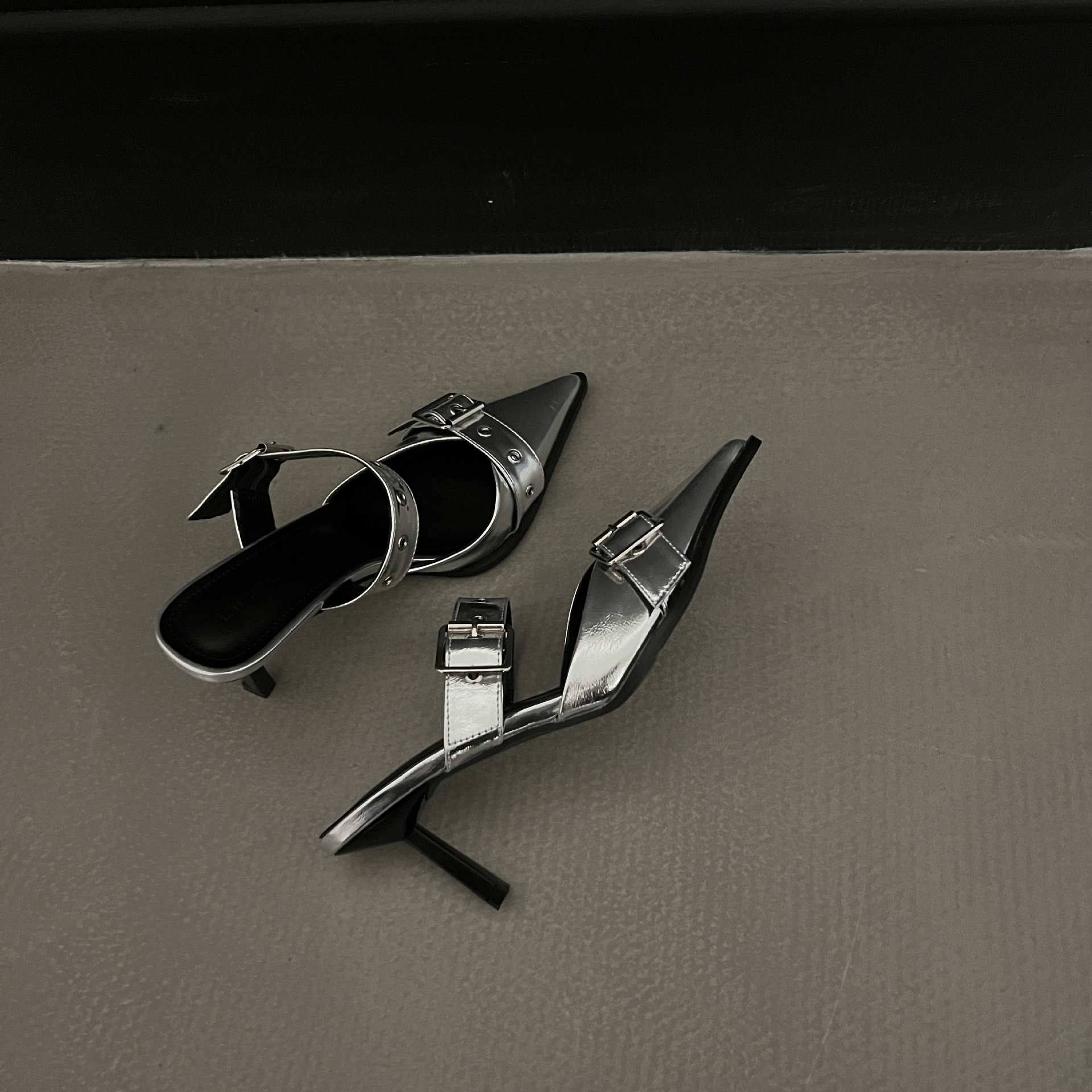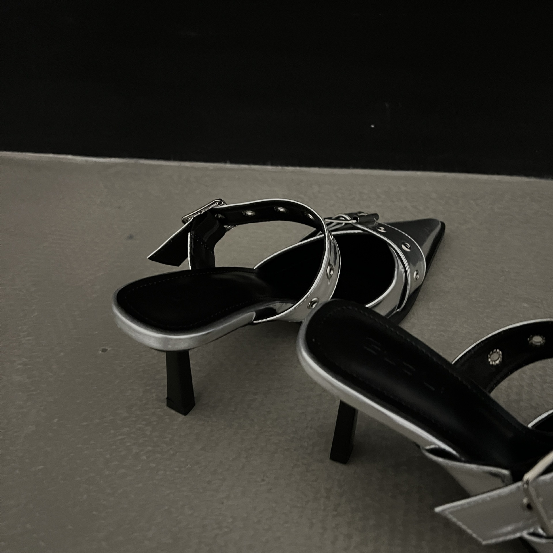 2023夏季~尖头皮带扣细跟皮带扣单鞋女欧美包头银色后空高跟凉鞋