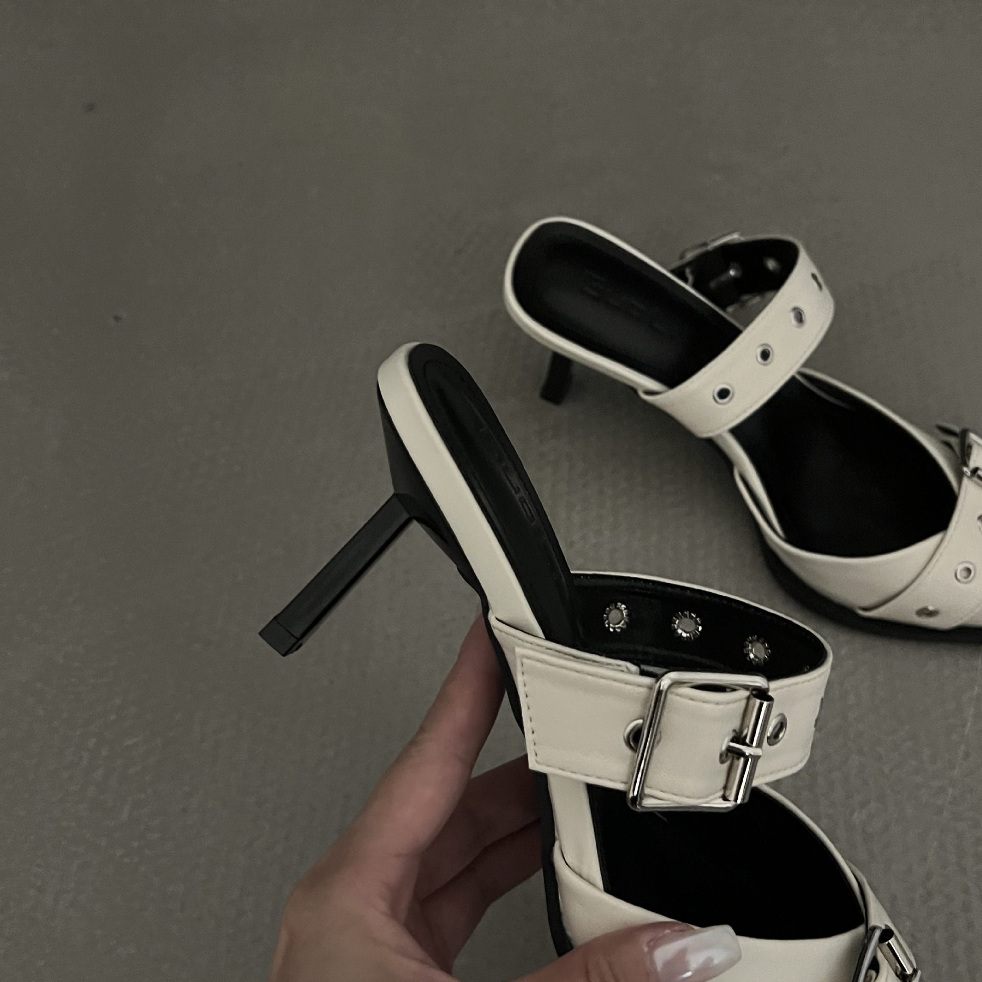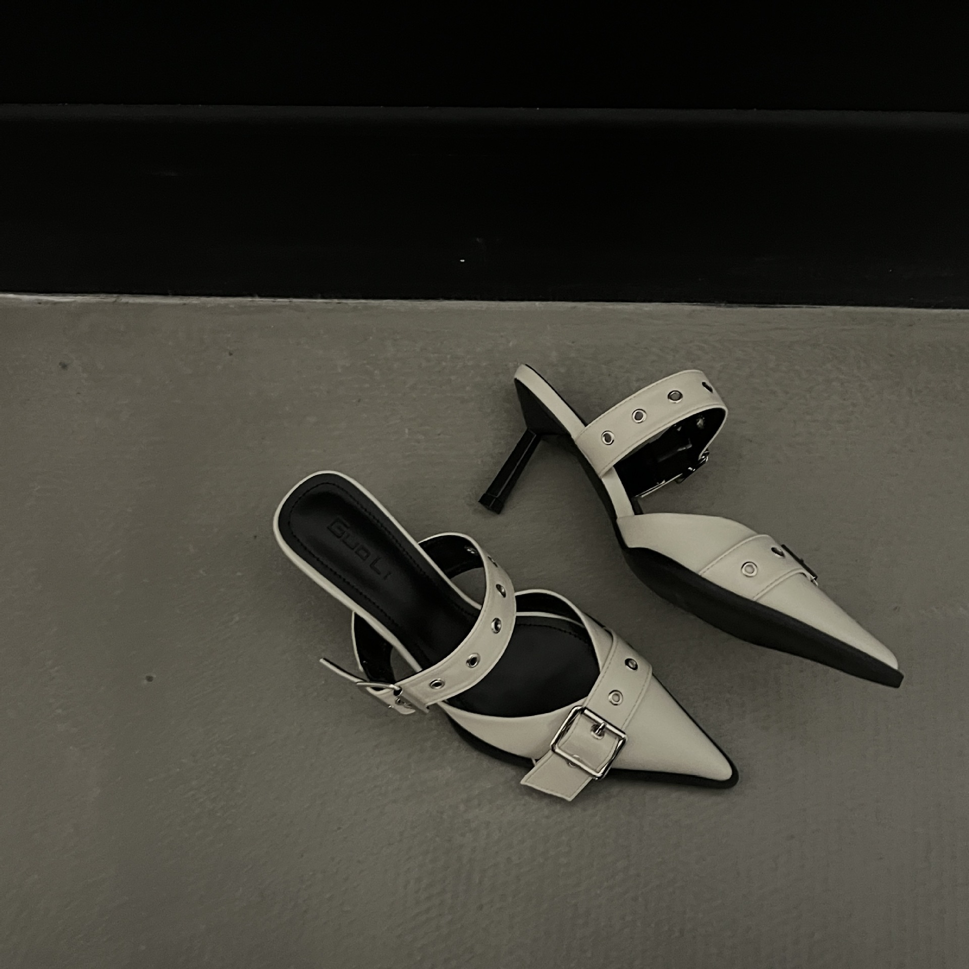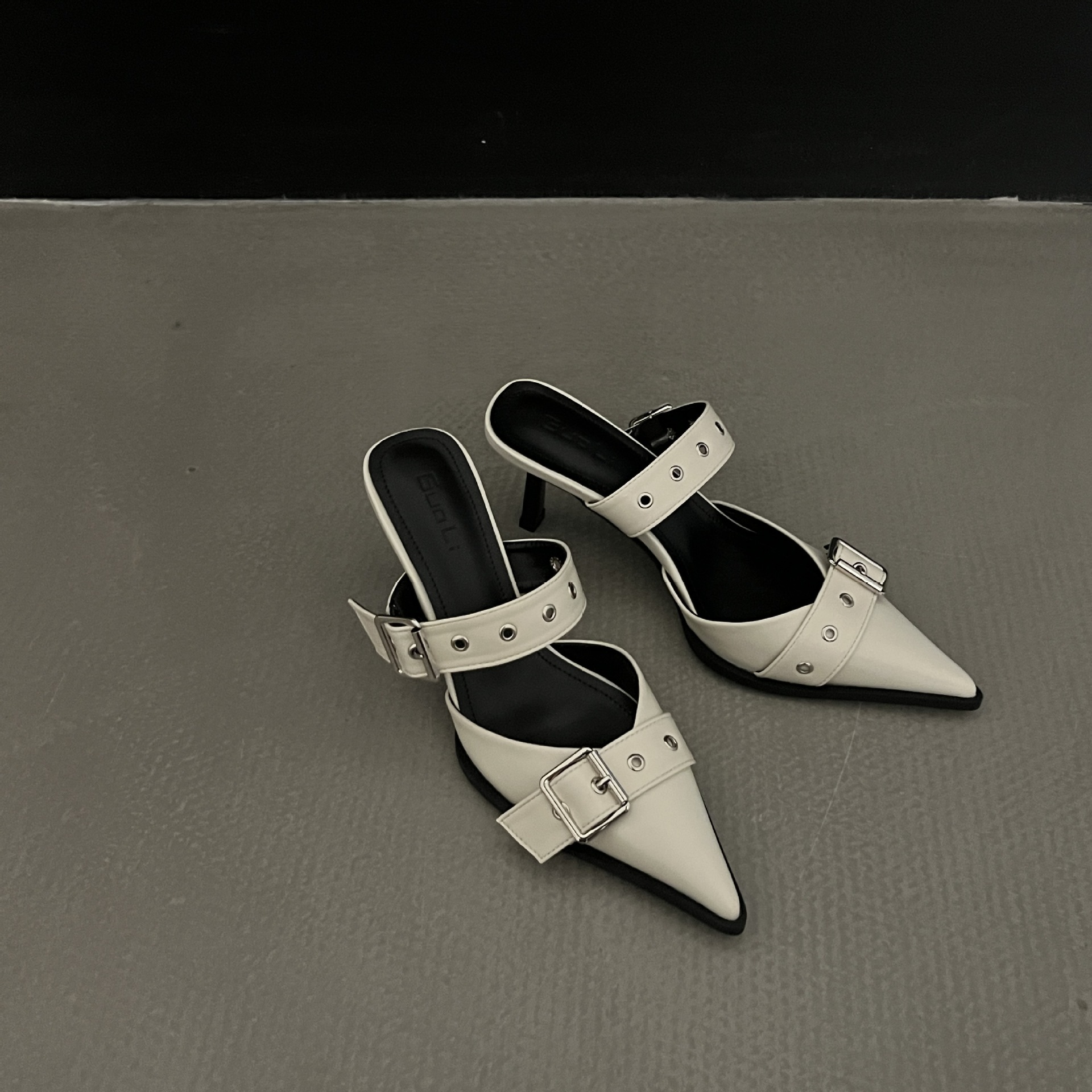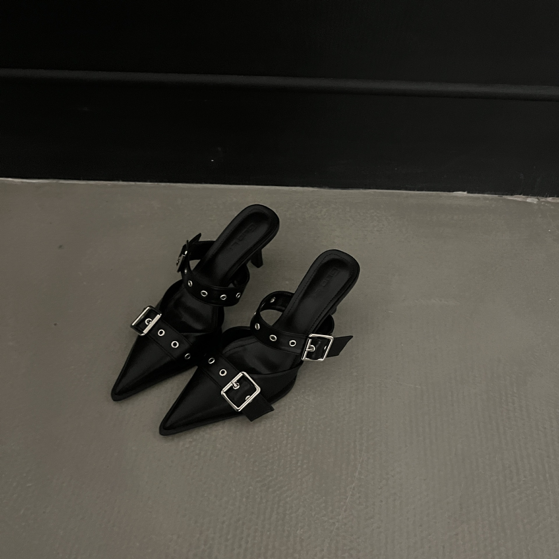 2023夏季~尖头皮带扣细跟皮带扣单鞋女欧美包头银色后空高跟凉鞋