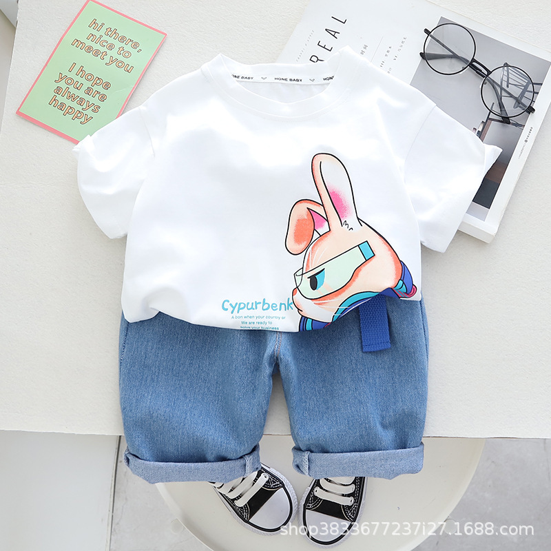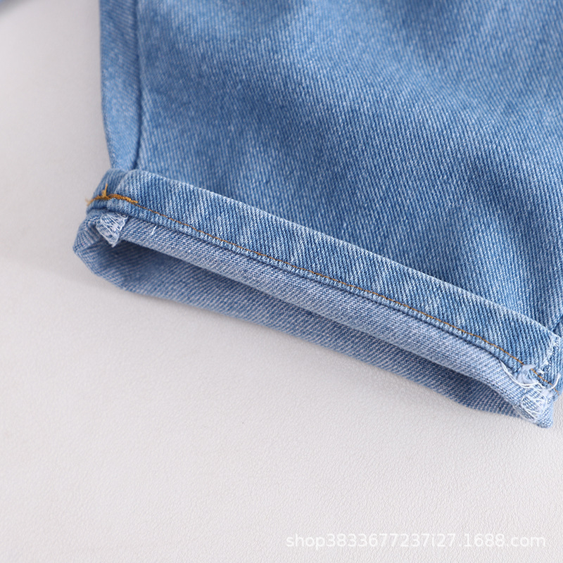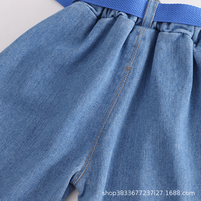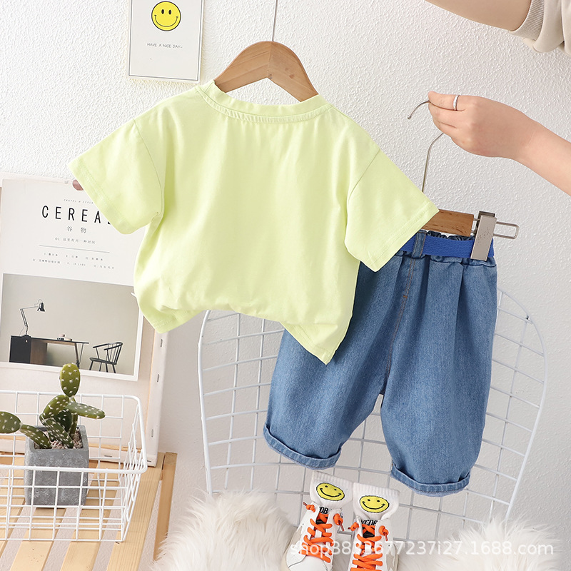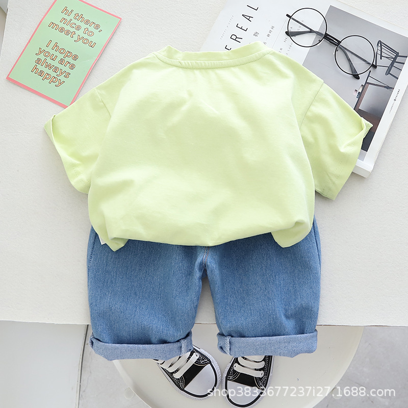여름 외국 스타일 옷 아기 소녀 여름 반팔 데님 자른 바지 세트 어린이 남성 의류 머리카락의 세대