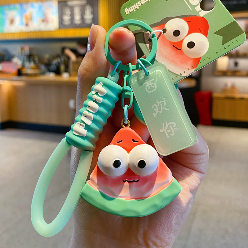 여성을위한 원래 나무 조각 스타일 재미 있은 과일과 야채 시리즈 키 체인 크리 에이 티브 눈 깜박이는 수박 파마늘 키 체인 학교 가방 펜던트스토어 가기