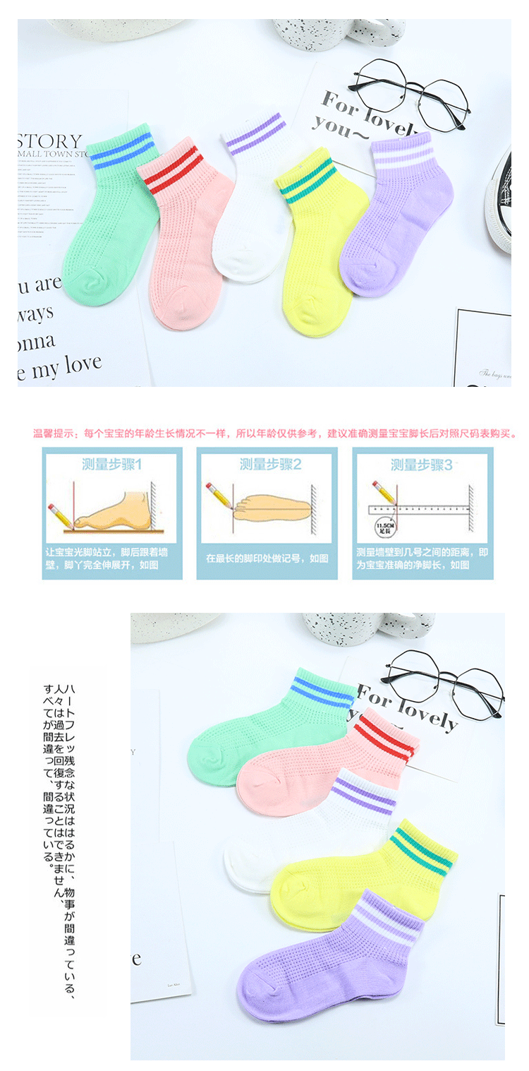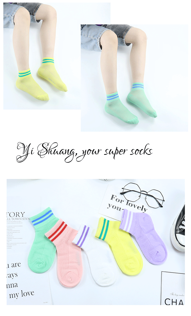 Yi Shuang 어린이 양말 여름 새로운 대형 그물 초박형 한국 줄무늬 짧은 양말 빗질 면 소녀 스포츠 면 양말