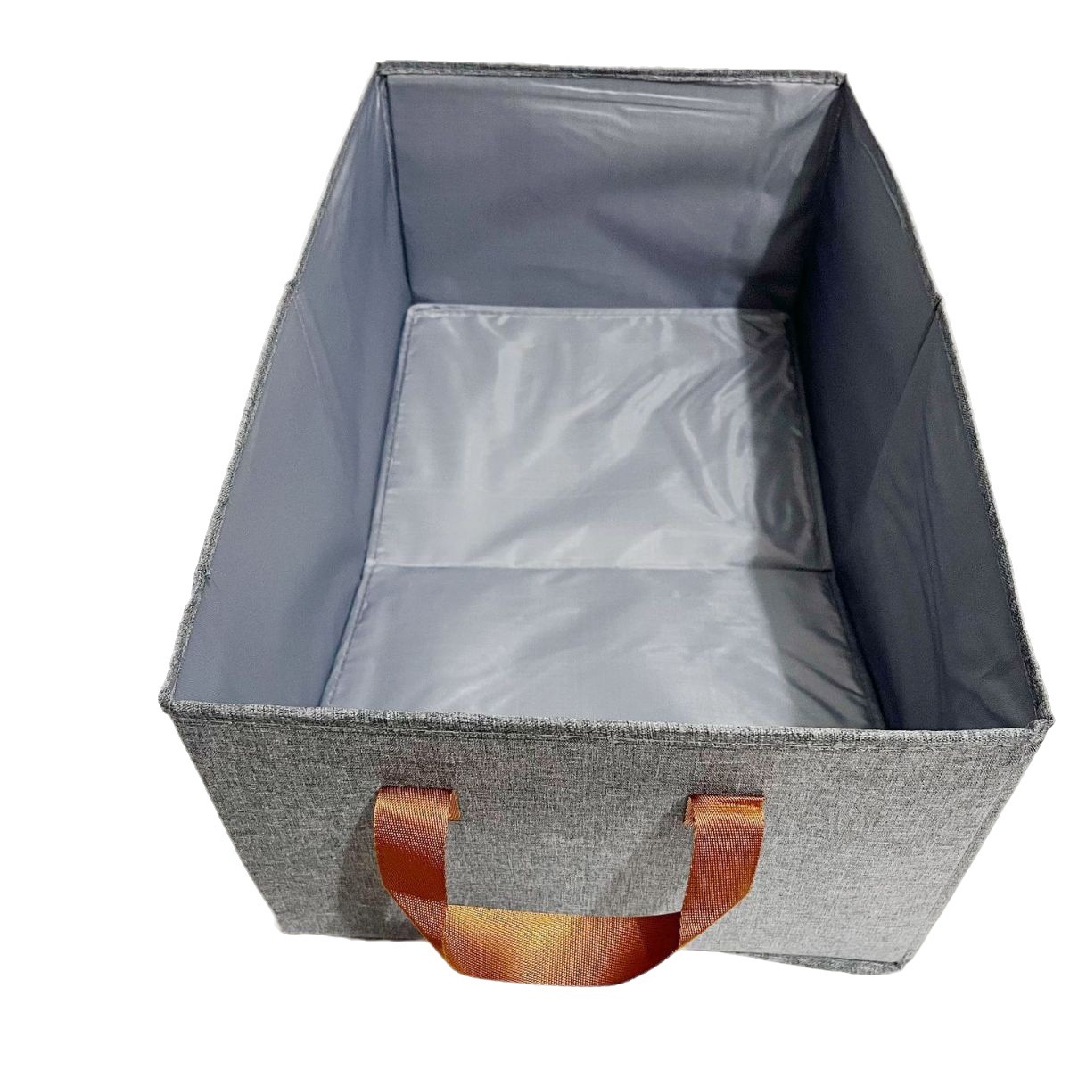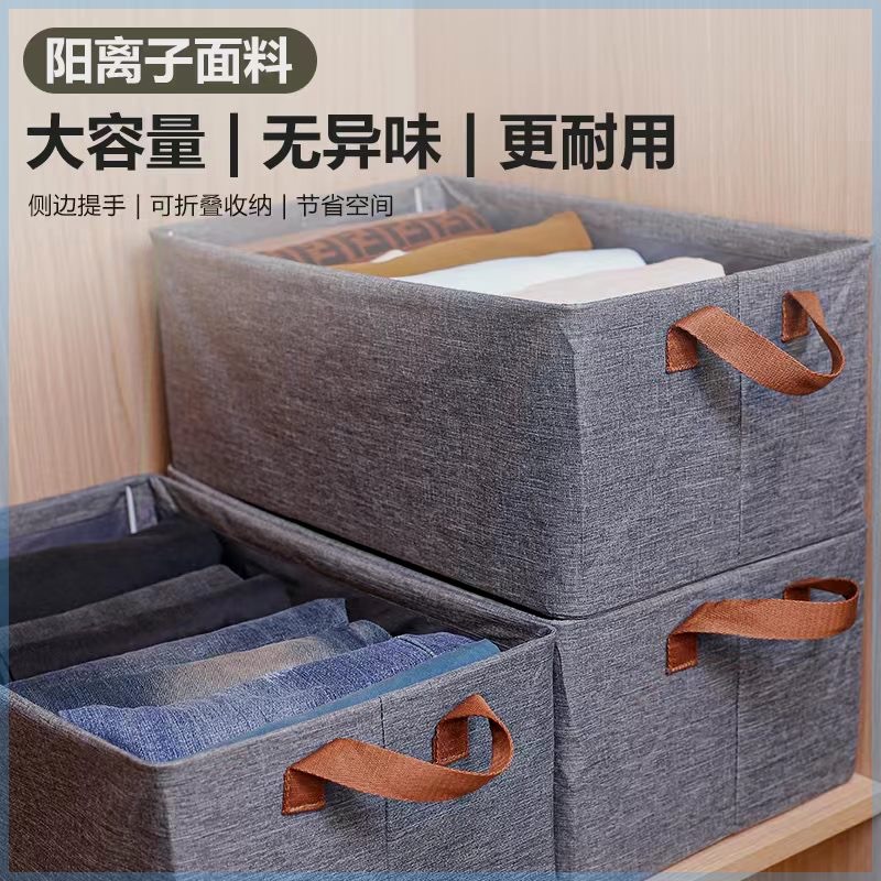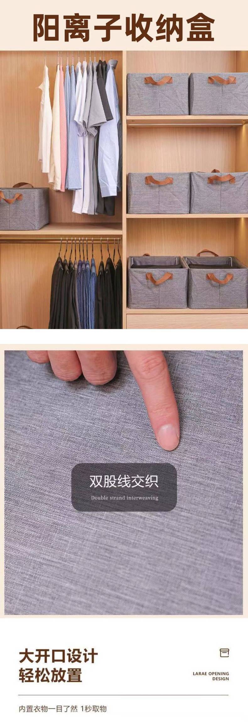 阳离子收纳盒,材料采用的是环保、易打理的、不易被磨损、抗静电、防晒、洗后易干的的上等阳离子纤维面料,目前一个色,深灰色;无气味,里面喷塑钢架支撑,(也可以选择PP板支撑),平时放衣柜收纳整理衣物整齐;或放于室内其它地方整理收纳生活杂物,使整个室内干净整洁舒适;不用时可以折叠存放,节省室内空间;优点是价格很便宜实惠,性价比高,经济耐用,实用方便,价廉物美!