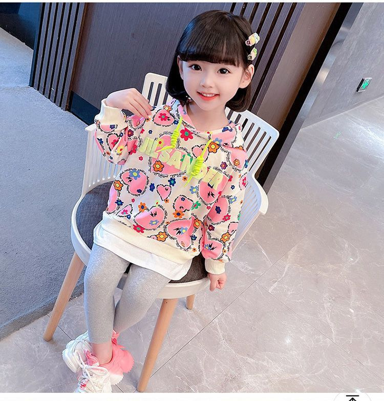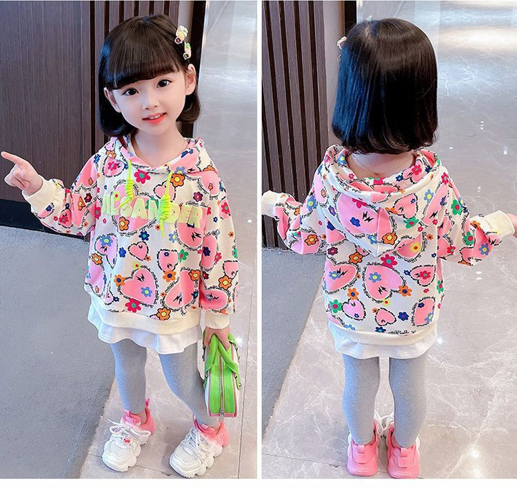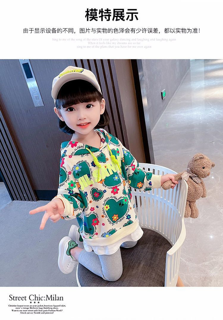 여아 세련된 세트 봄과 가을 2023 새로운 한국 스타일 아동 캐주얼 후드 스웨터 그물 연예인 아기 투피스 세트스토어 가기