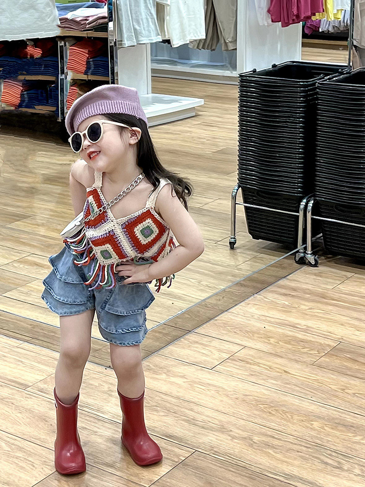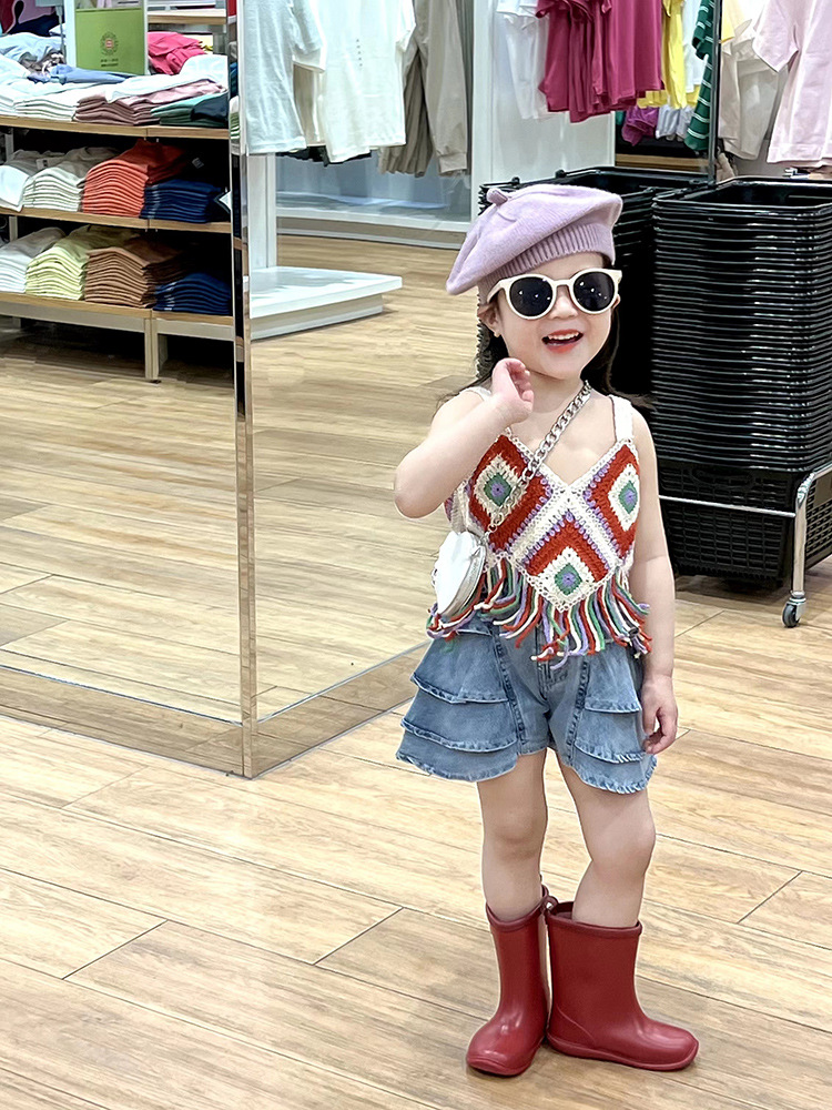 소녀의 세트 중공 니트 짧은 술 캐미솔 에스닉 스타일 탑 얇은 케이크 반바지 투피스 세트
