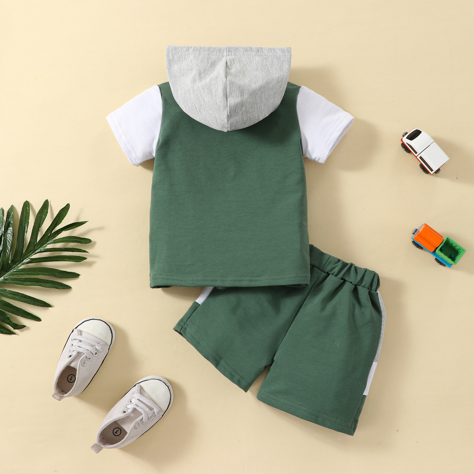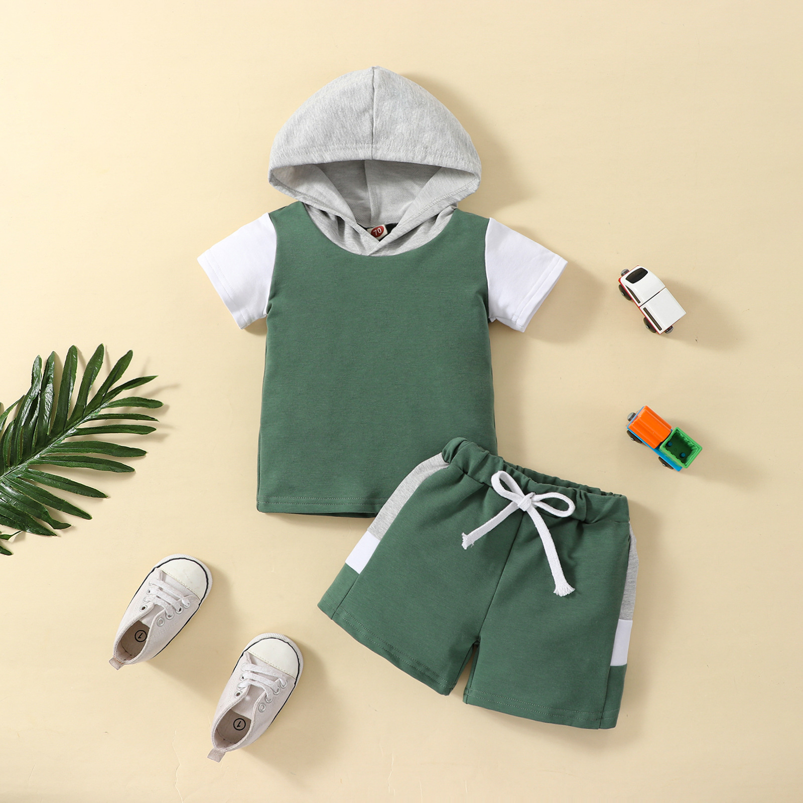 레저 스포츠 컬러 패치 워크 짧은 소매 후드 재킷 + 머리카락의 세대를 세트 탄성 허리 반바지스토어 가기