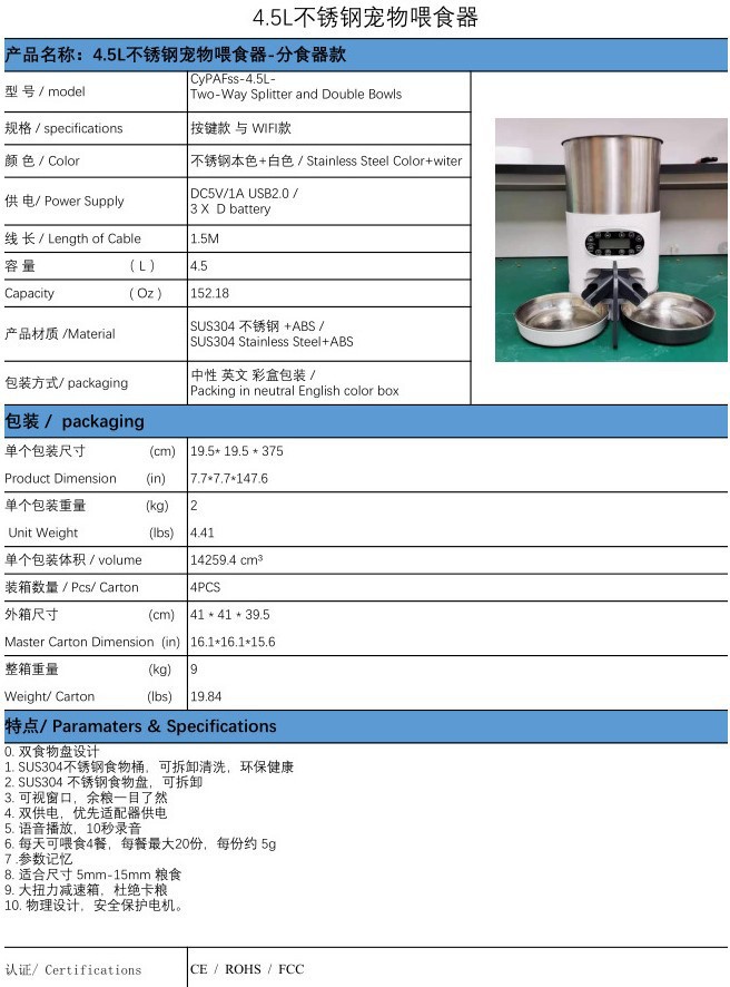 애완 동물 피더 고양이 스테인레스 스틸 수유 개 타이밍 기록 WIFI4.5L 더블 식사 크로스 보더 아마존스토어 가기