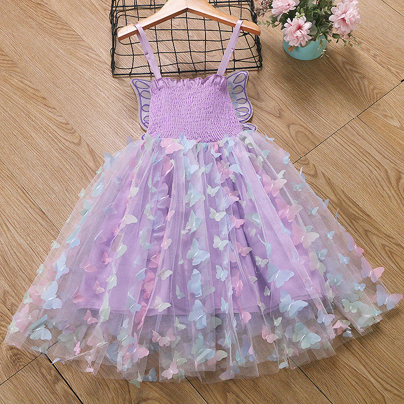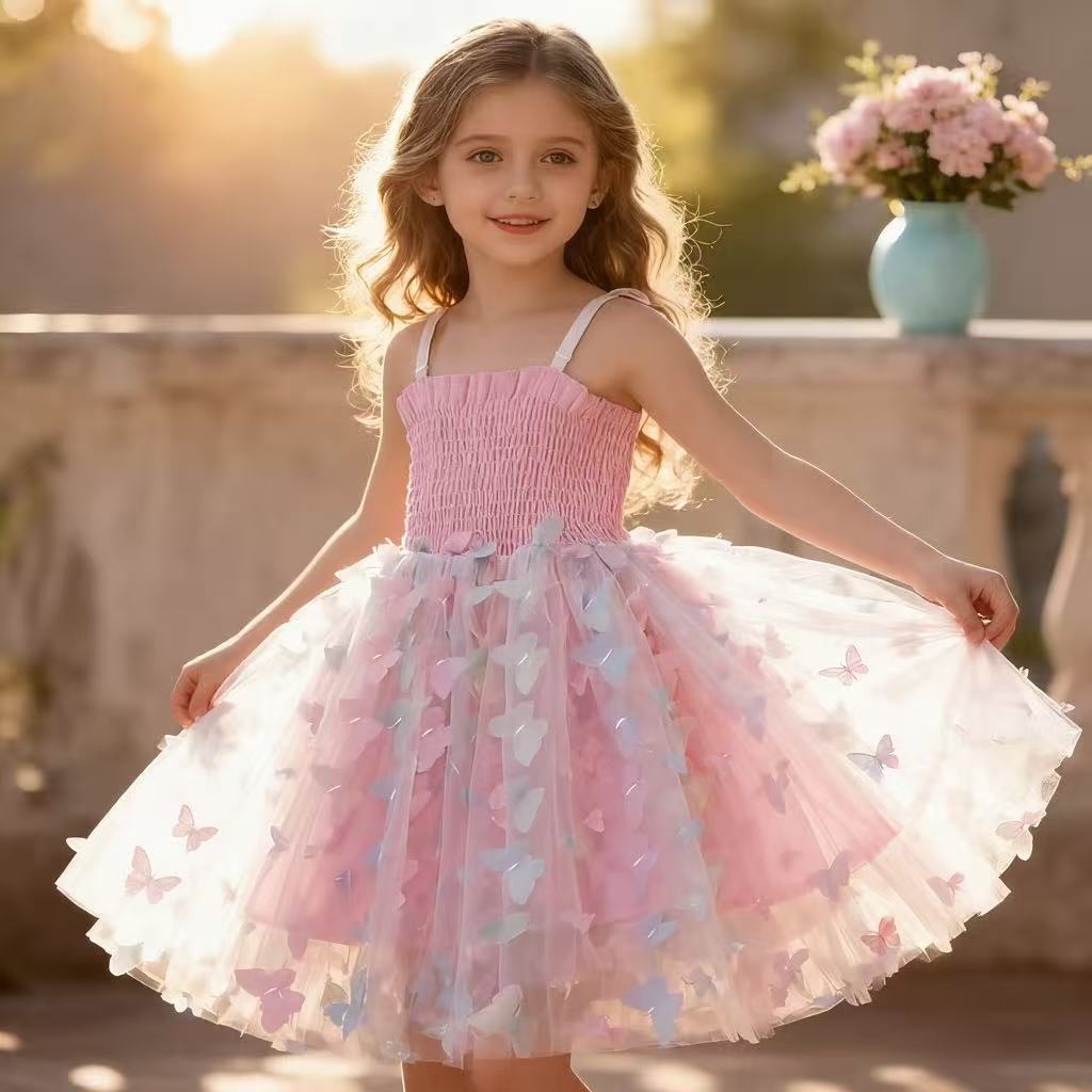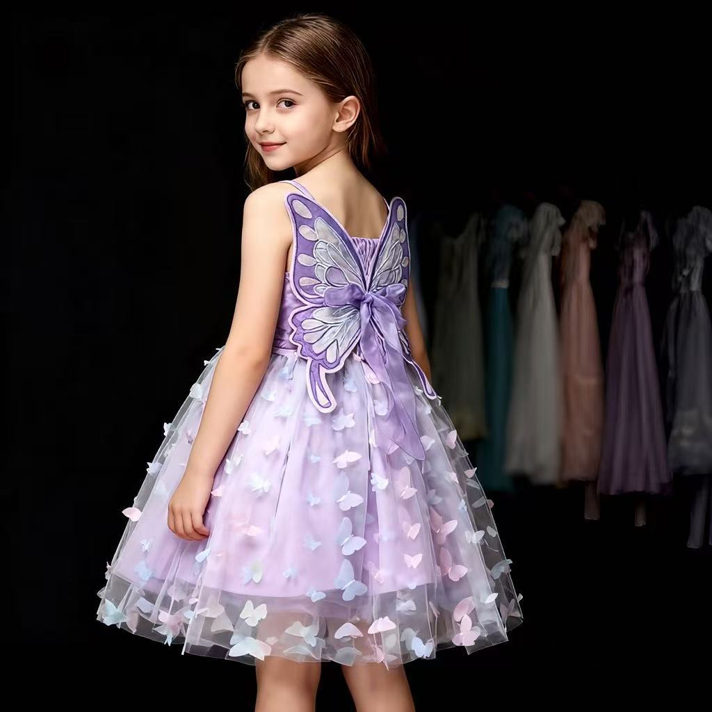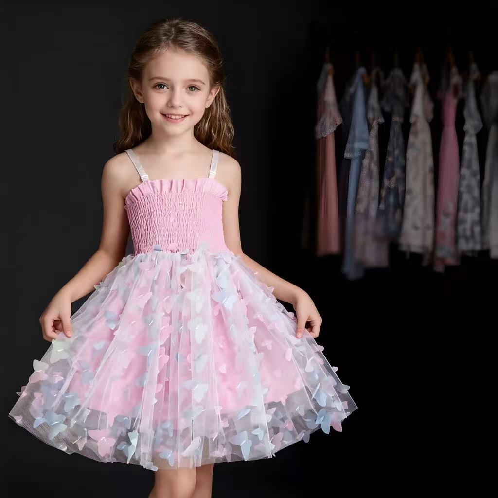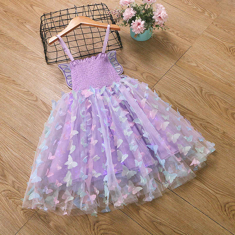 귀여운 크로스보더 순면 어린이 스커트, 나비 스트랩 망사 스커트, 여자아이 드레스, 컬러풀한 조명, 얼음과 눈의 공주 드레스스토어 가기