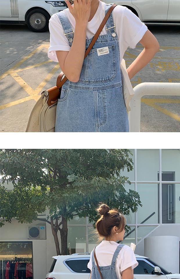 한국 스타일 포켓 데님 스트랩 원피스 여자의 새로운 도착 복고풍 느슨한 캐주얼 모든 경기 간단한 슬리밍 짧은 원피스스토어 가기