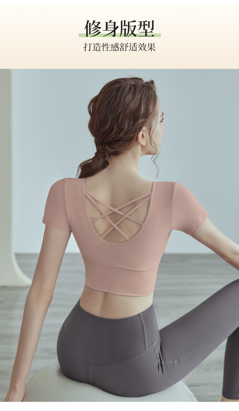 요가 의류 여성의 2025 년 여름 가슴 패드 짧은 소매 스포츠 피트니스 훈련 의류 타이트 쇼트 탑 도매