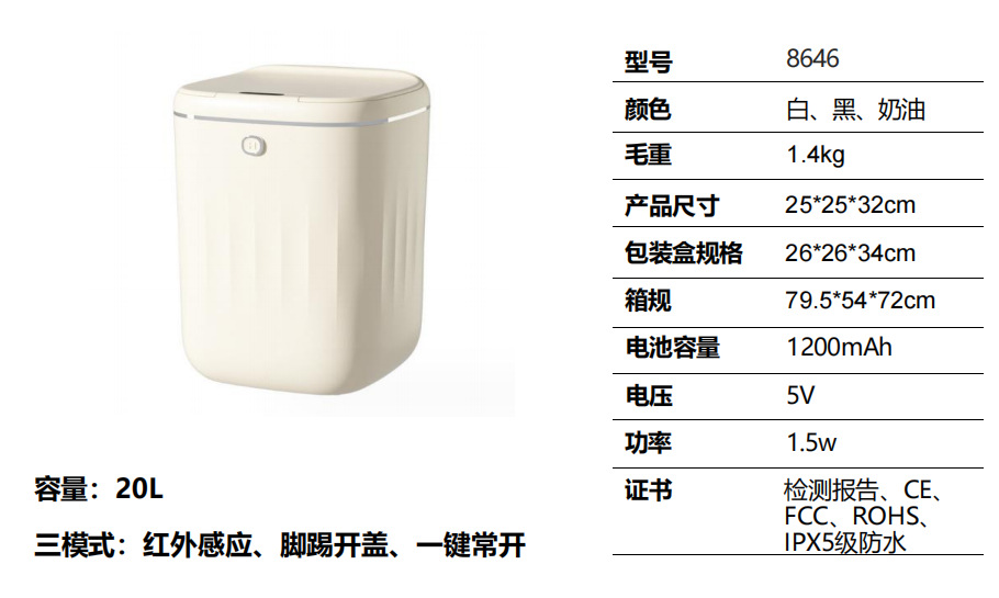 자동 지능형 조명 럭셔리 인덕션 쓰레기통 뚜껑 방수 가정용 거실 주방 전기 휴지통 2023 대형